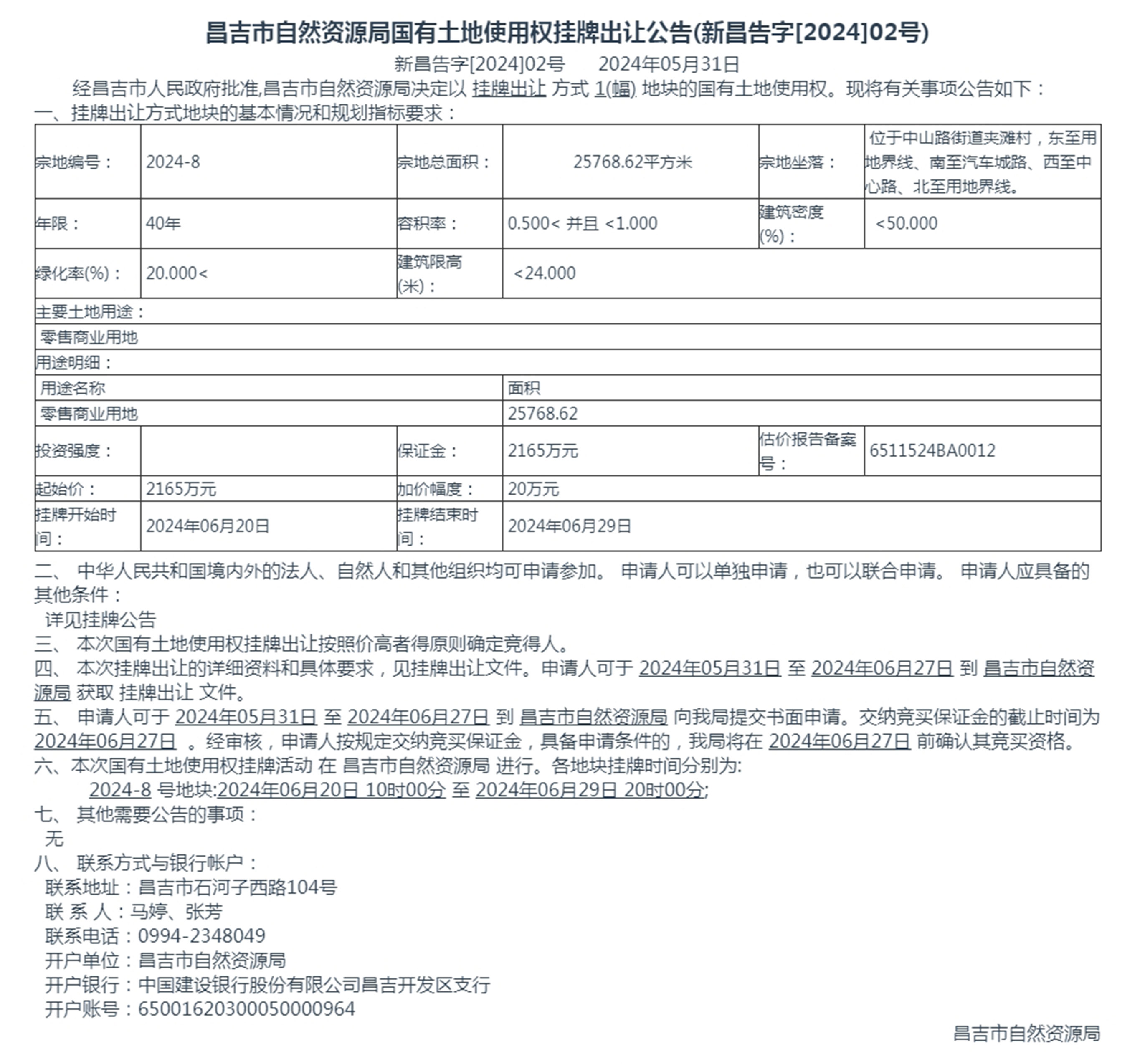 昌吉市自然资源局国有土地使用权挂牌出让公告(新昌告字[2024]02号)