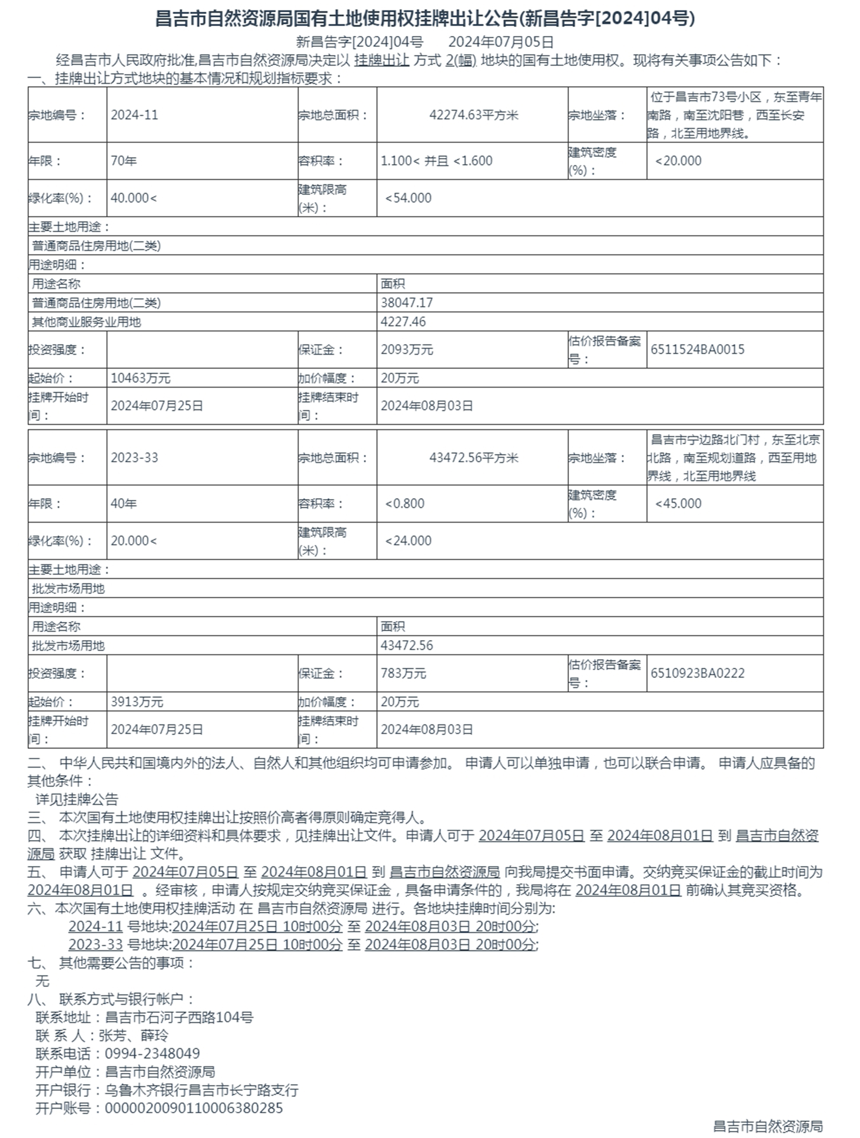 昌吉市自然资源局国有土地使用权挂牌出让公告(新昌告字[2024]04号)