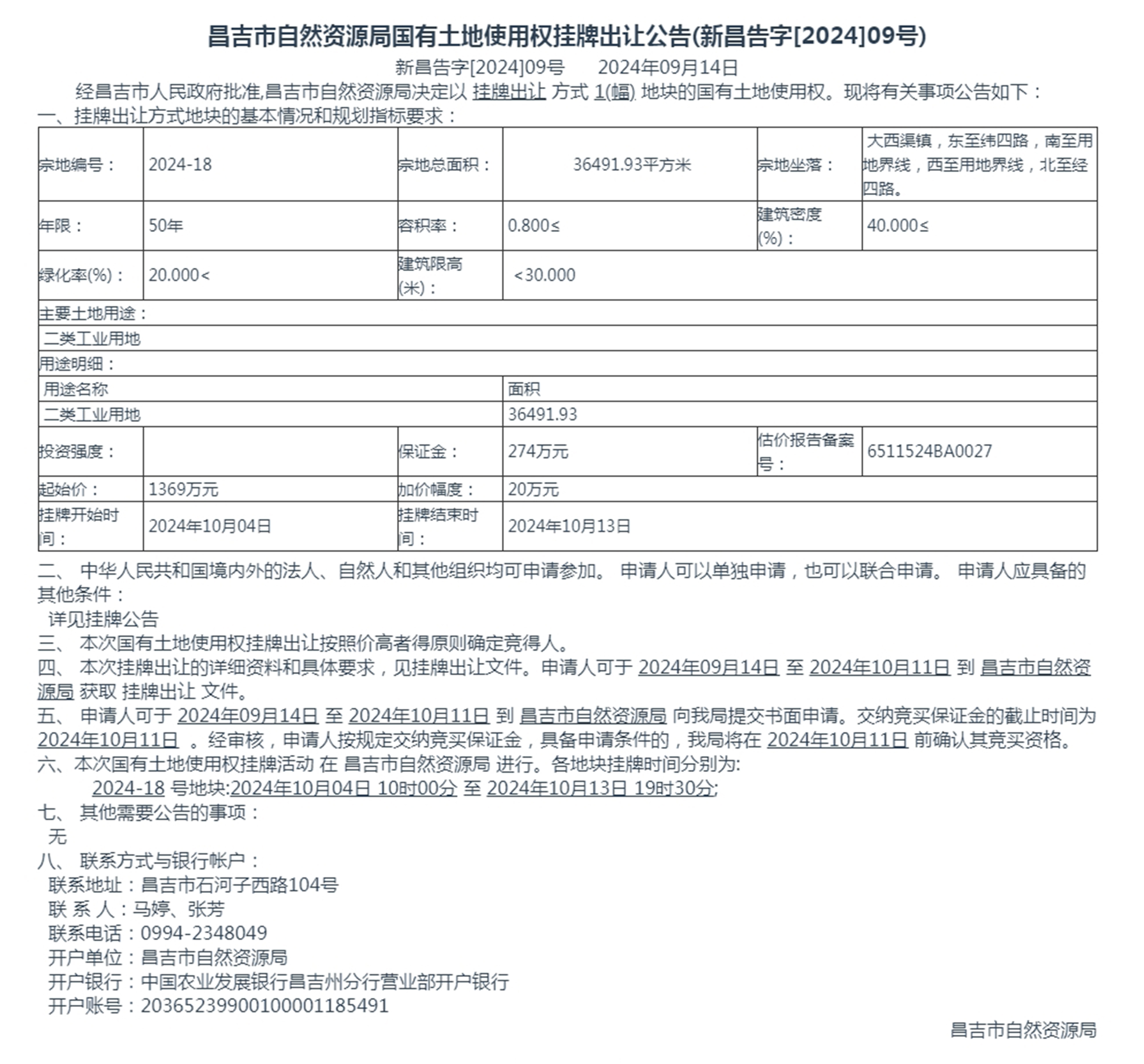 昌吉市自然资源局国有土地使用权挂牌出让公告(新昌告字[2024]09号)