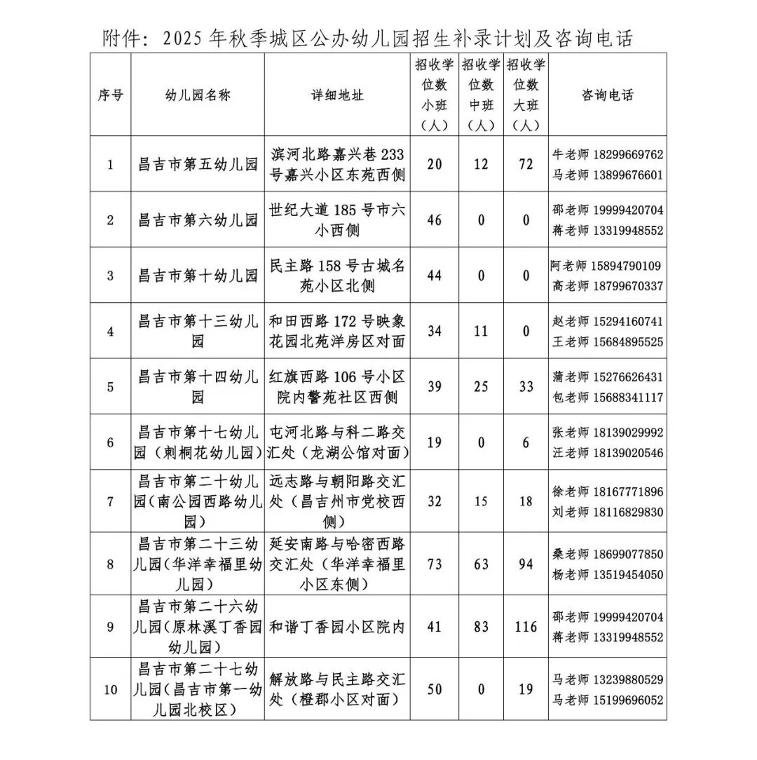 附件:2025年秋季公办幼儿园招生补录计划及咨询电话