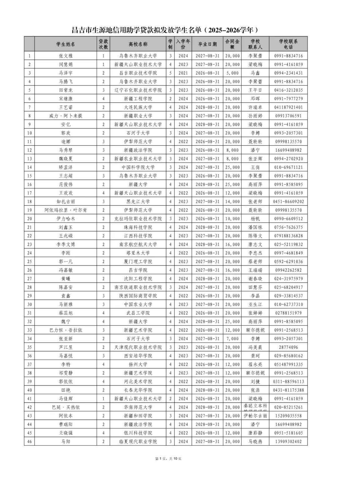 附件:昌吉市生源地信用助学贷款拟发放学生名单(2025-2026学年)
