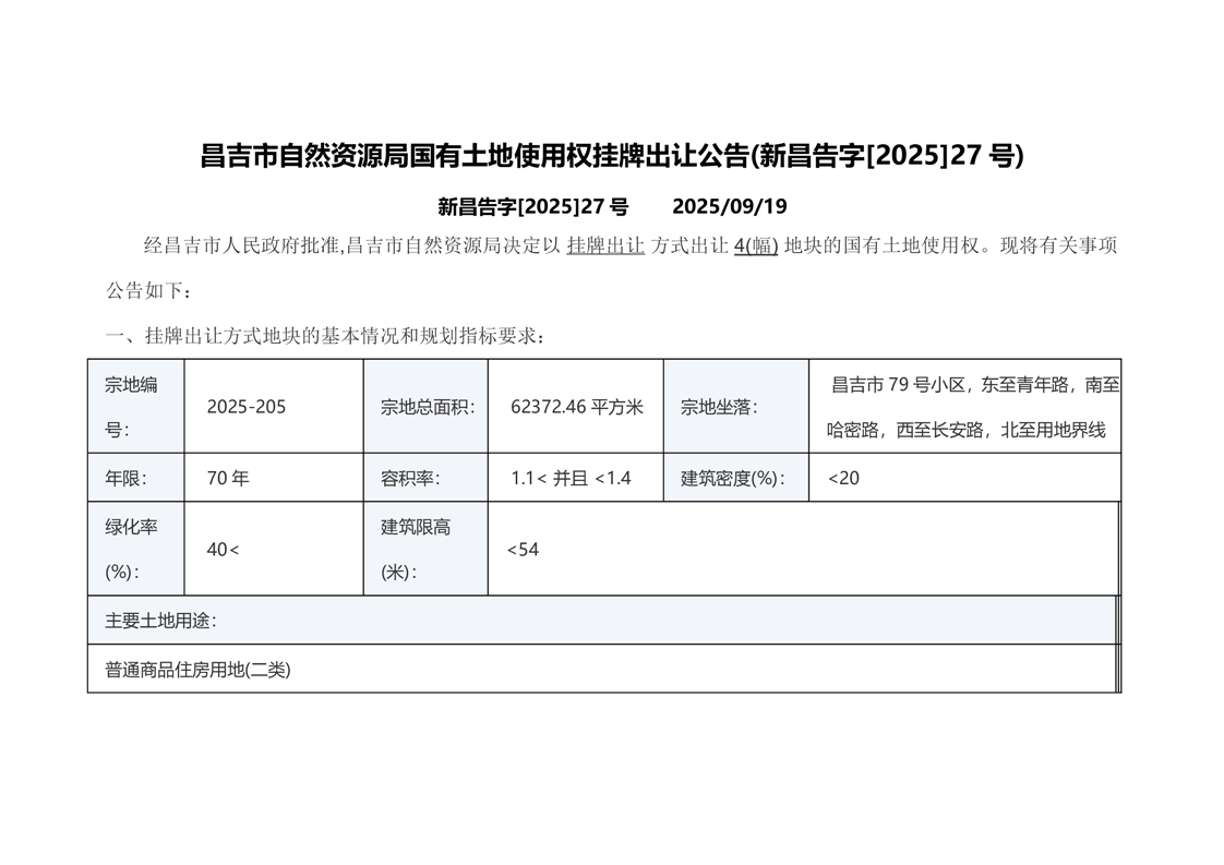 昌吉市自然资源局国有土地使用权挂牌出让公告(新昌告字[2025]27号)
