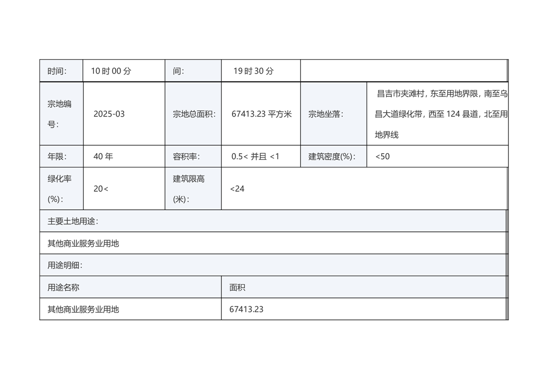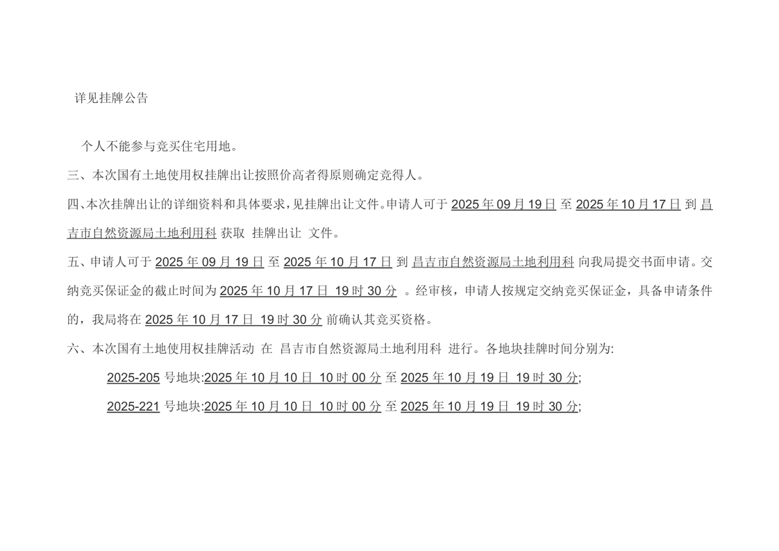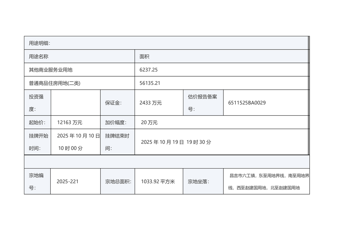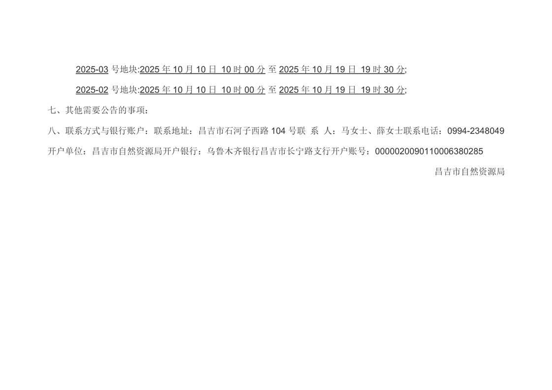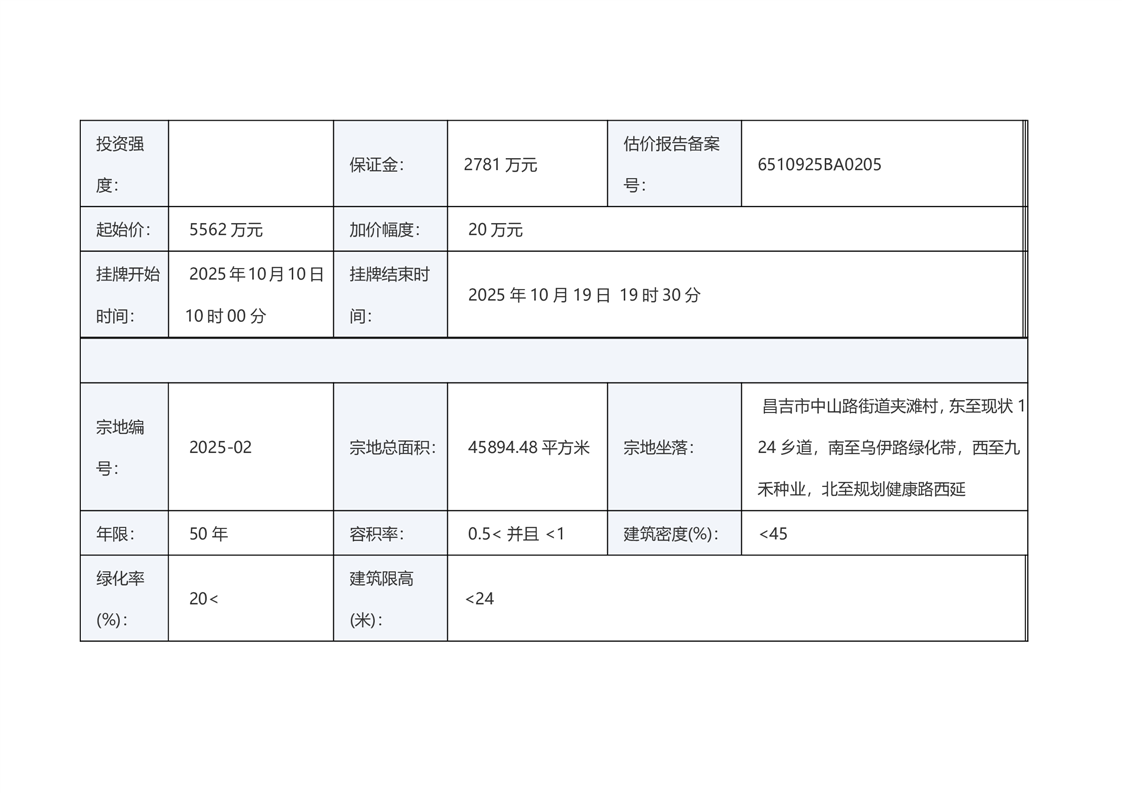 | 名 称 | 昌吉市自然资源局国有土地使用权挂牌出让公告(新昌告字[2025]27号) | ||