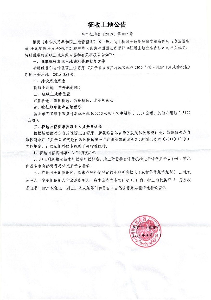 | 名 称 | 昌市征地告【2019】第002号 | ||