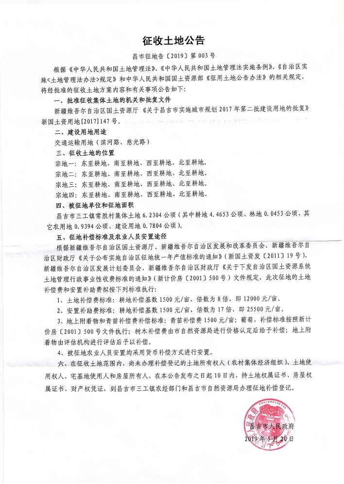 | 名 称 | 昌市征地告【2019】第003号 | ||