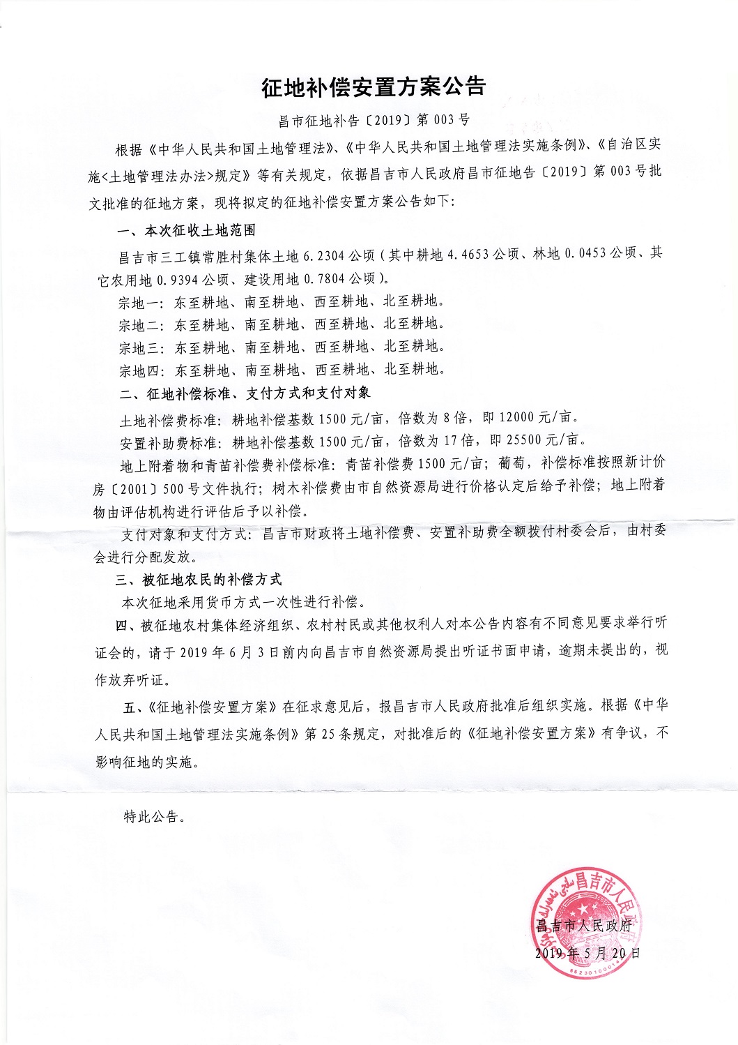 昌市征地补告【2019】第003号