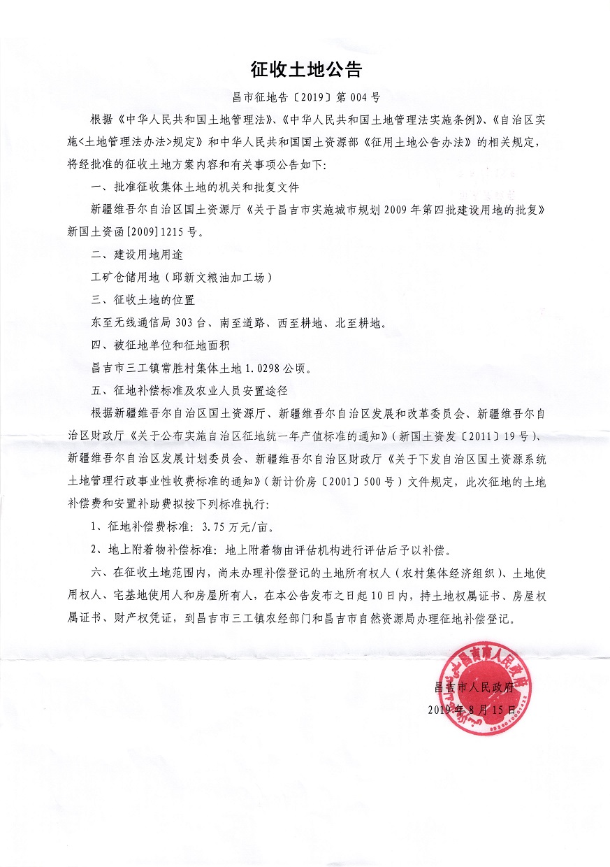 昌市征地告【2019】第004号