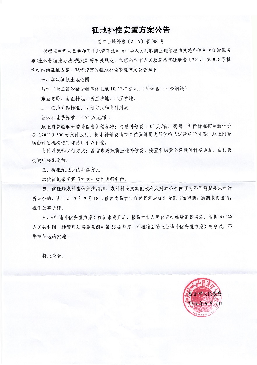 昌市征地补告【2019】第006号