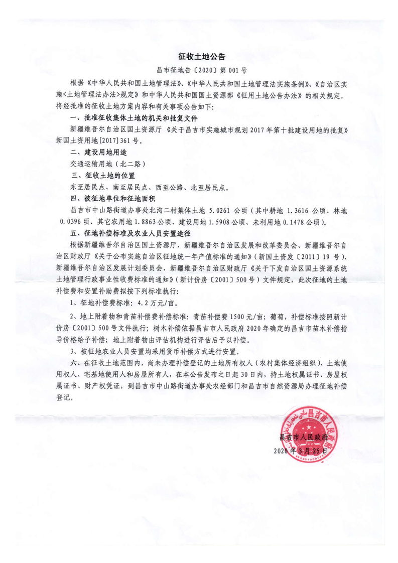 | 名 称 | 征收土地公告-昌市征地告【2020】第001号 | ||
