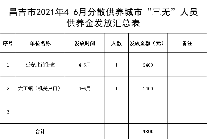 | 名 称 | 昌吉市2021年4-6月分散供养城市“三无”人员 供养金发放汇总表 | ||