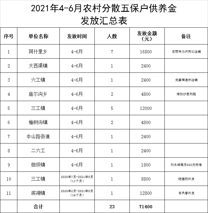 2021年4-6月农村分散五保户供养金 发放汇总表