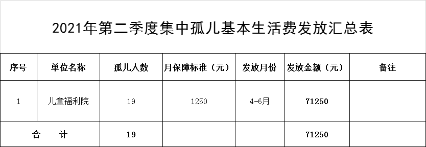 2021年第二季度集中孤儿基本生活费发放汇总表