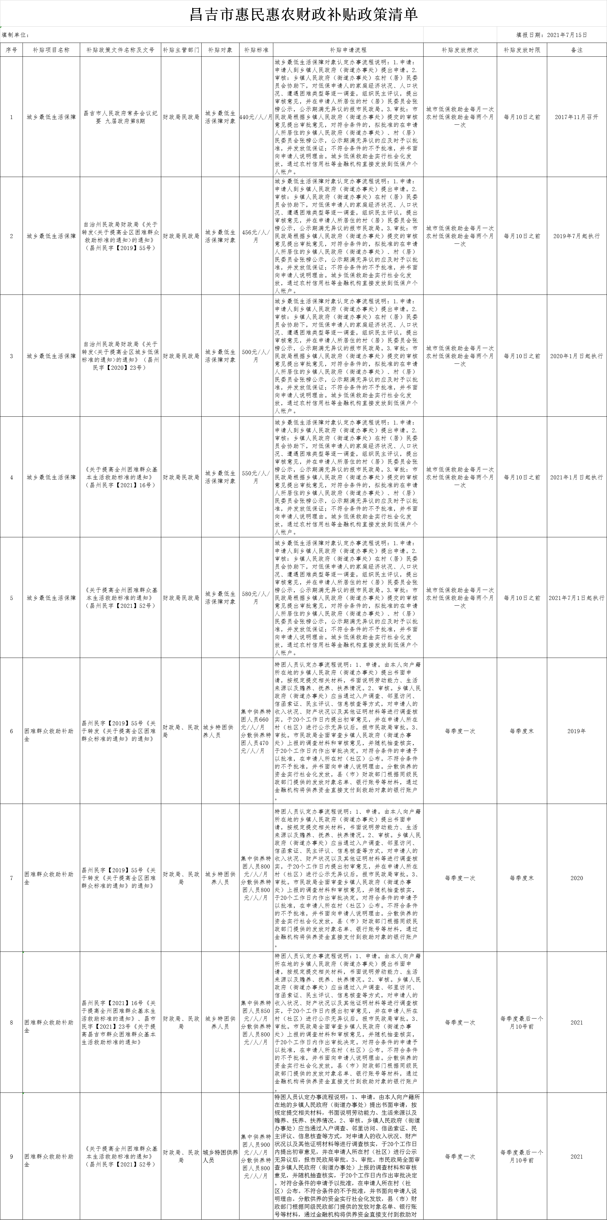 | 名 称 | 昌吉市惠民惠农财政补贴政策清单(新调整社会救助类) | ||