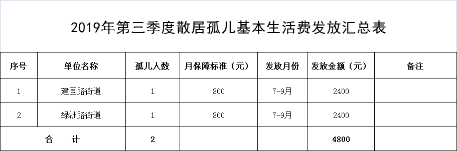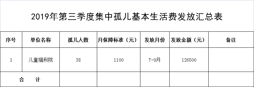 2019年第三季度孤儿基本生活费发放汇总表