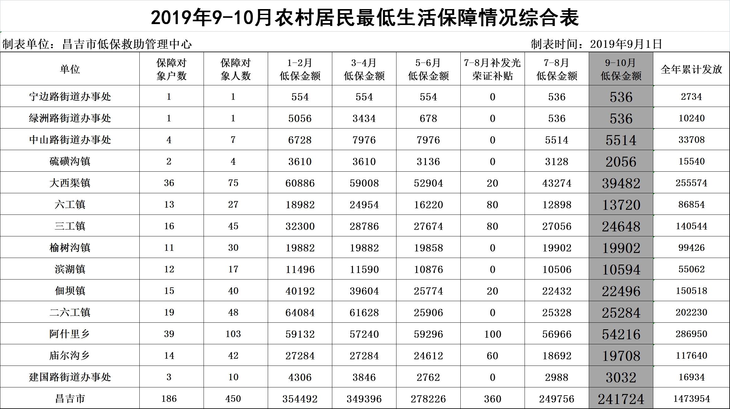 | 名 称 | 2019年9-10月农村居民最低生活保障情况综合表 | ||