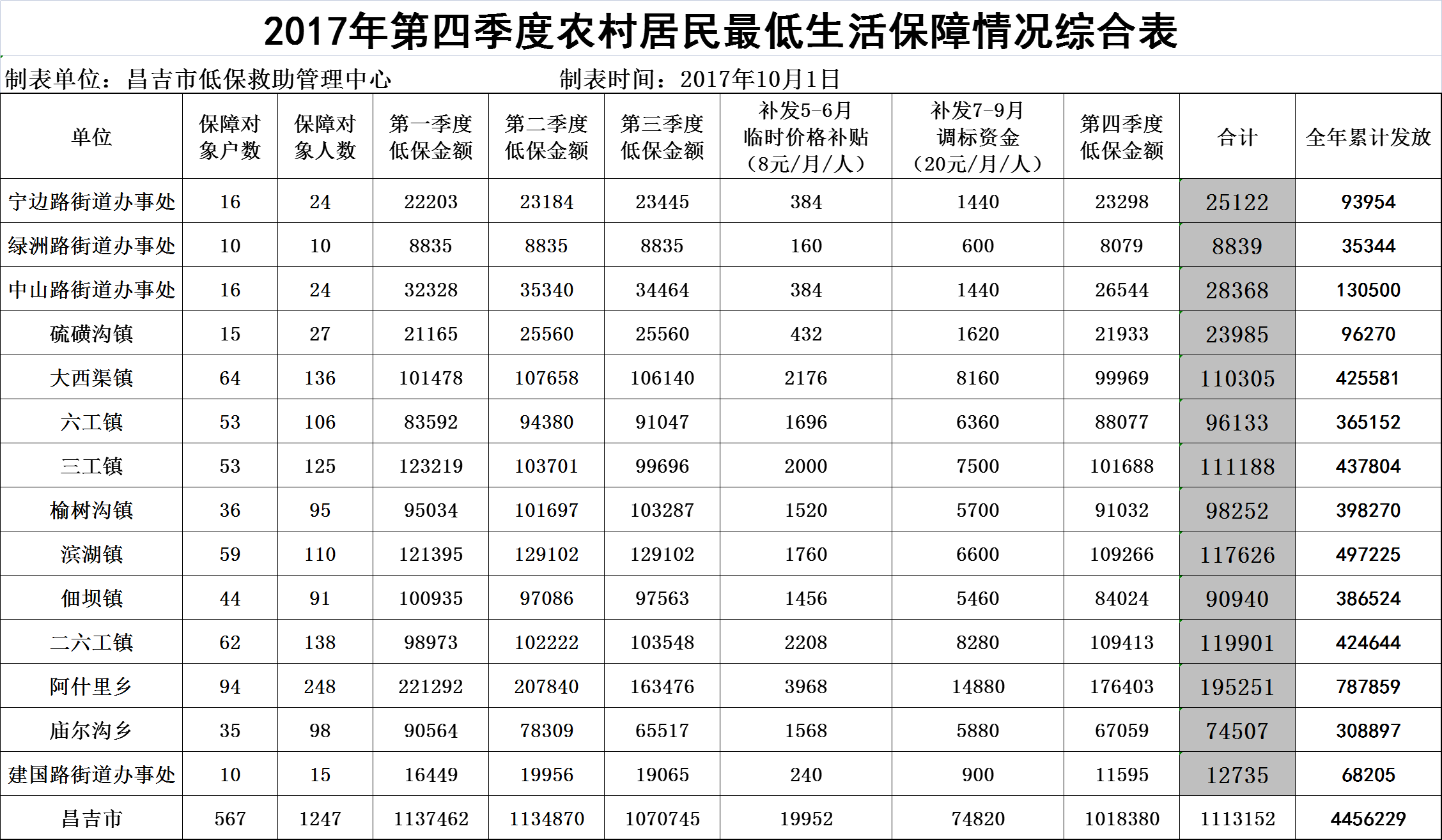 2017年第四季度农村居民最低生活保障情况综合表