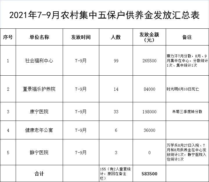 2021年7-9月农村集中五保户供养金发放汇总表