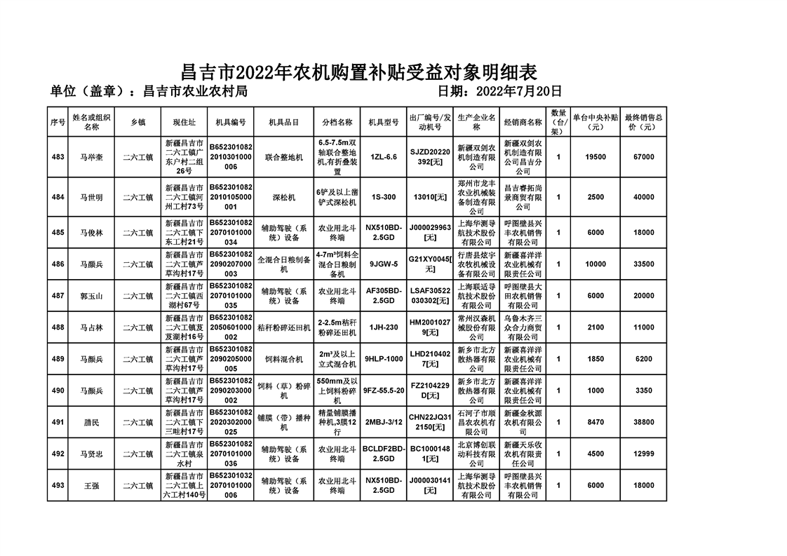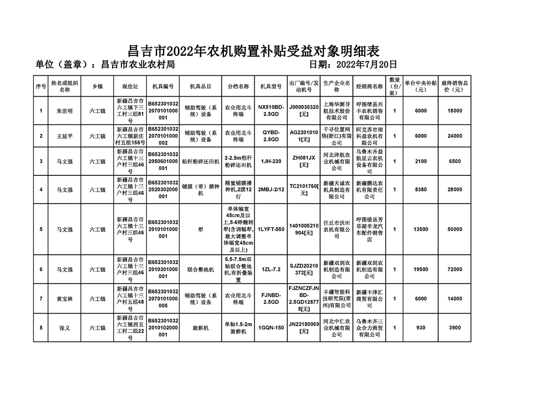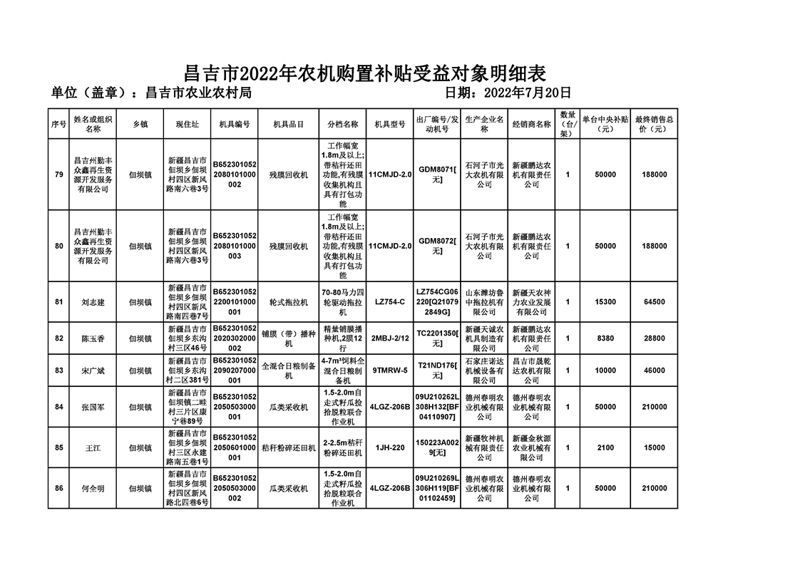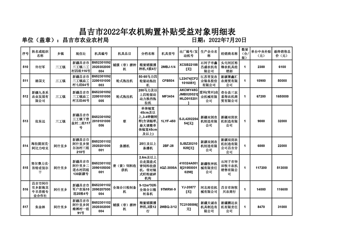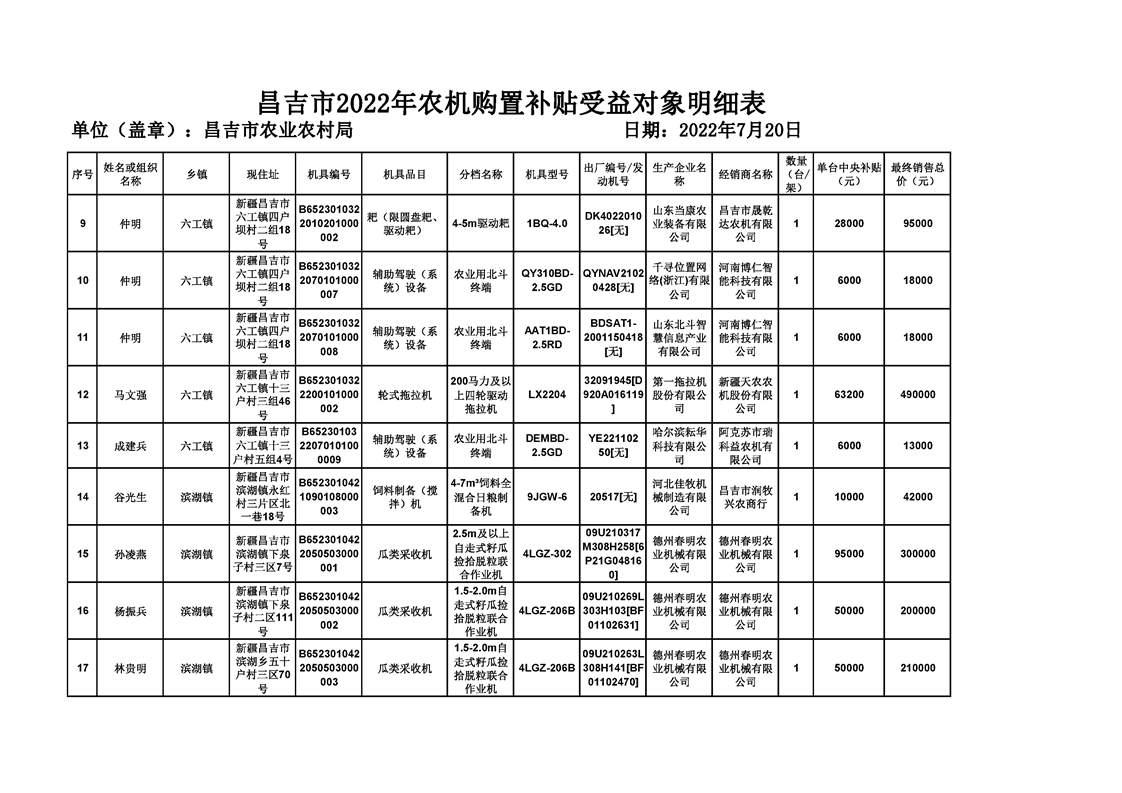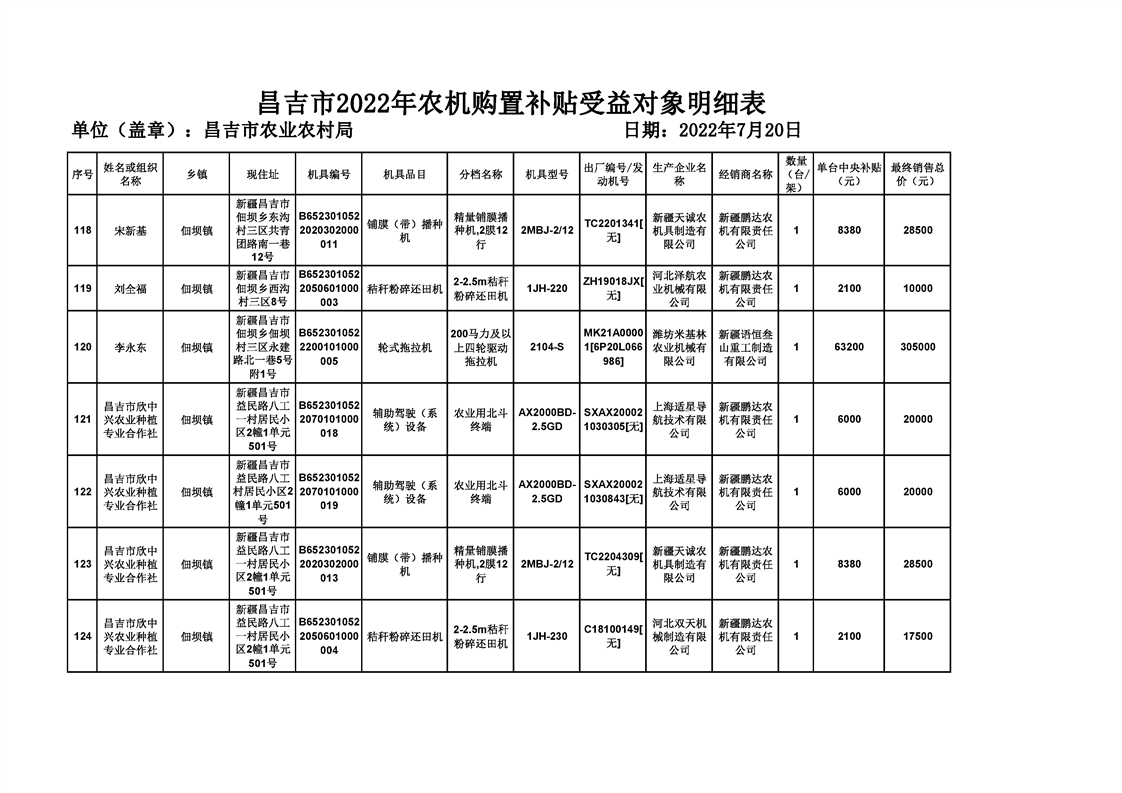 昌吉市2022年国家农机购置补贴受益对象汇总表