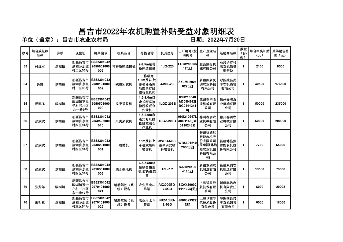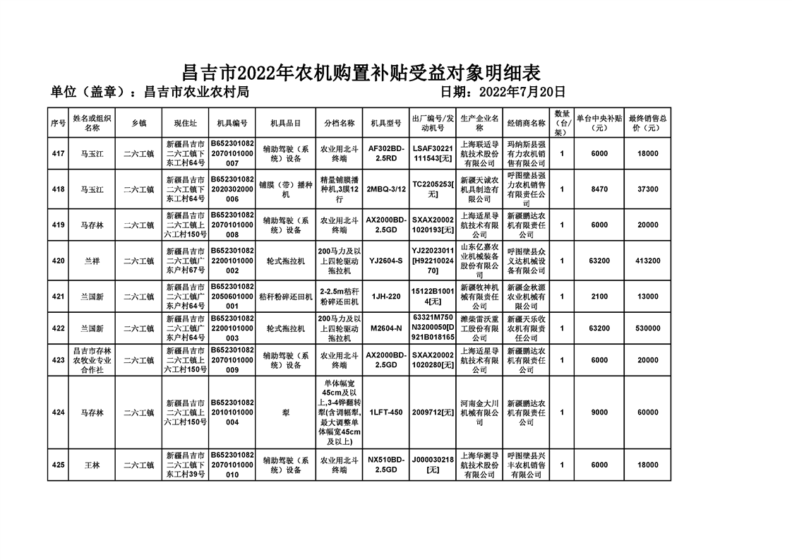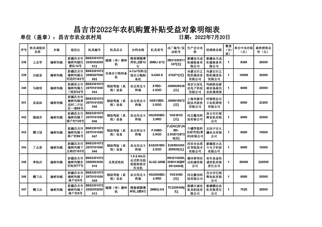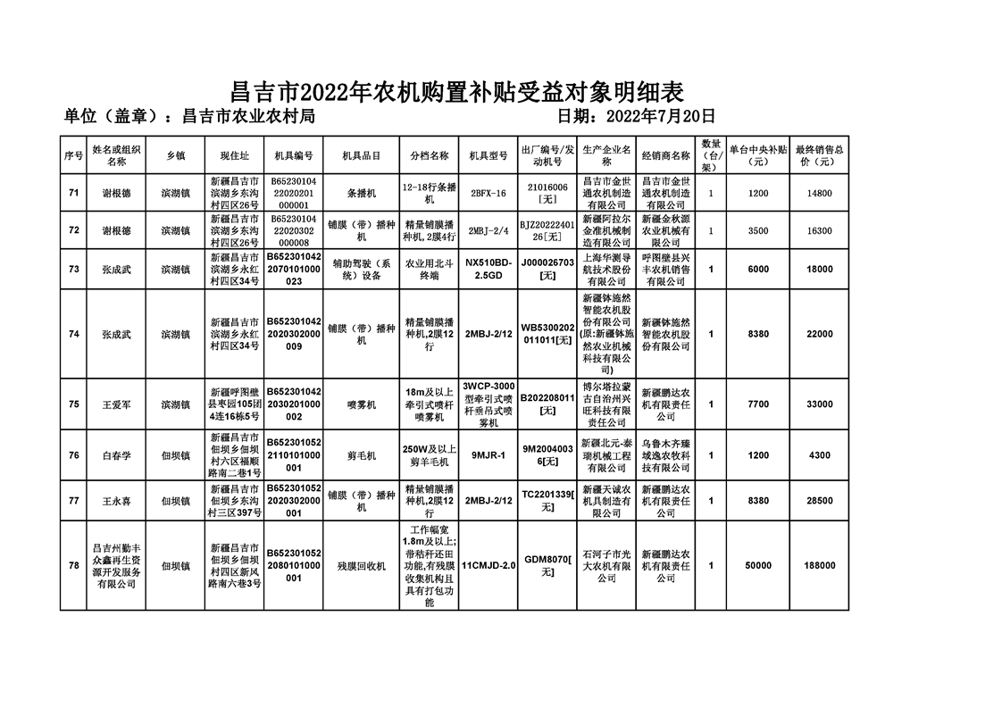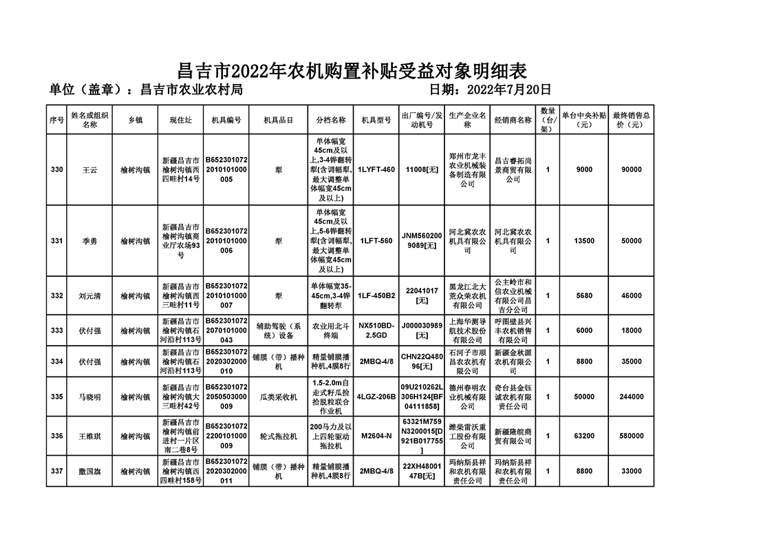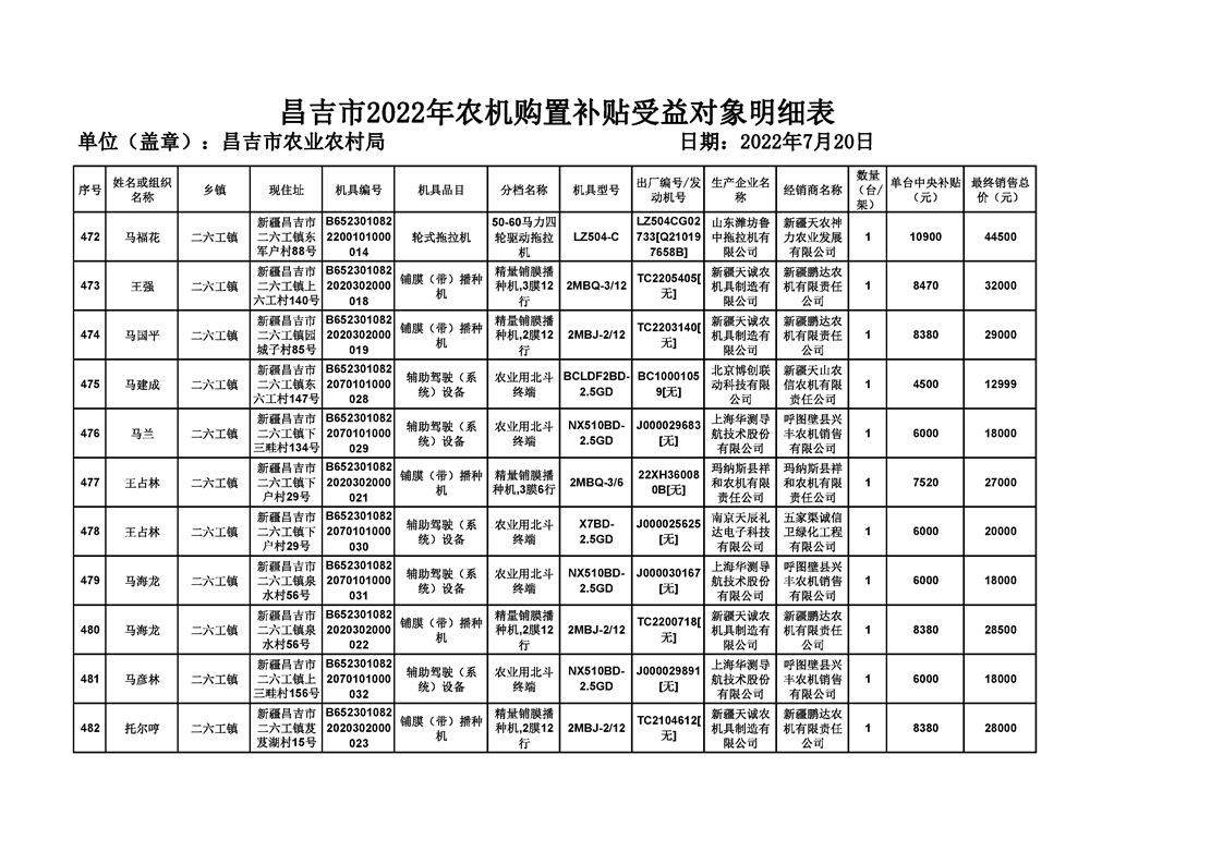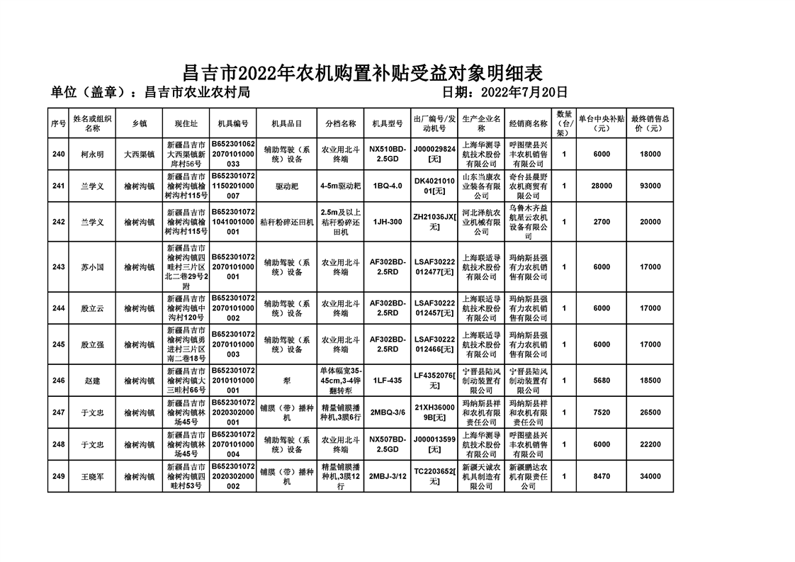 昌吉市2022年国家农机购置补贴受益对象汇总表