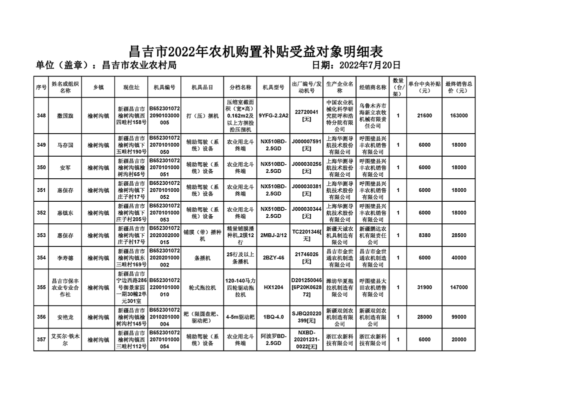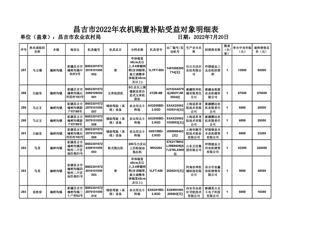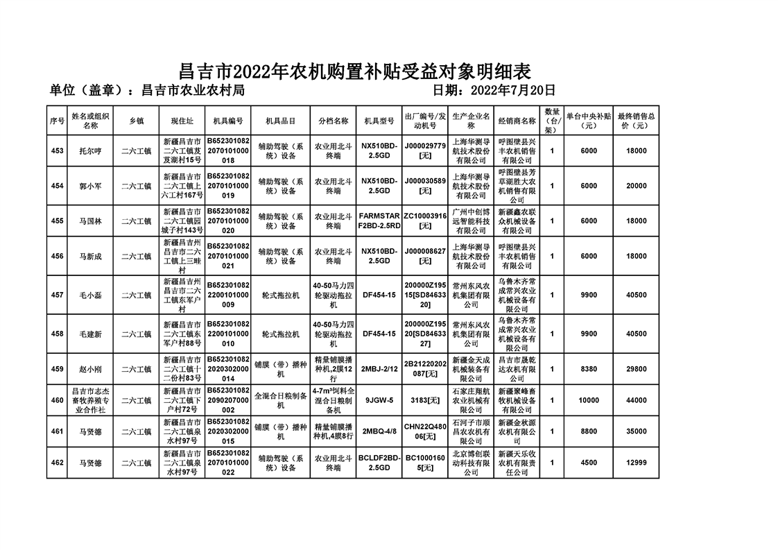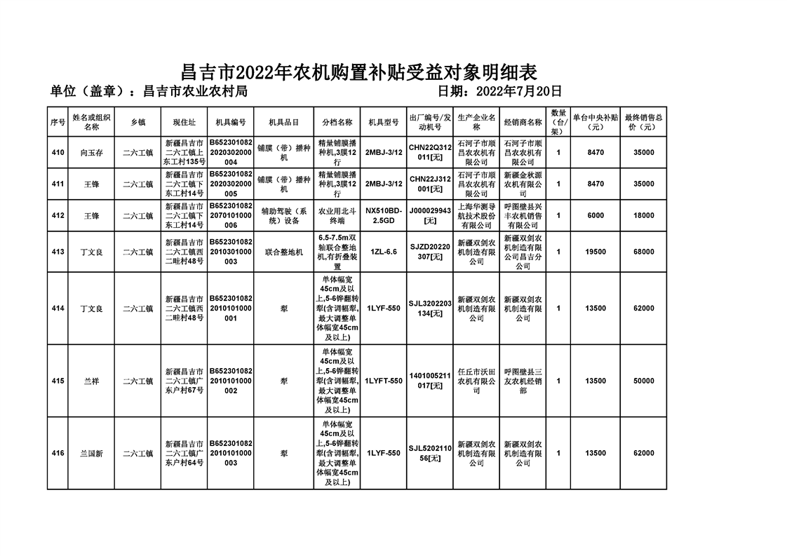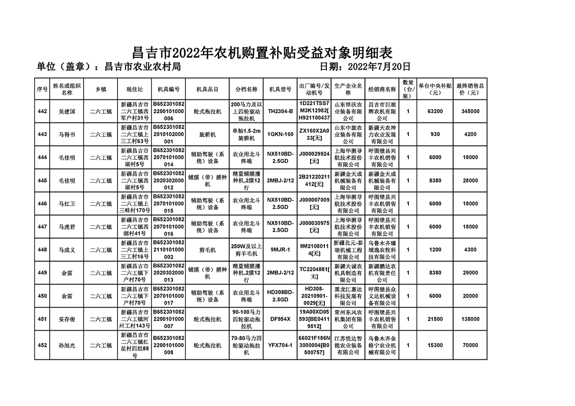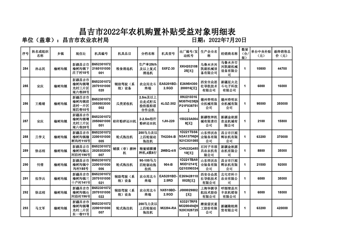 昌吉市2022年国家农机购置补贴受益对象汇总表
