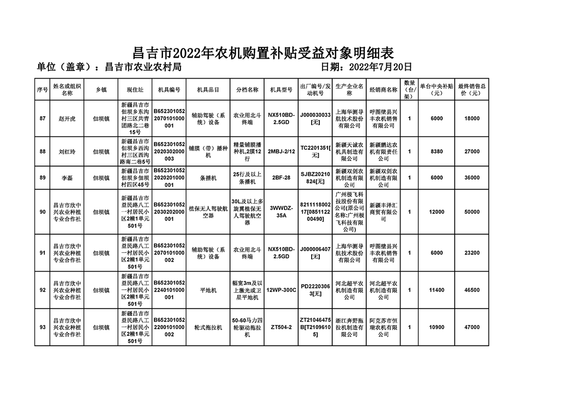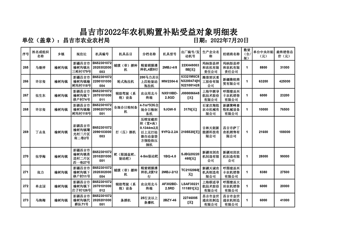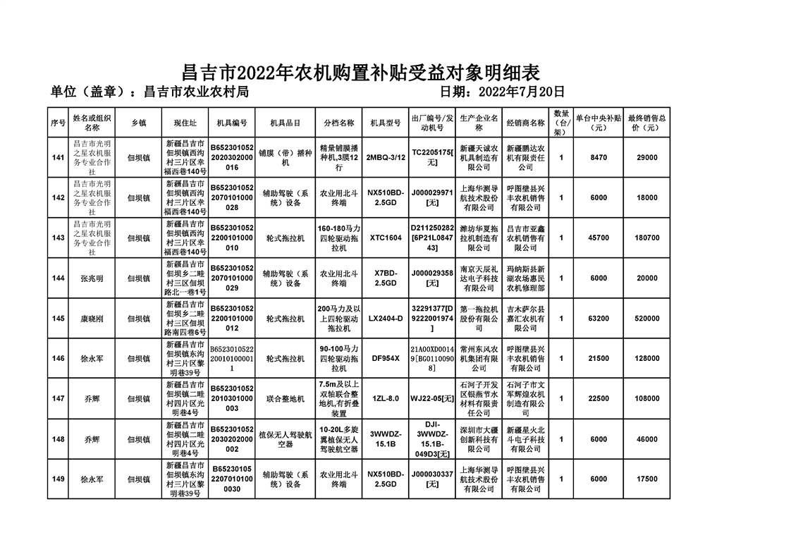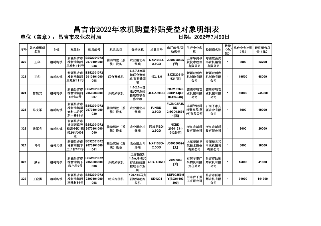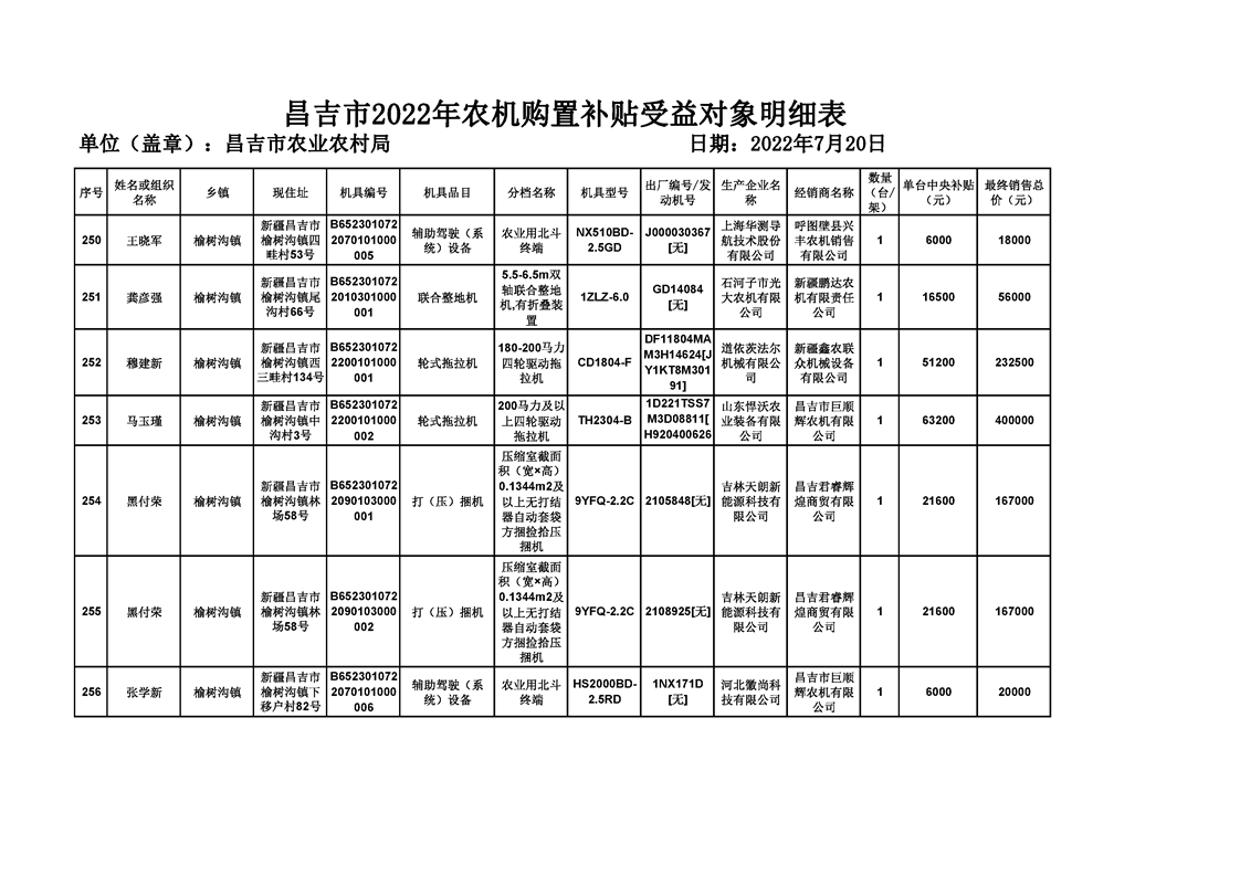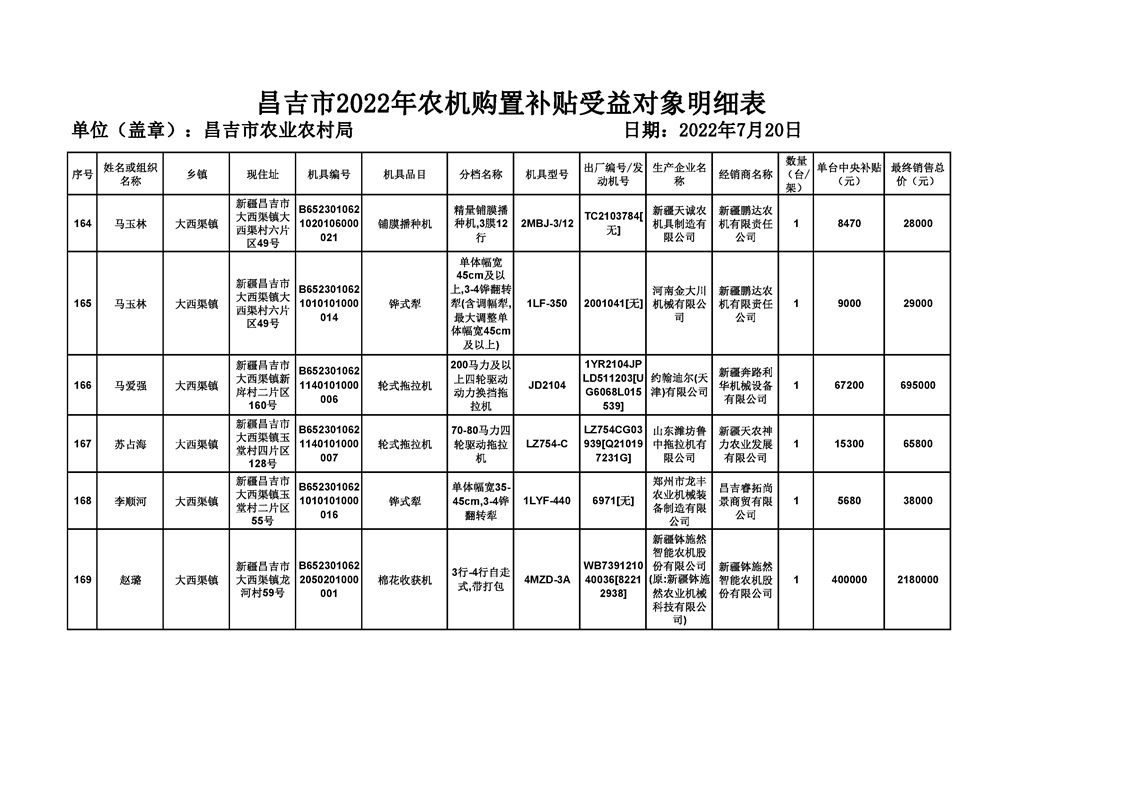 昌吉市2022年国家农机购置补贴受益对象汇总表