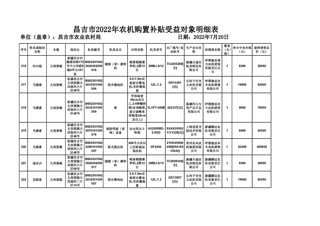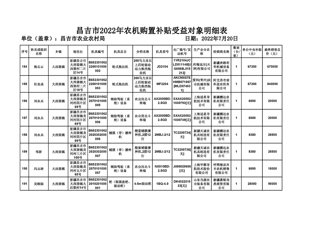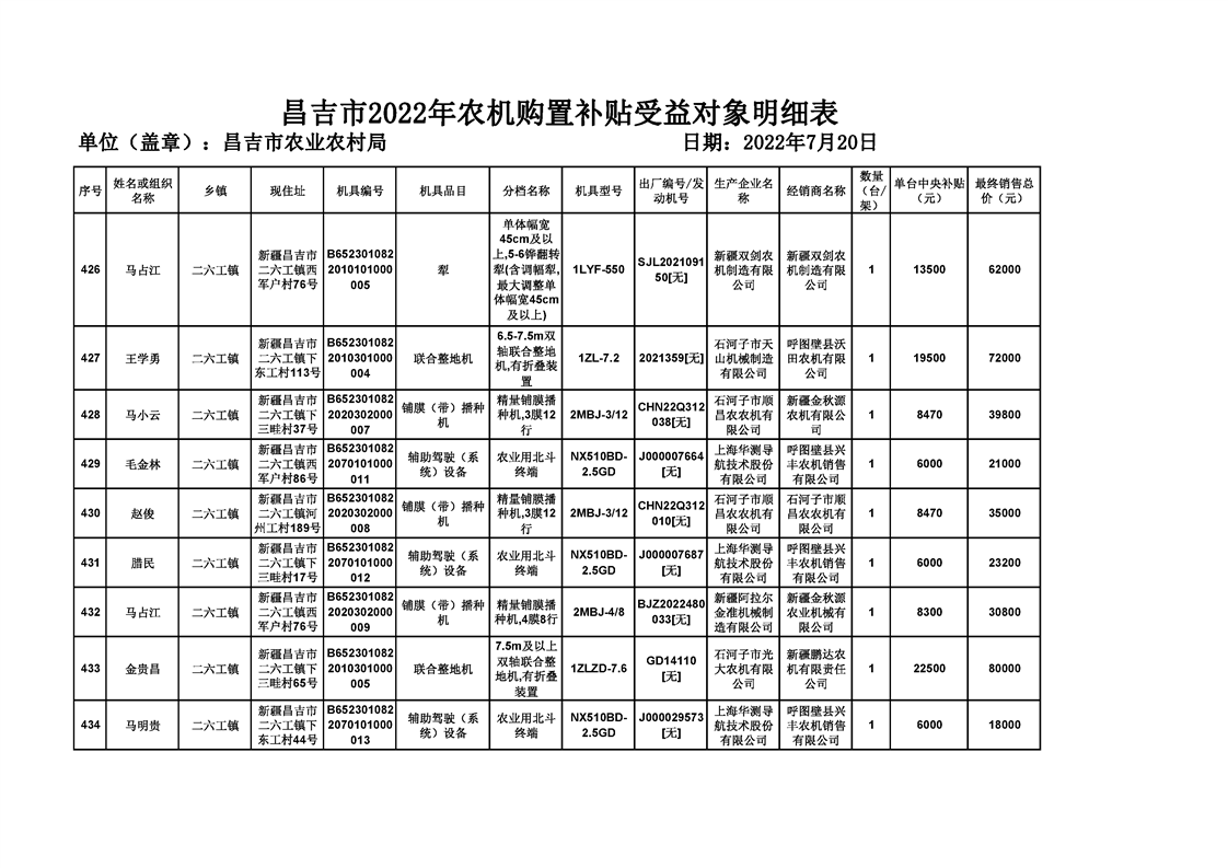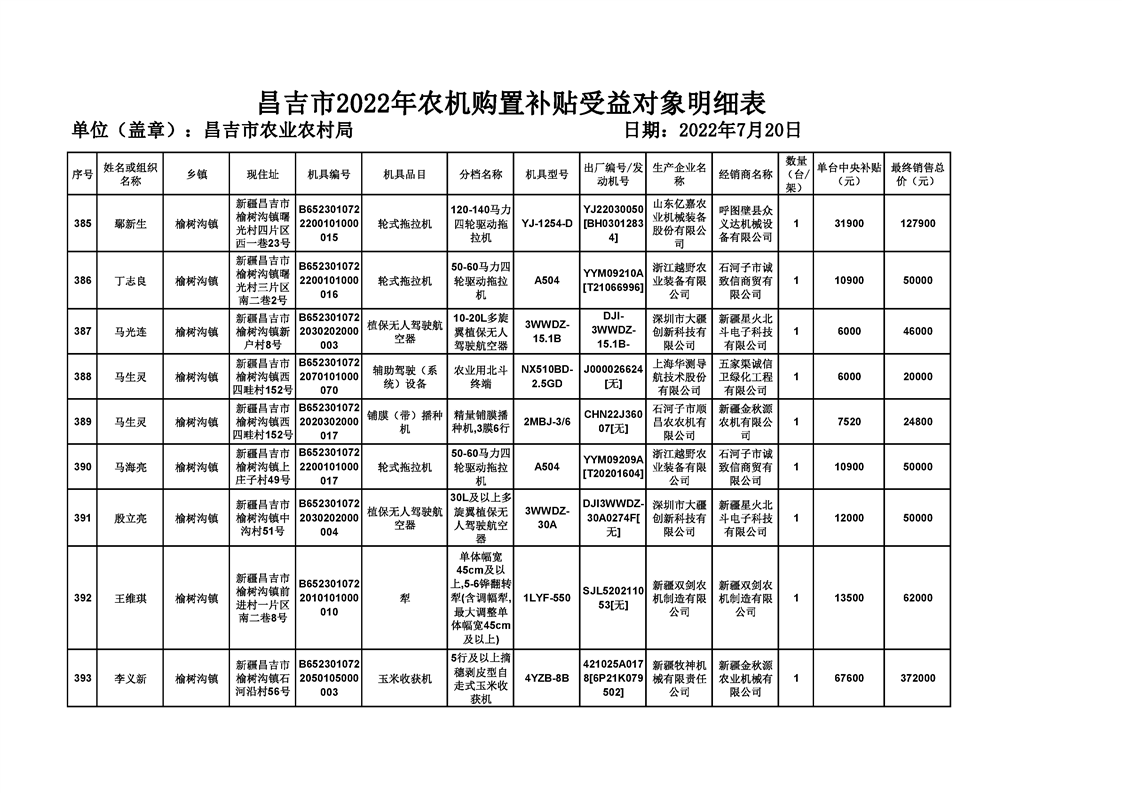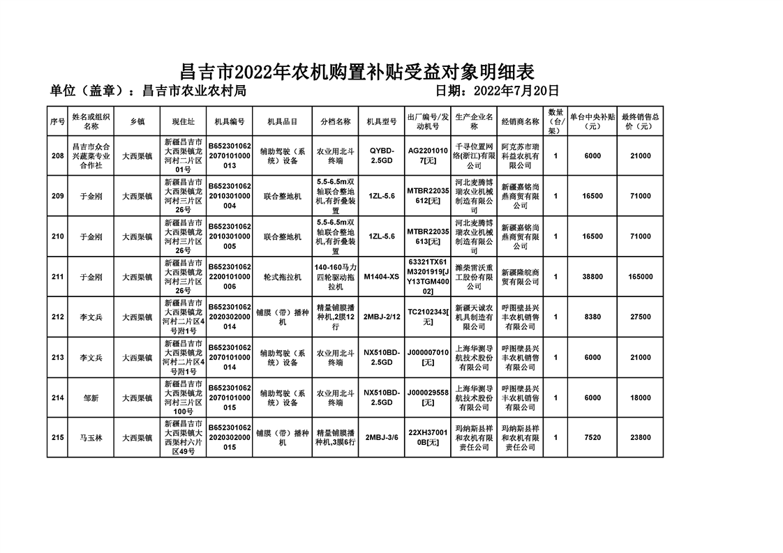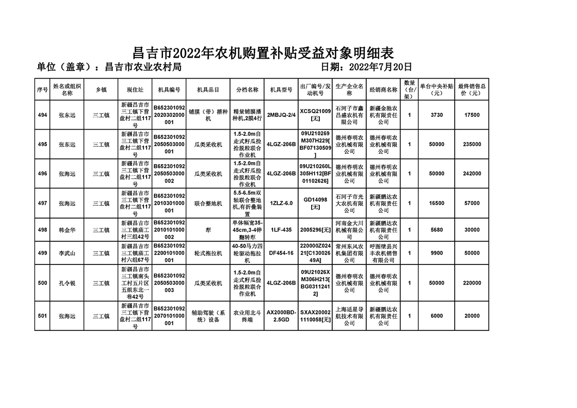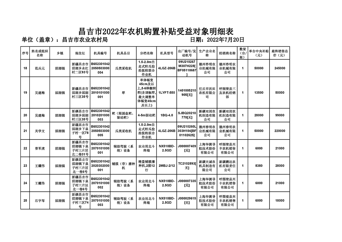 昌吉市2022年国家农机购置补贴受益对象汇总表