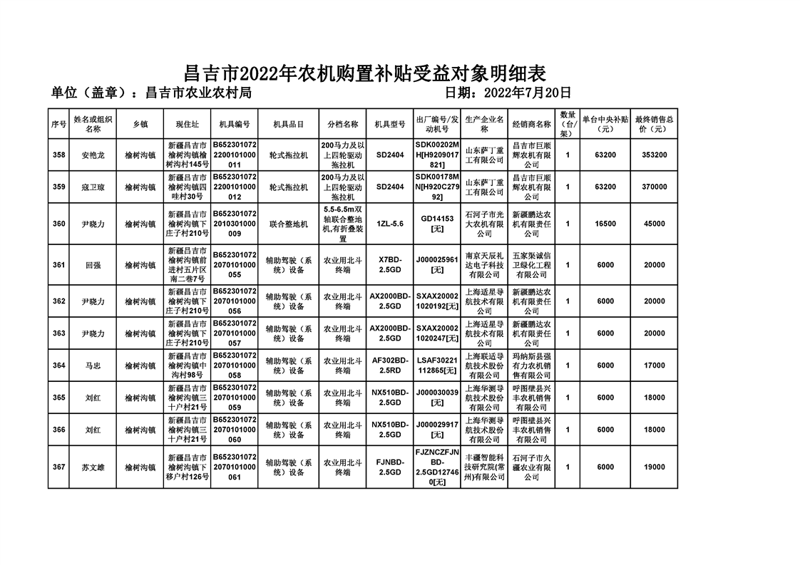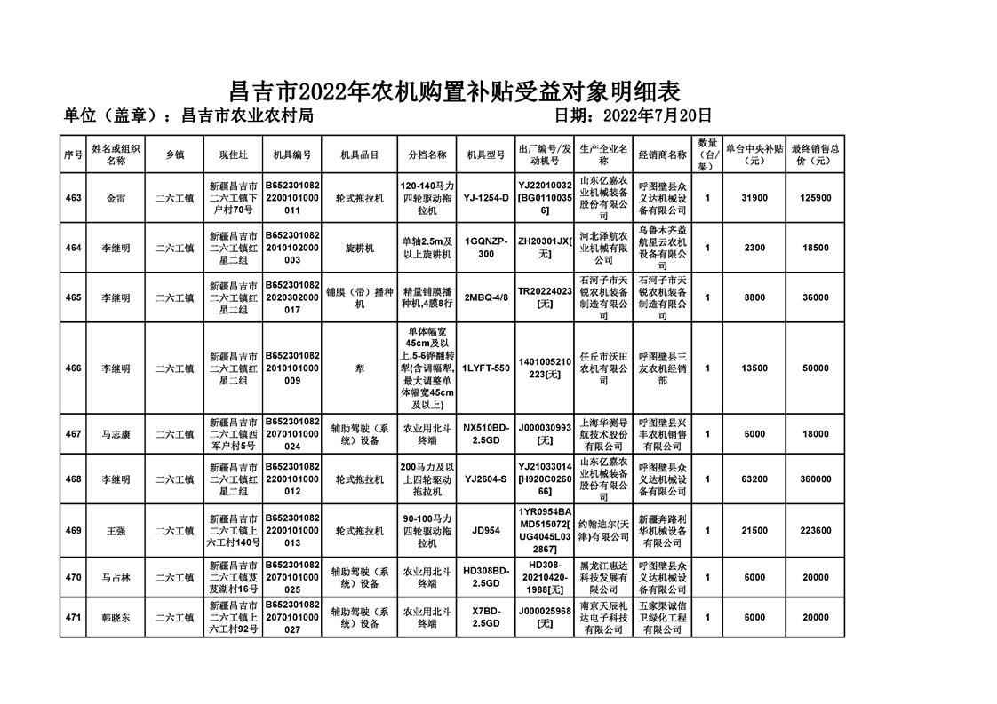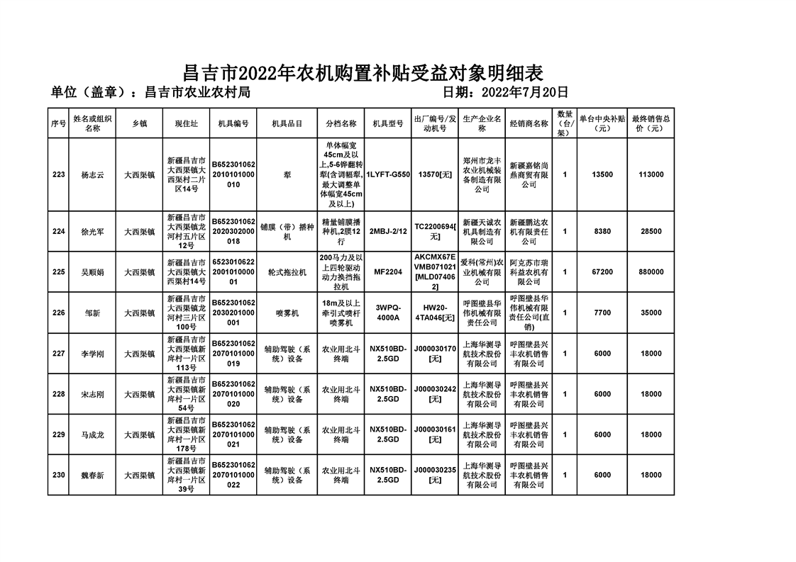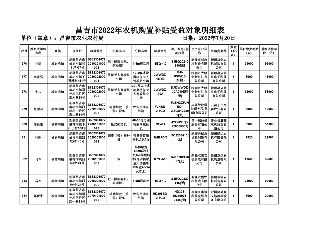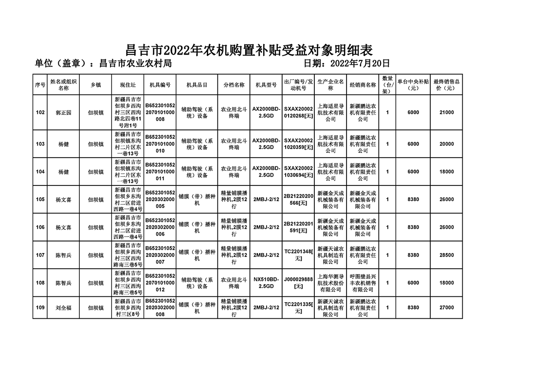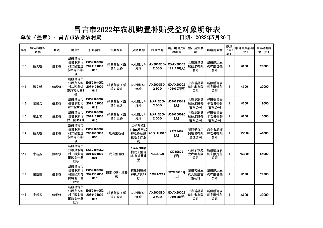昌吉市2022年国家农机购置补贴受益对象汇总表