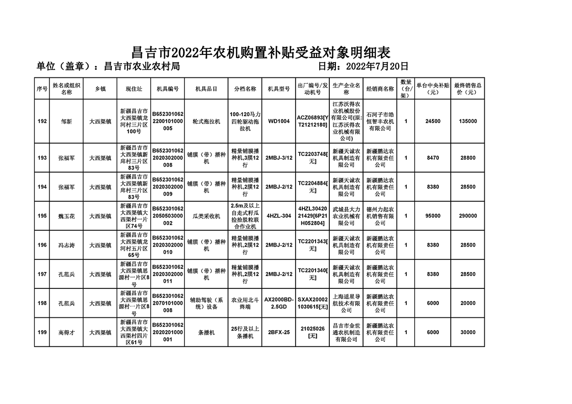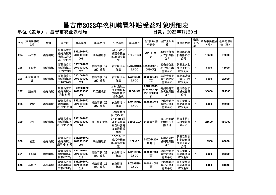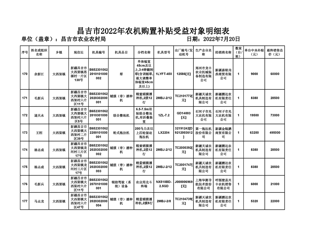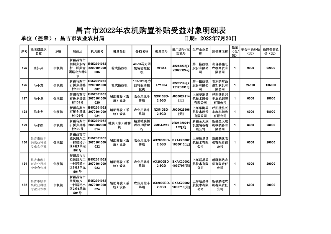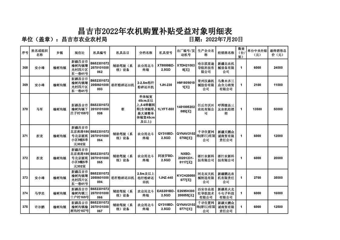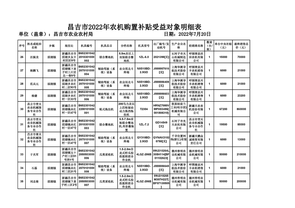 昌吉市2022年国家农机购置补贴受益对象汇总表