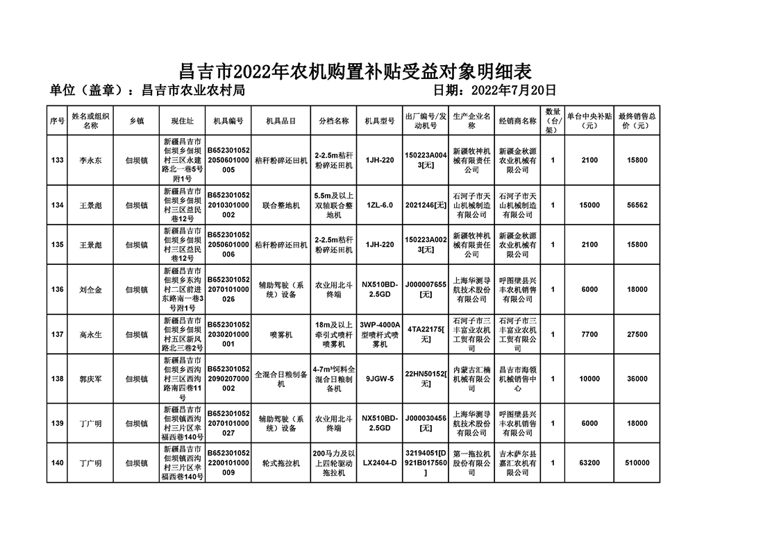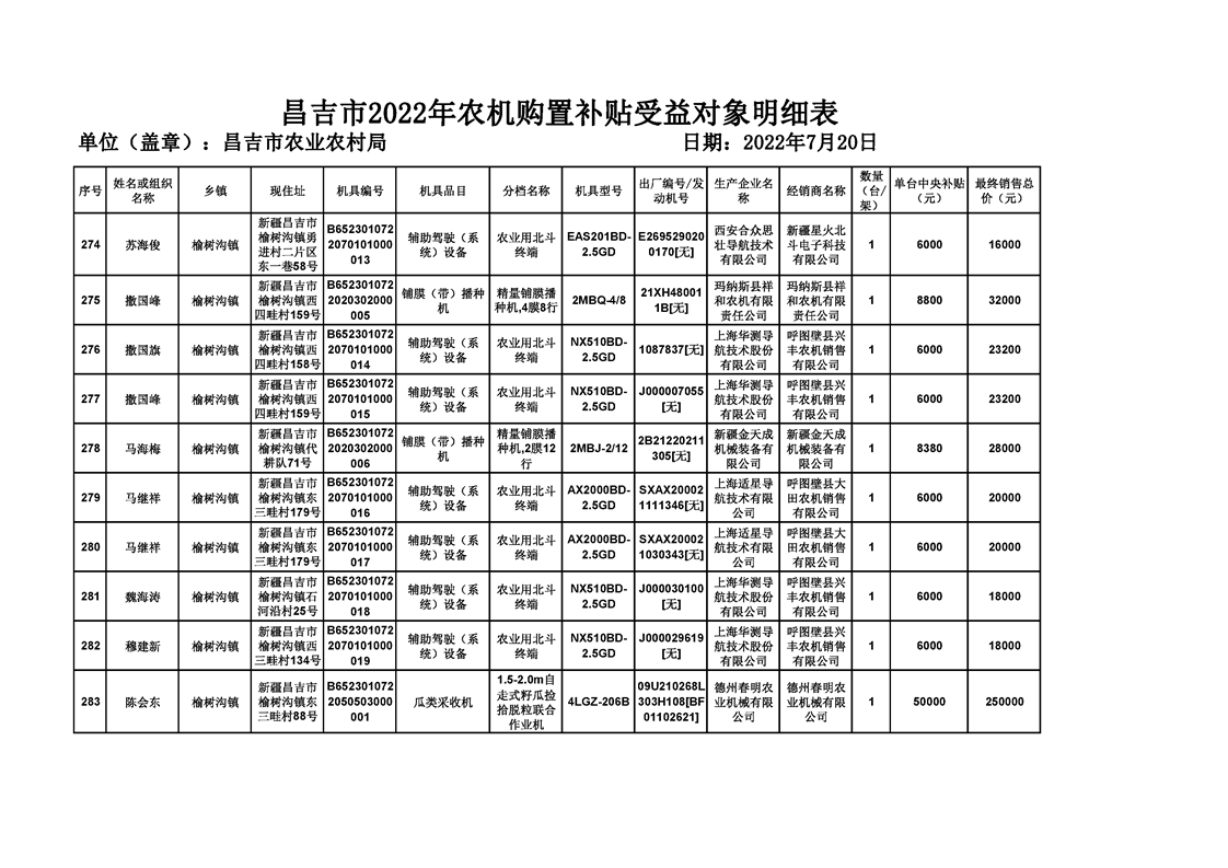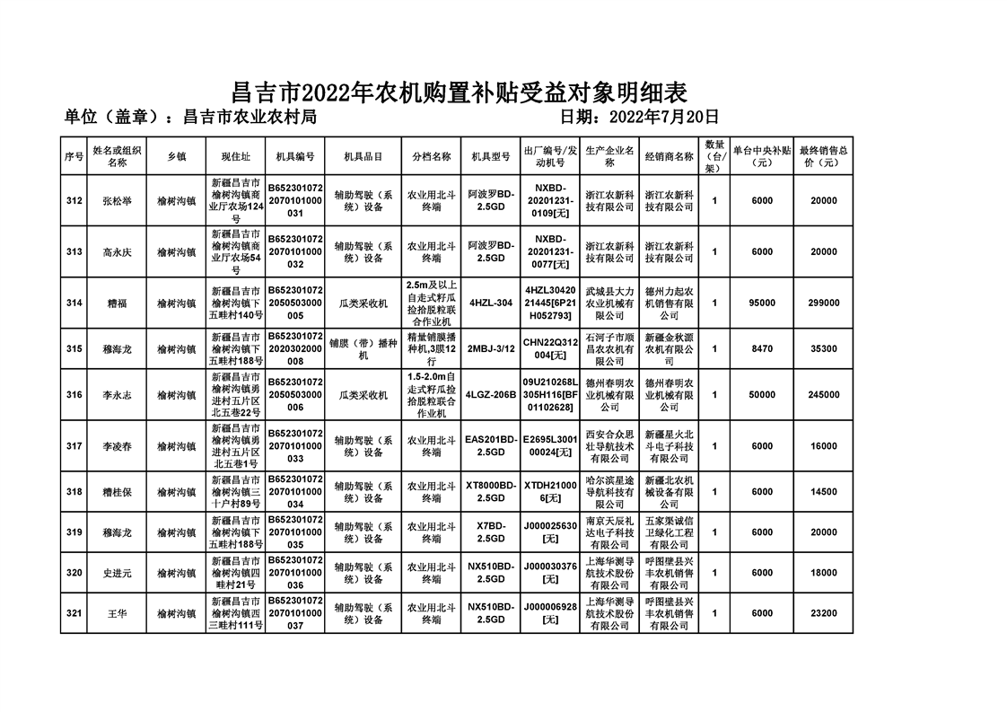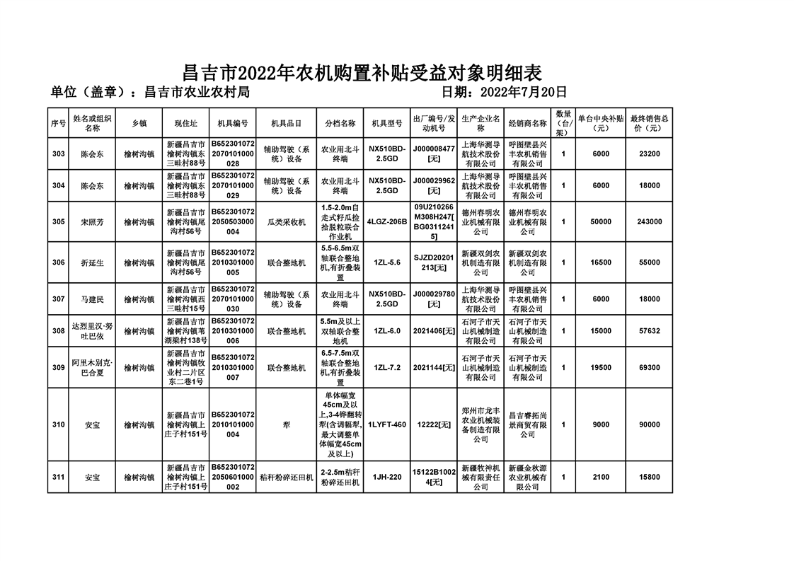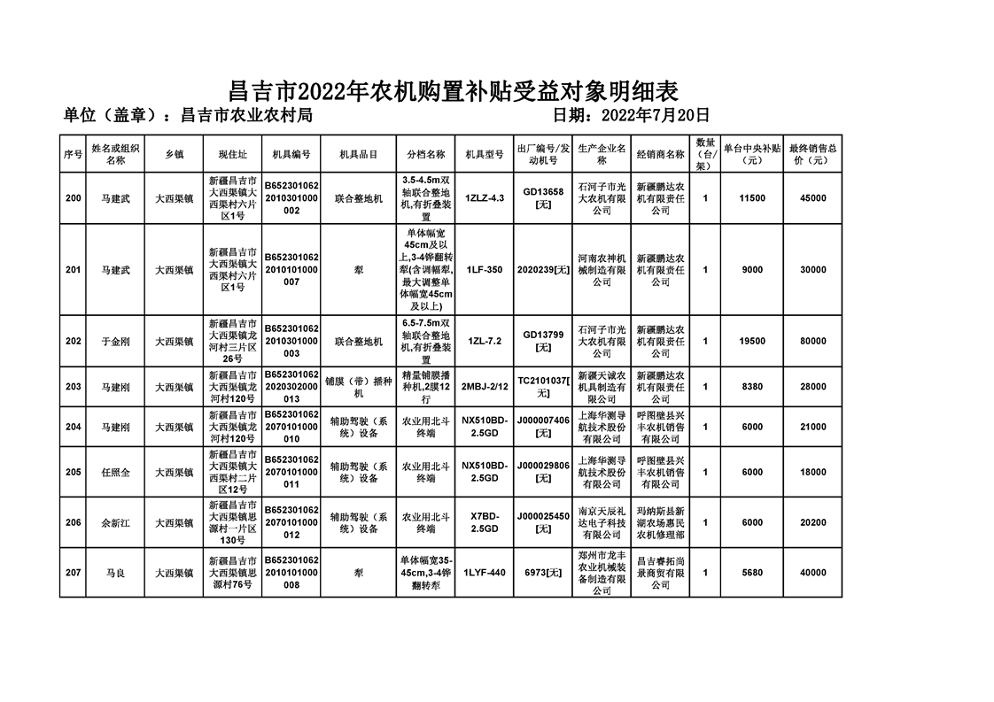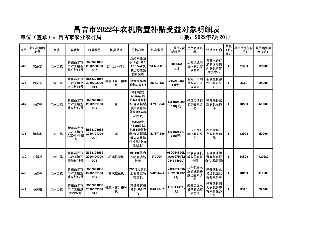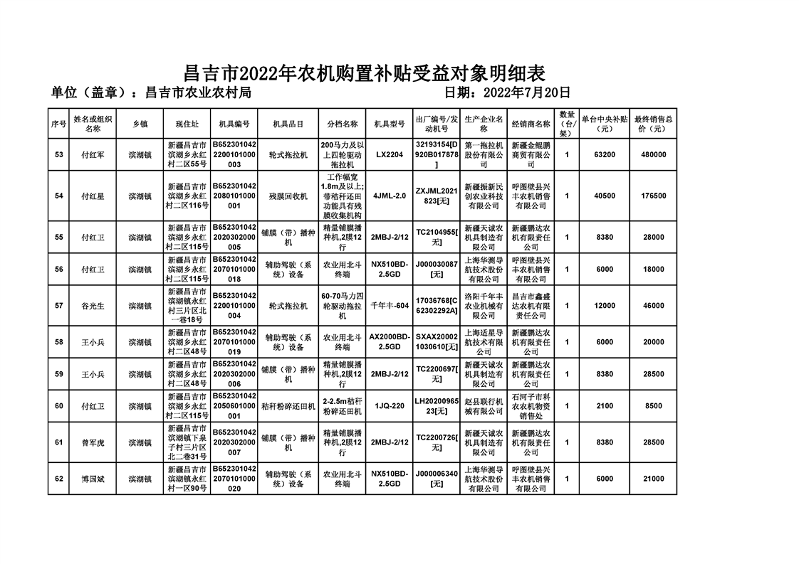 昌吉市2022年国家农机购置补贴受益对象汇总表