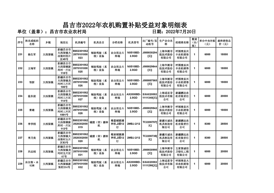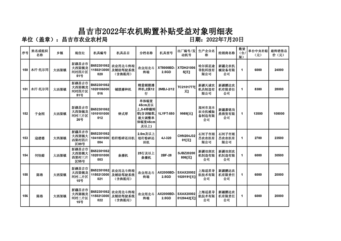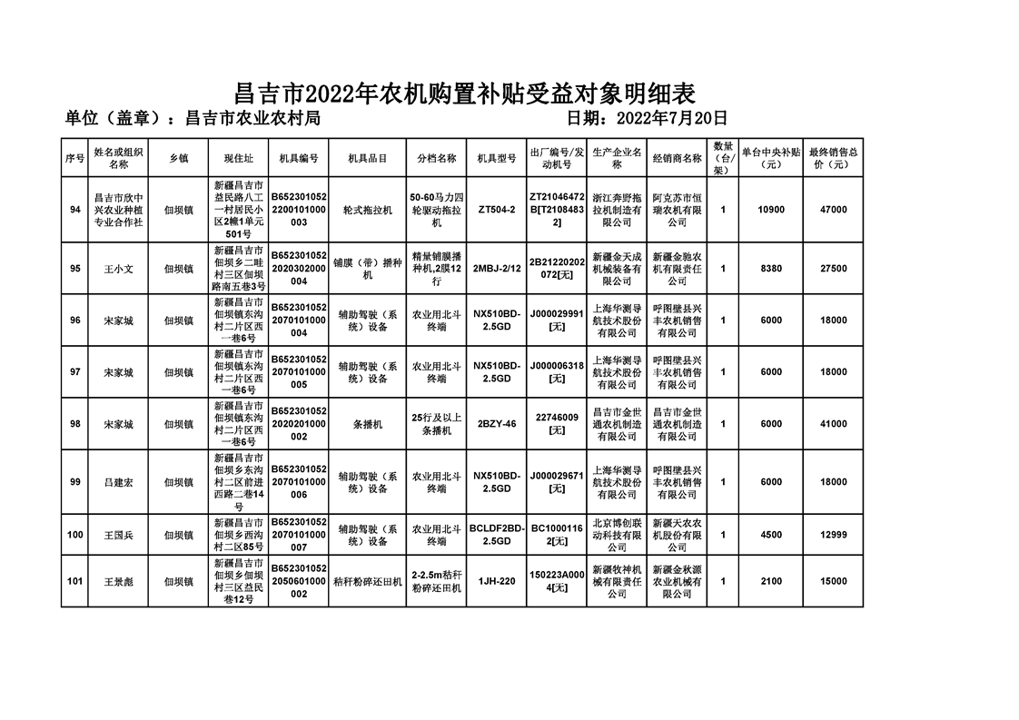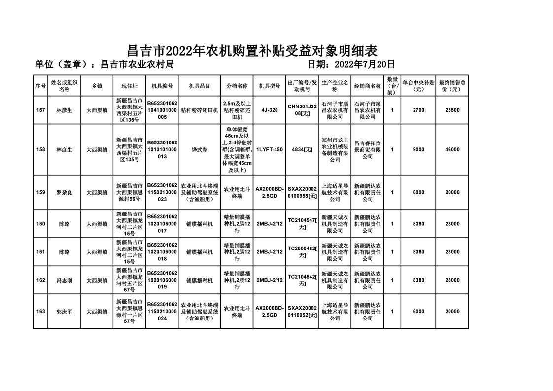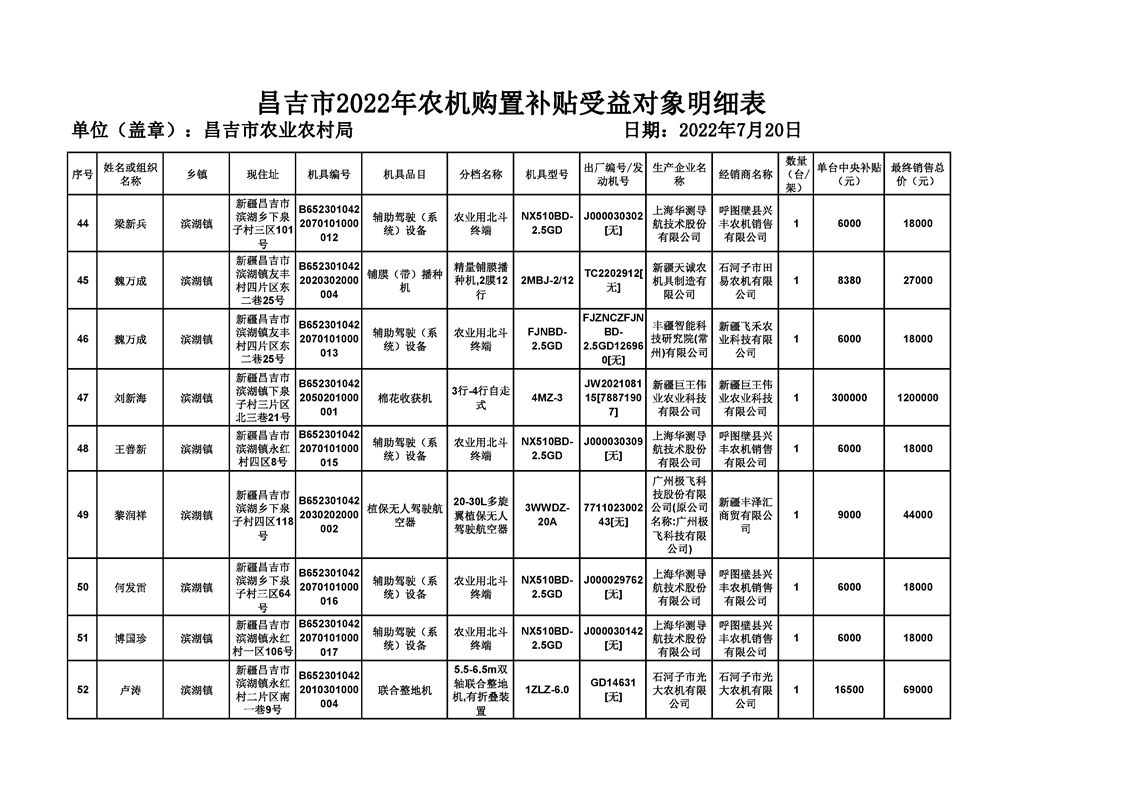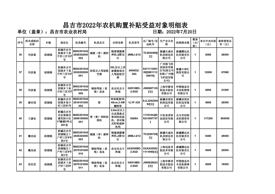 昌吉市2022年国家农机购置补贴受益对象汇总表