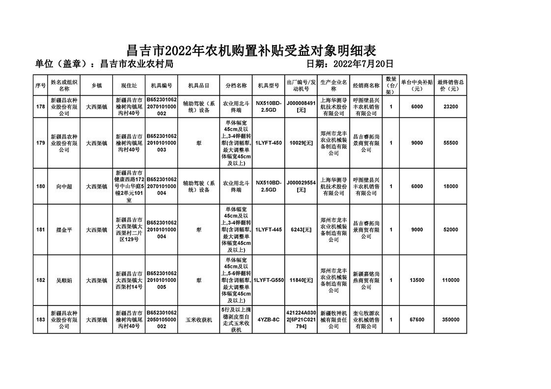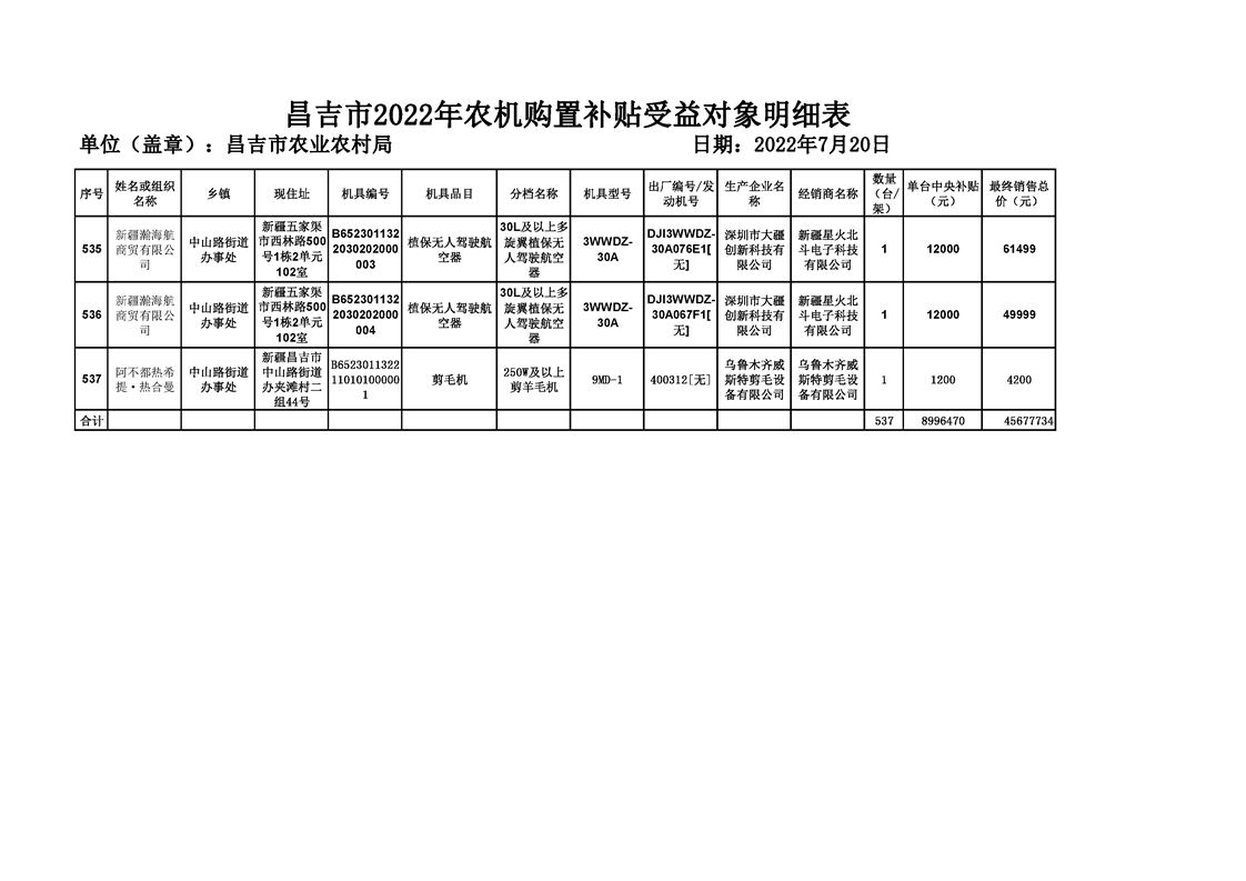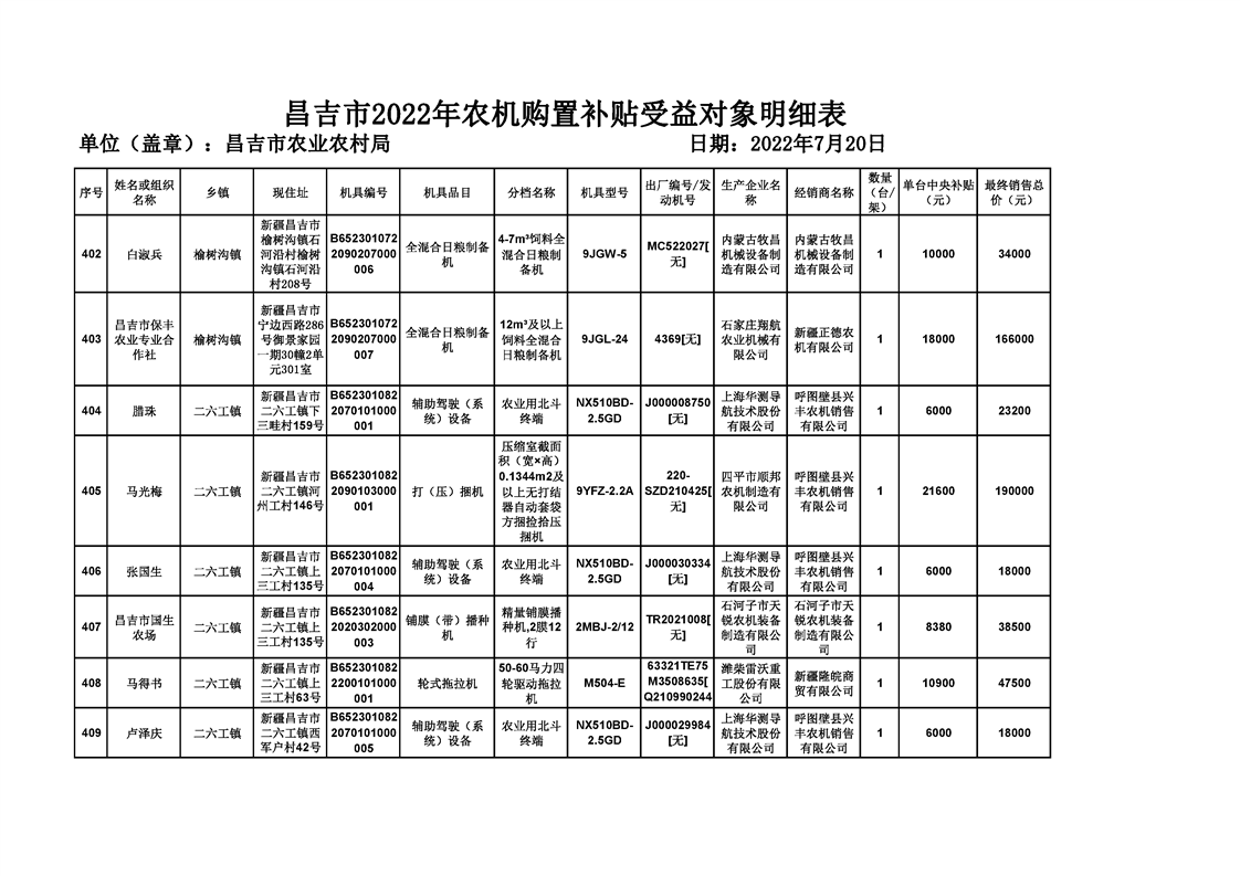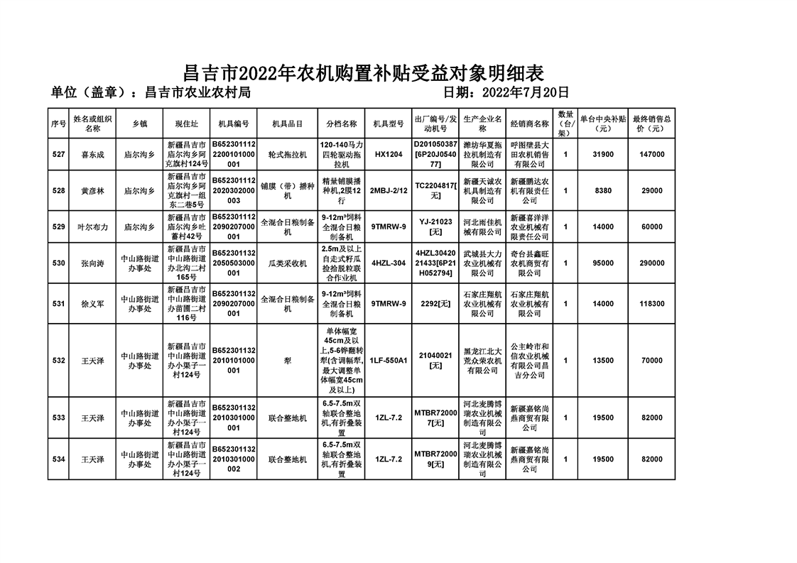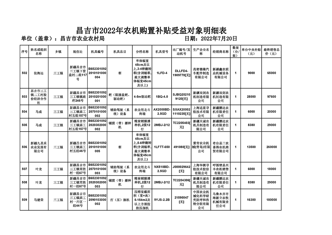 | 名 称 | 昌吉市2022年国家农机购置补贴受益对象汇总表 | ||
