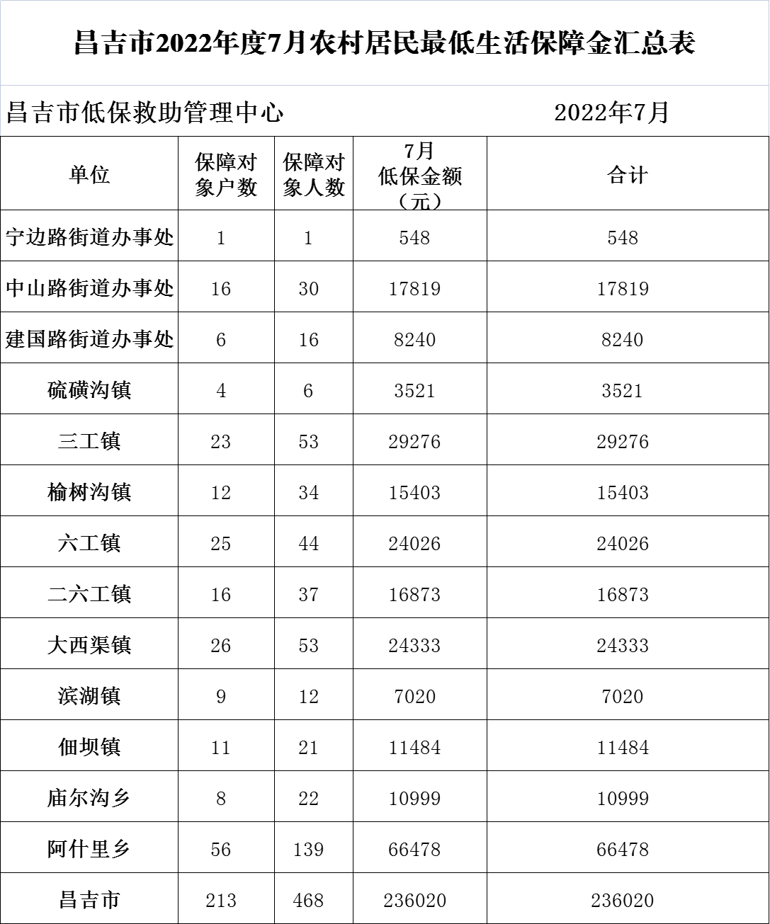 | 名 称 | 昌吉市2022年度7月农村居民最低生活保障金汇总表 | ||