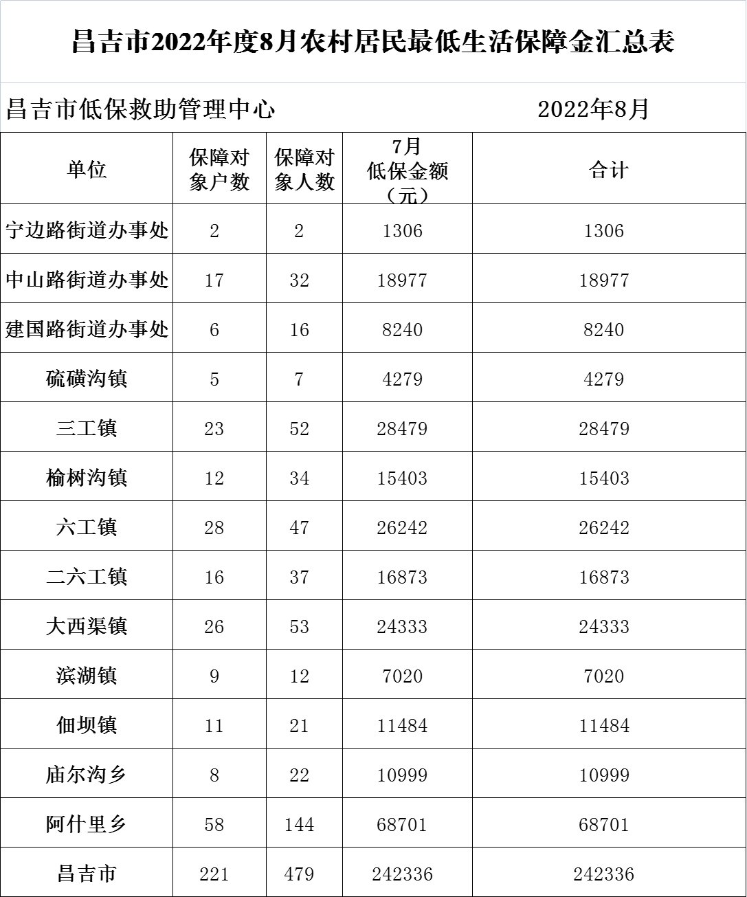 | 名 称 | 昌吉市2022年度8月农村居民最低生活保障金汇总表 | ||