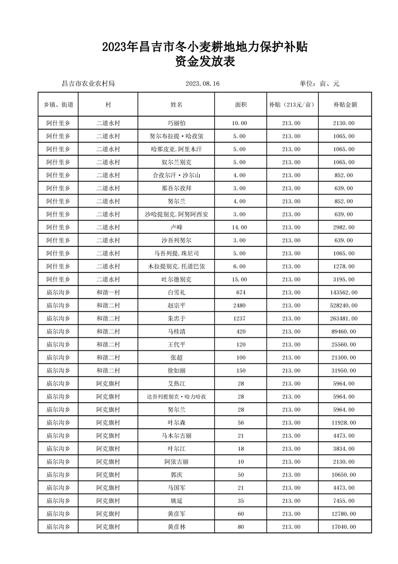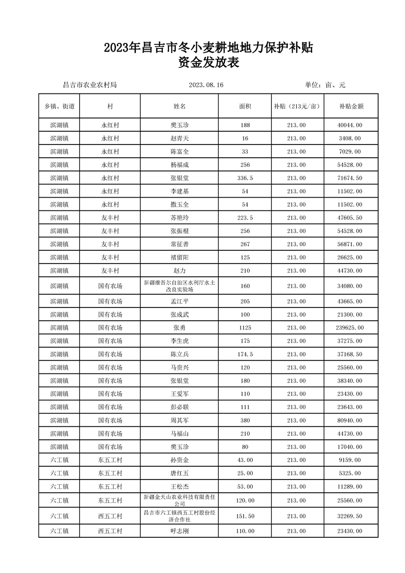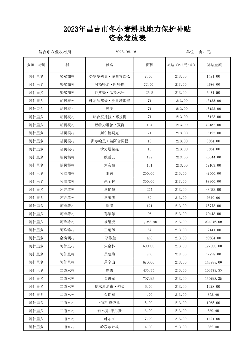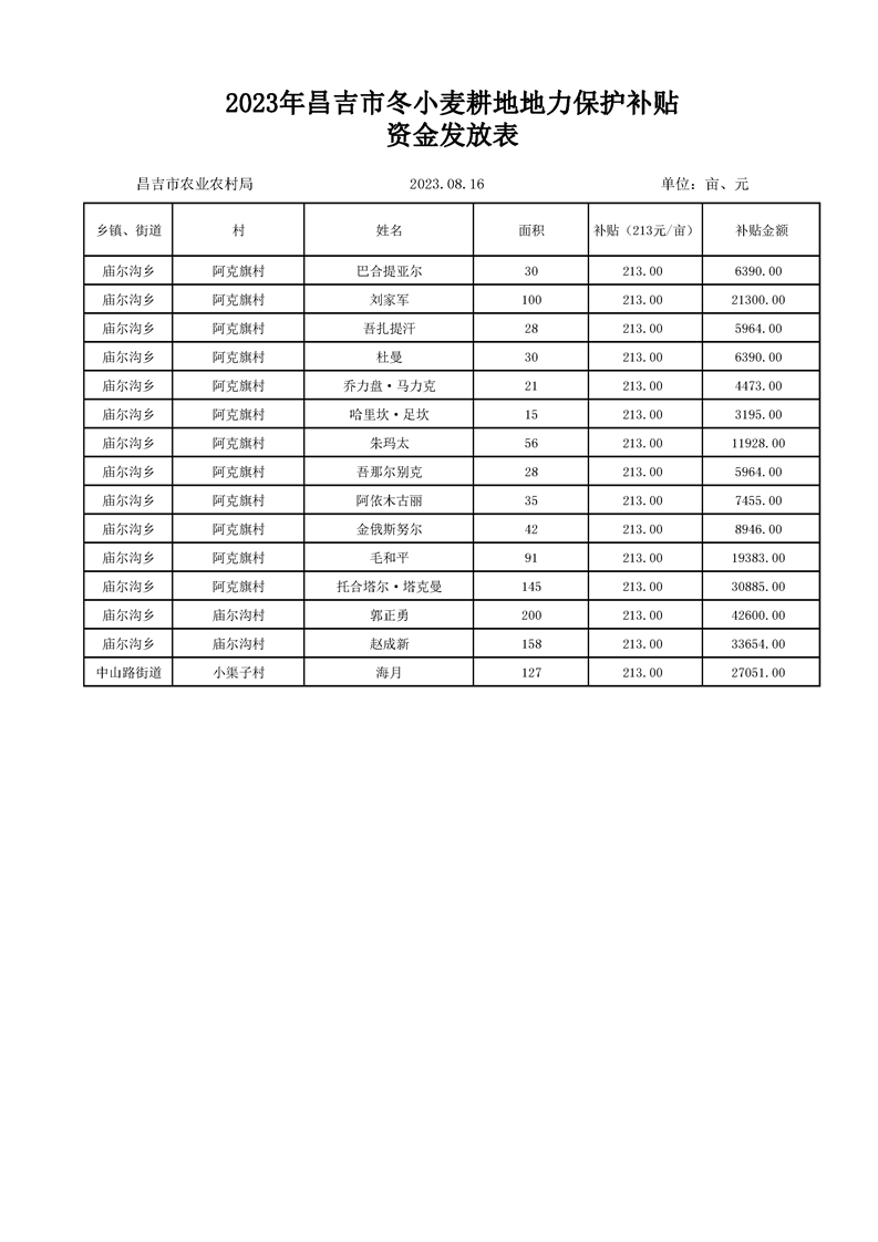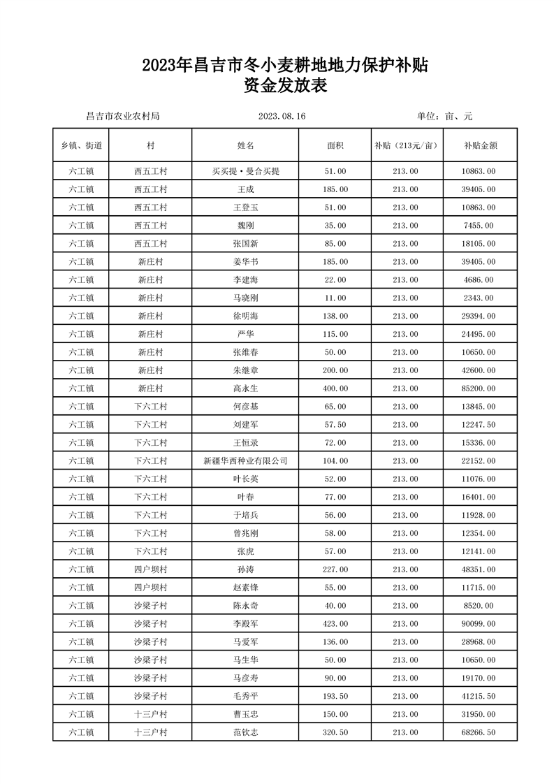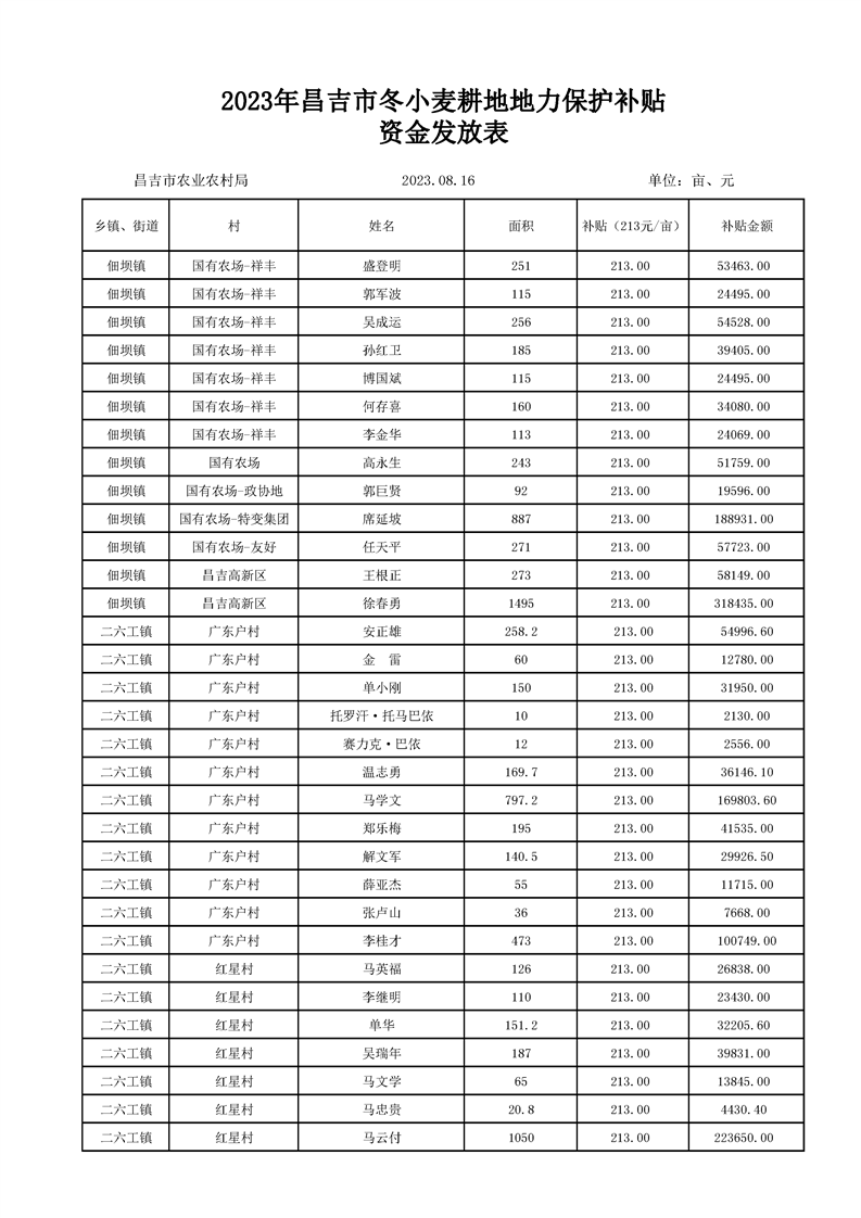 2023年昌吉市冬小麦耕地地力保护补贴资金发放表