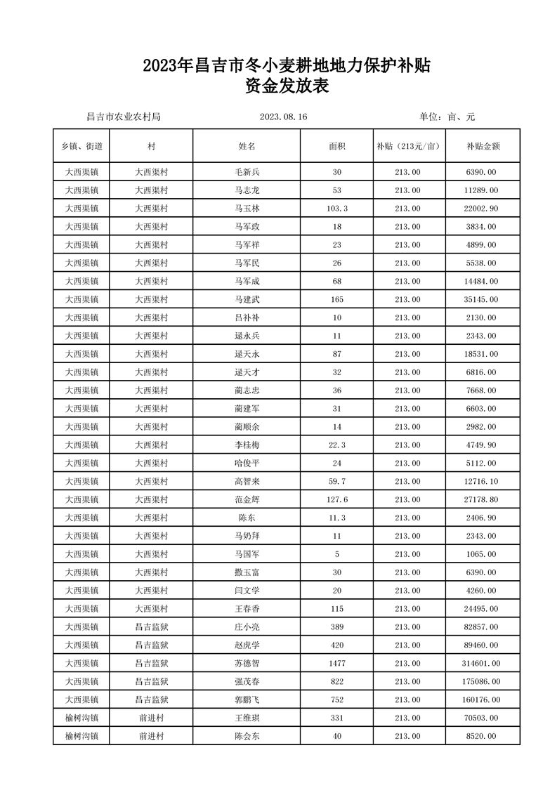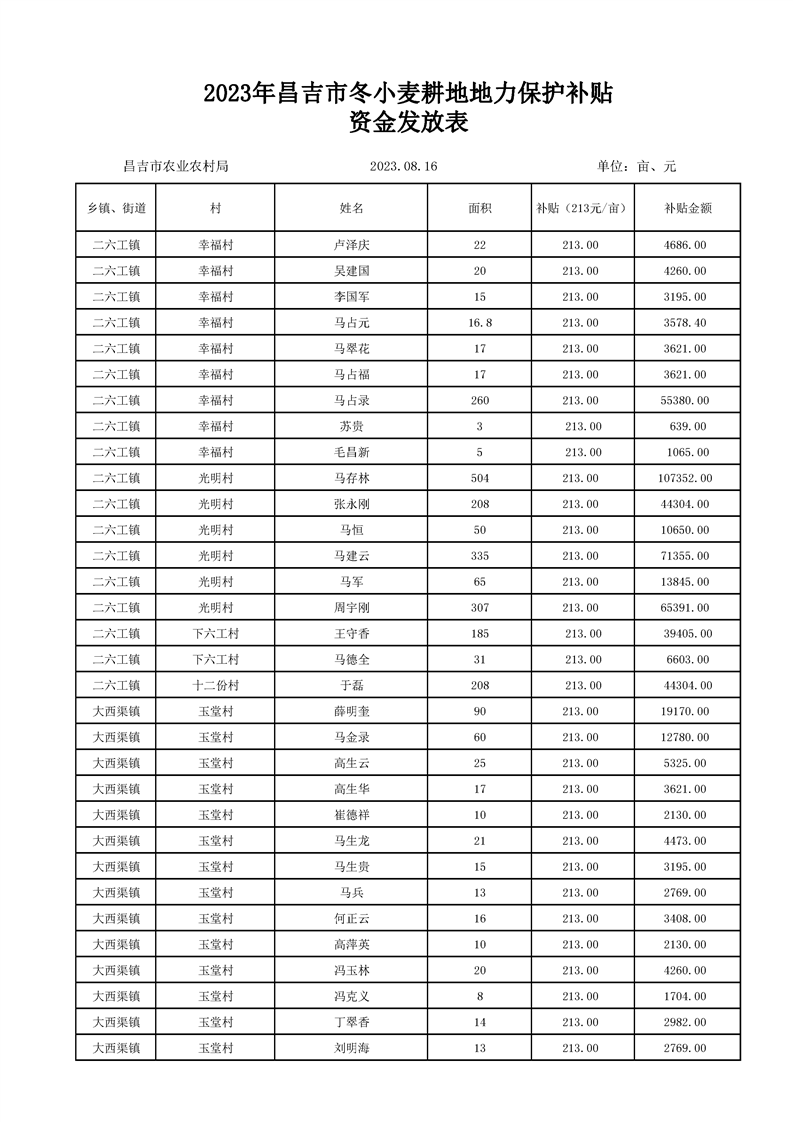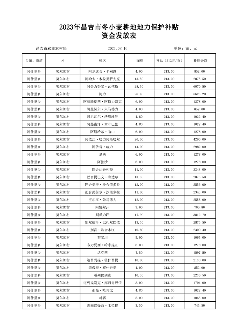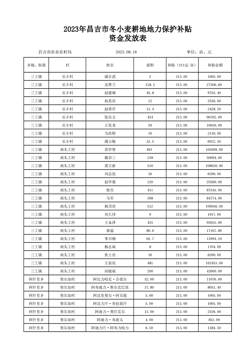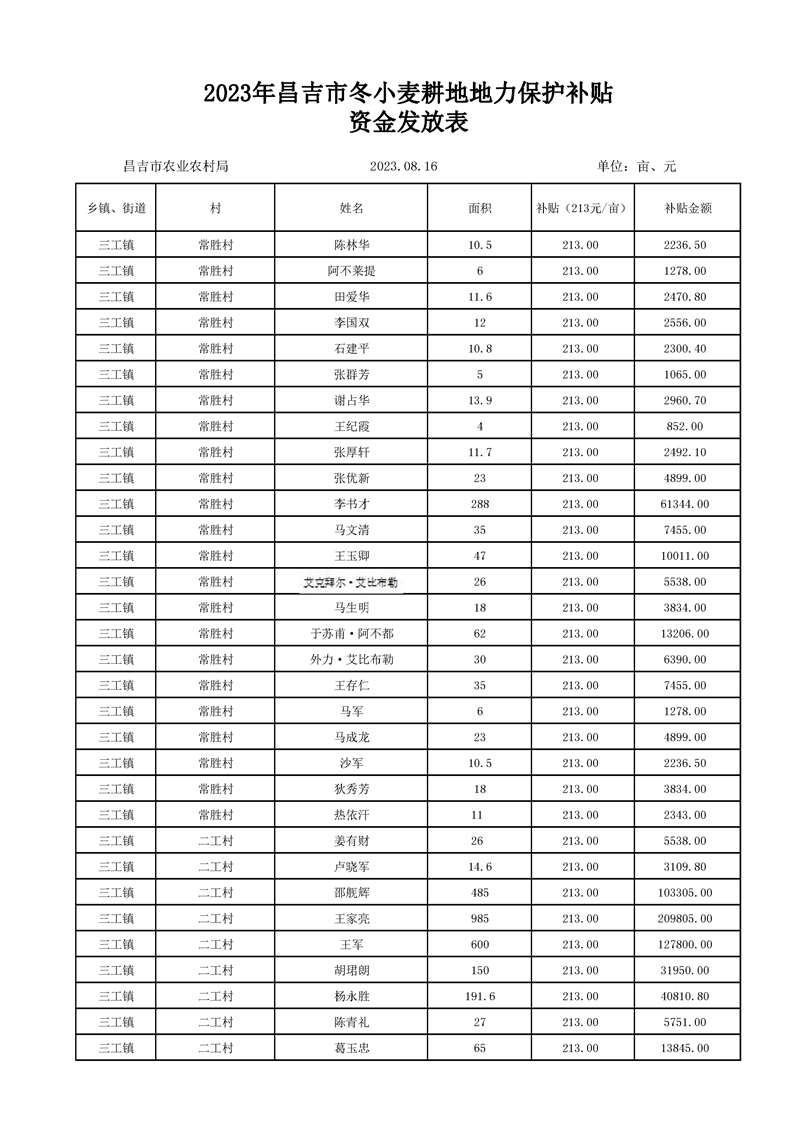 2023年昌吉市冬小麦耕地地力保护补贴资金发放表