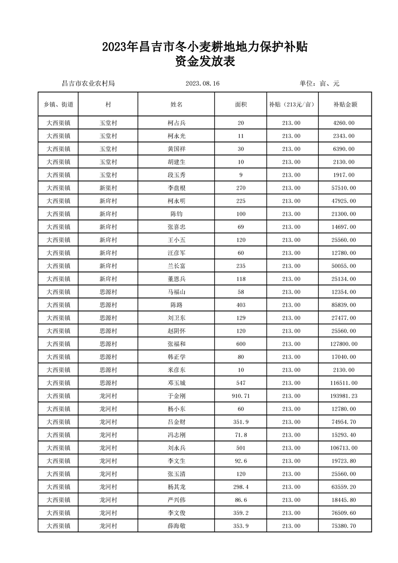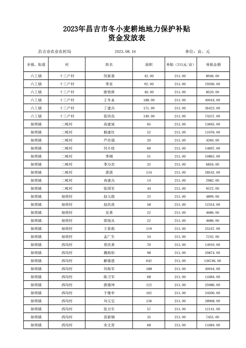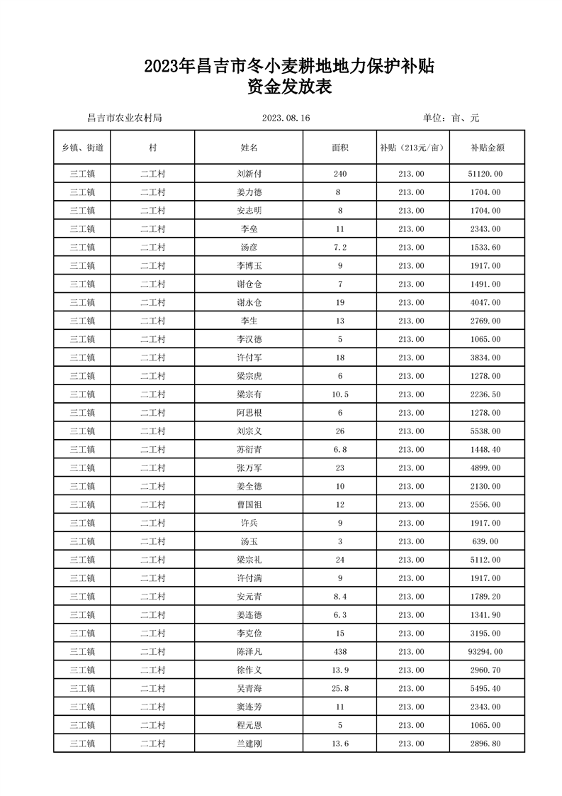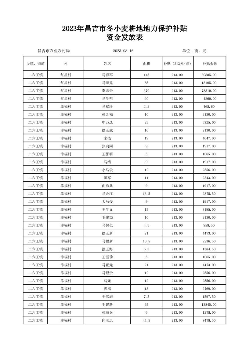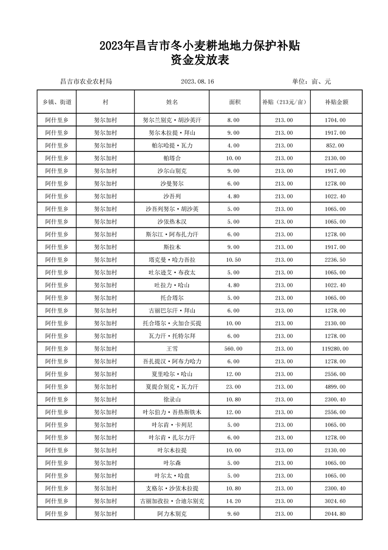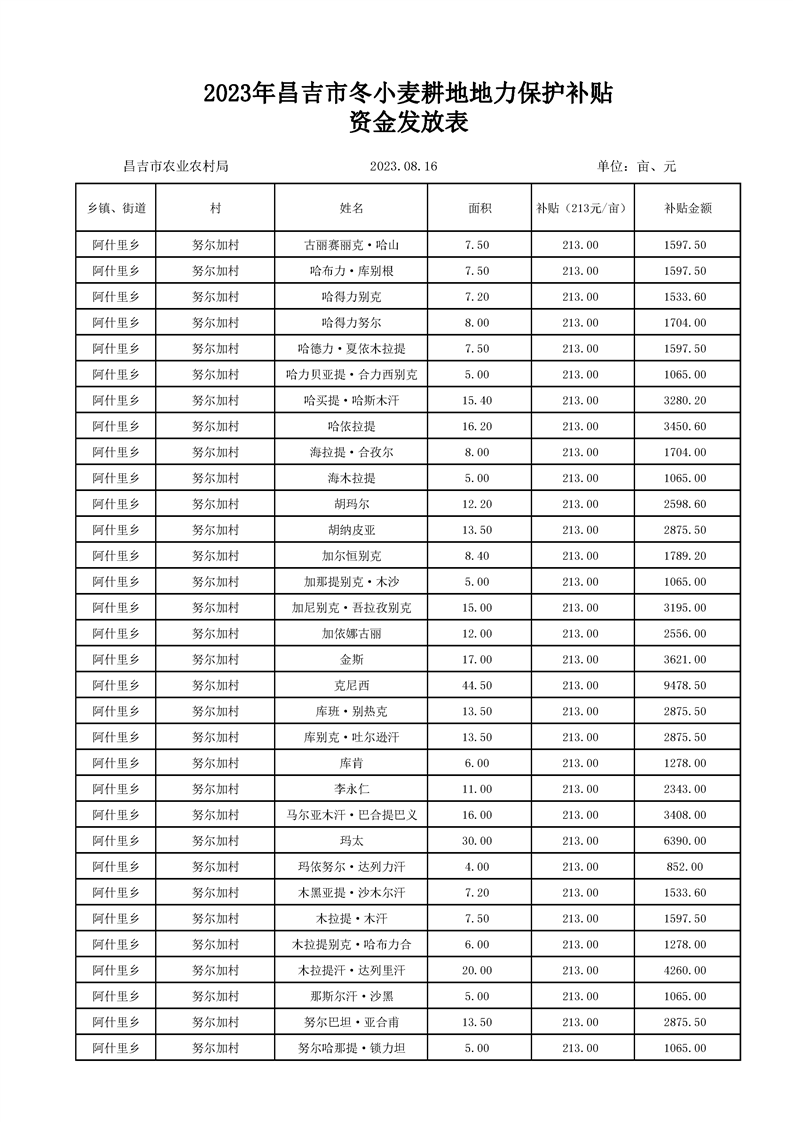 2023年昌吉市冬小麦耕地地力保护补贴资金发放表