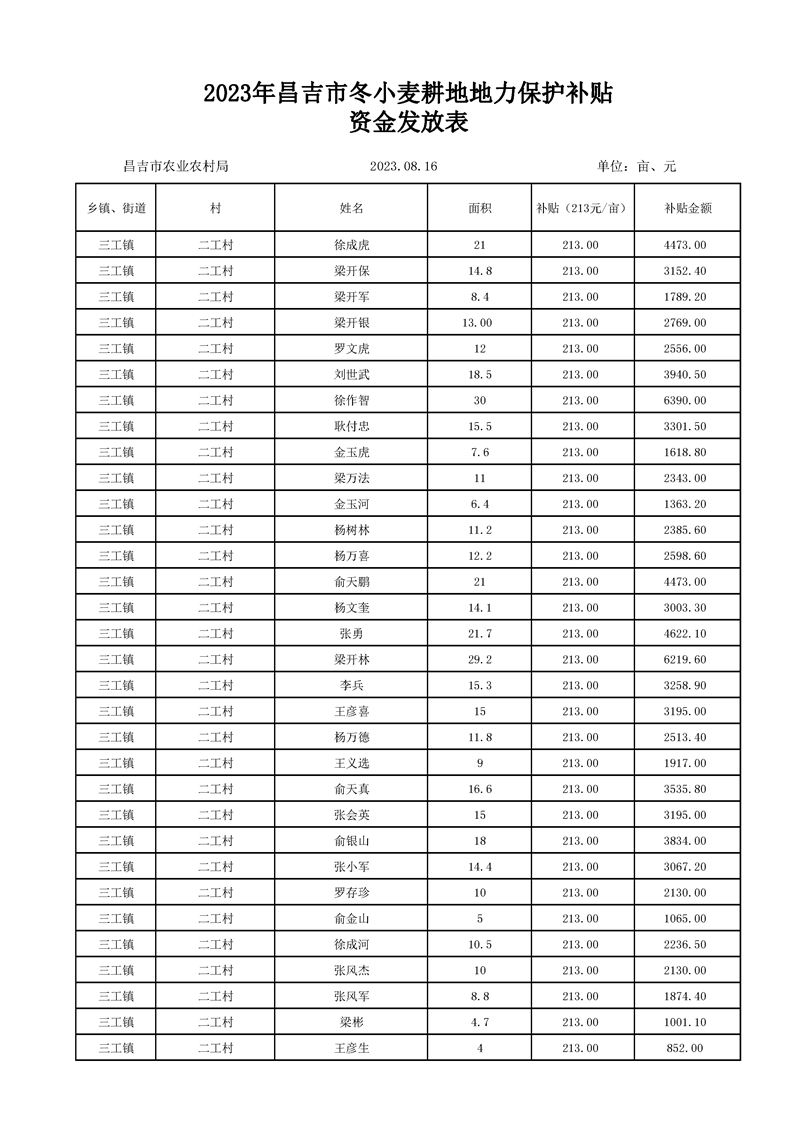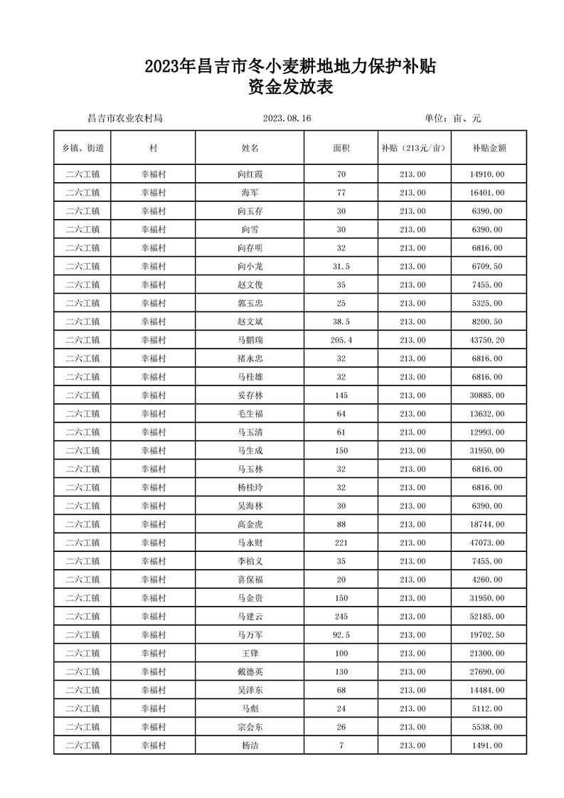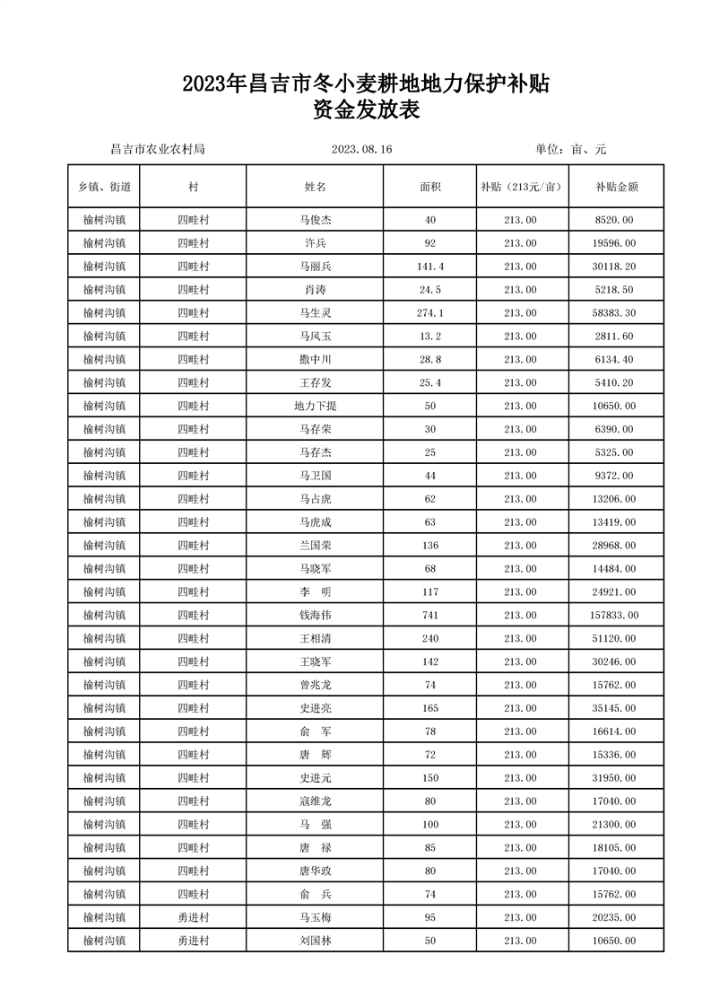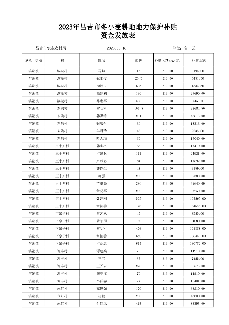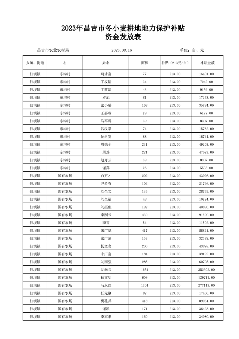 2023年昌吉市冬小麦耕地地力保护补贴资金发放表