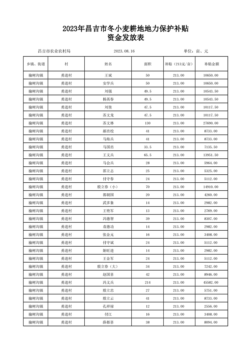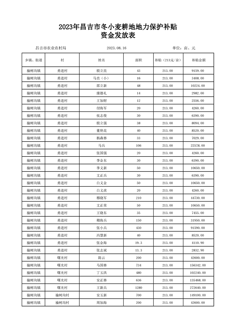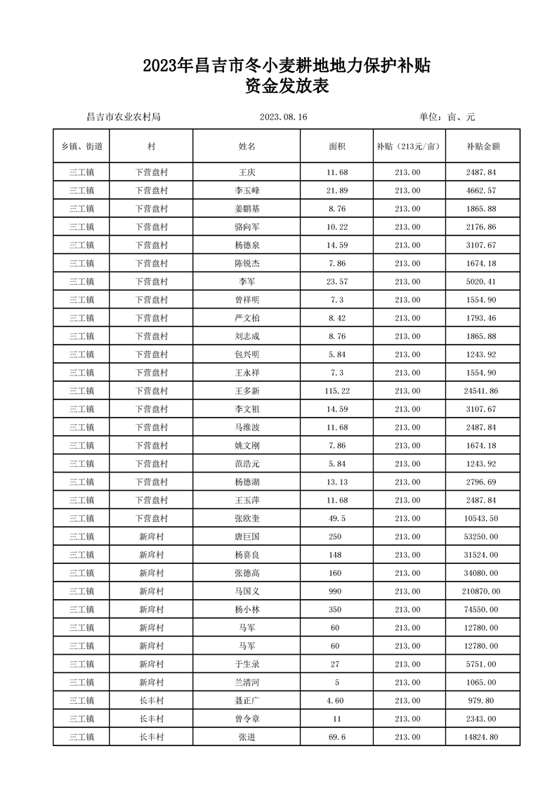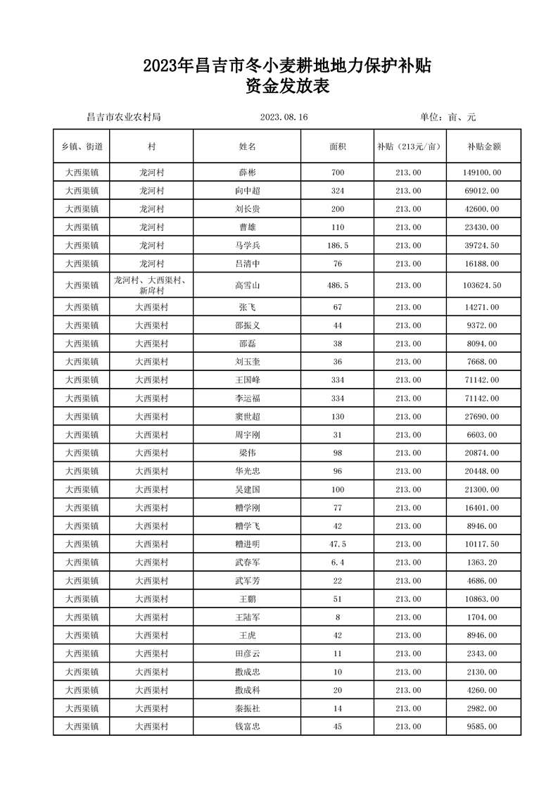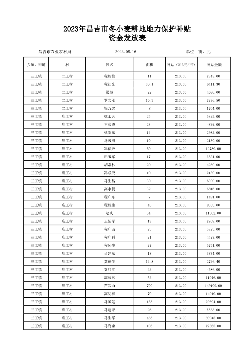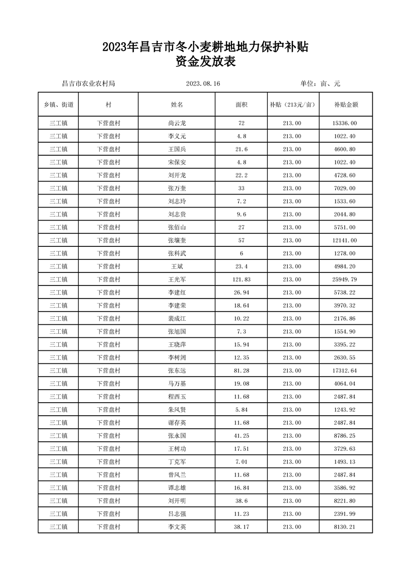 2023年昌吉市冬小麦耕地地力保护补贴资金发放表