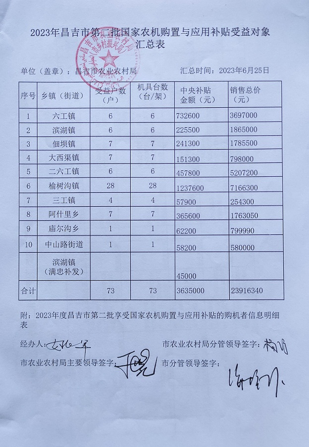 2023年昌吉市第二批国家农机购置与应用补贴受益对象汇总表