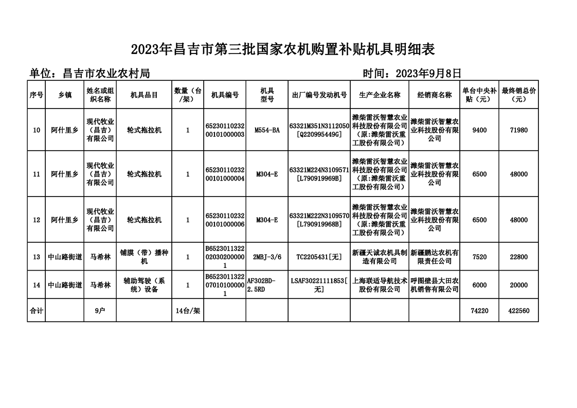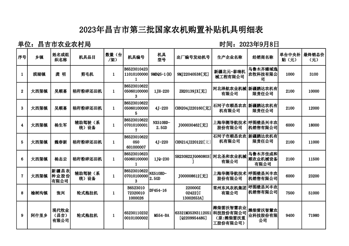 【涉农补贴结果】2023年昌吉市第三批国家农机购置补贴机具明细表