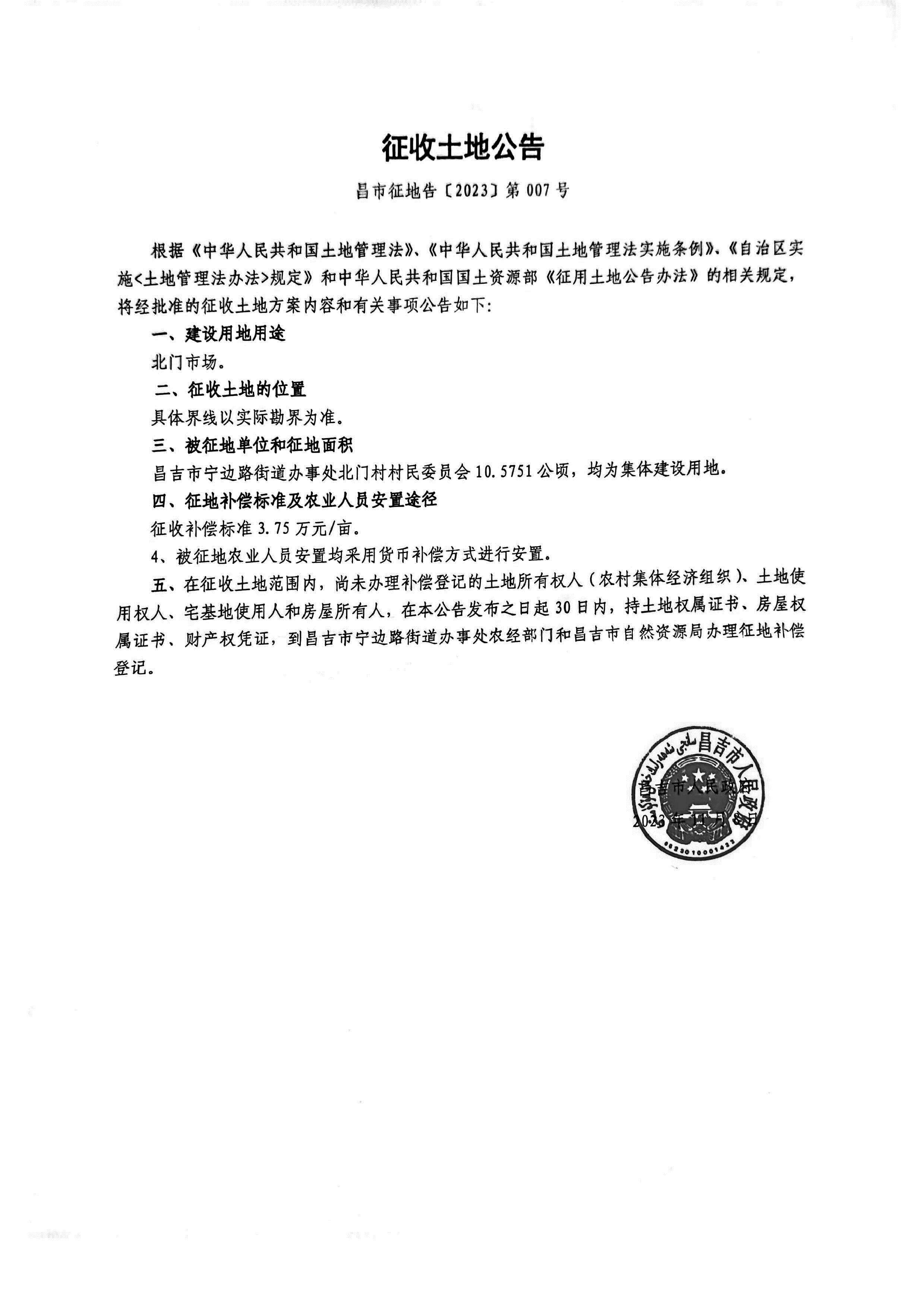 昌市征地告〔2023〕第 007号