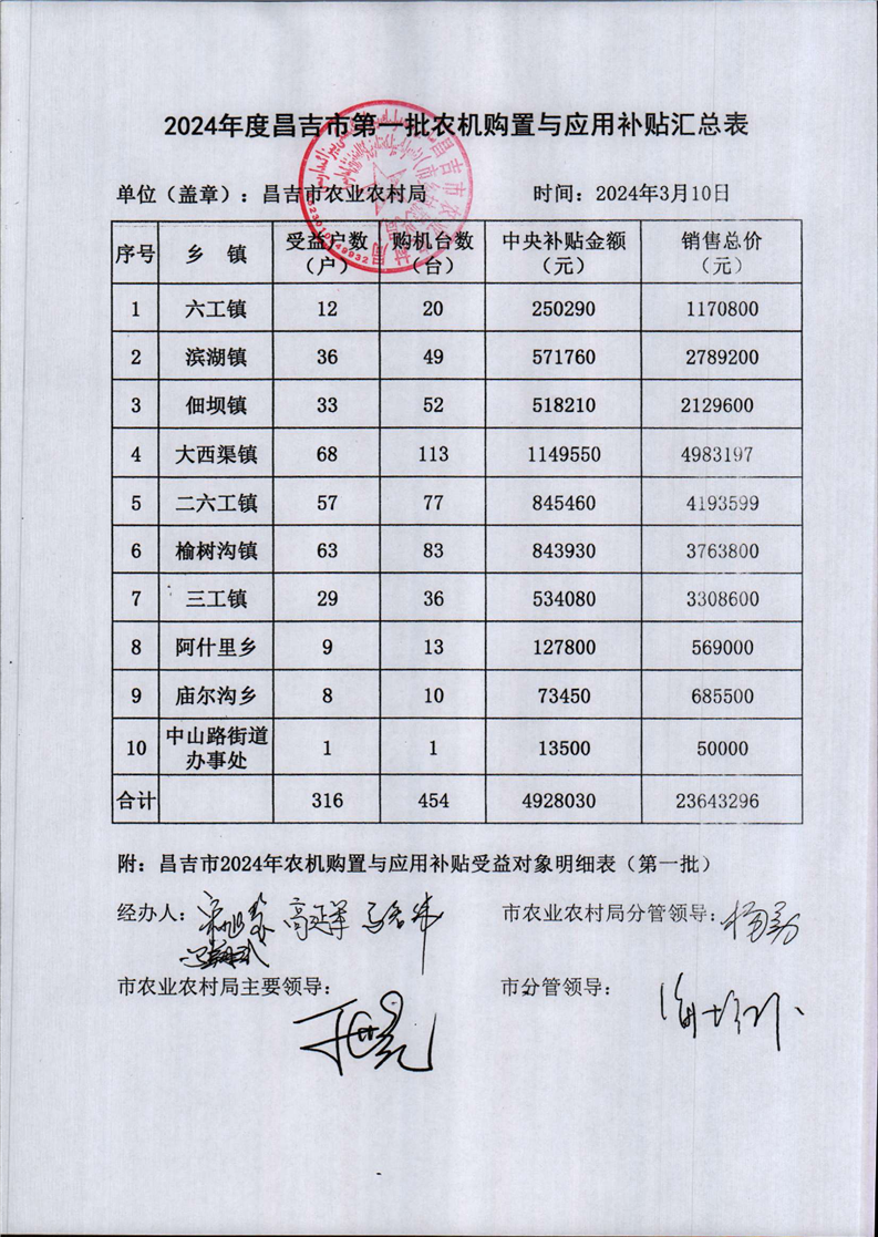 【涉农补贴结果】2024年度昌吉市第一批农机购置与应用补贴汇总表