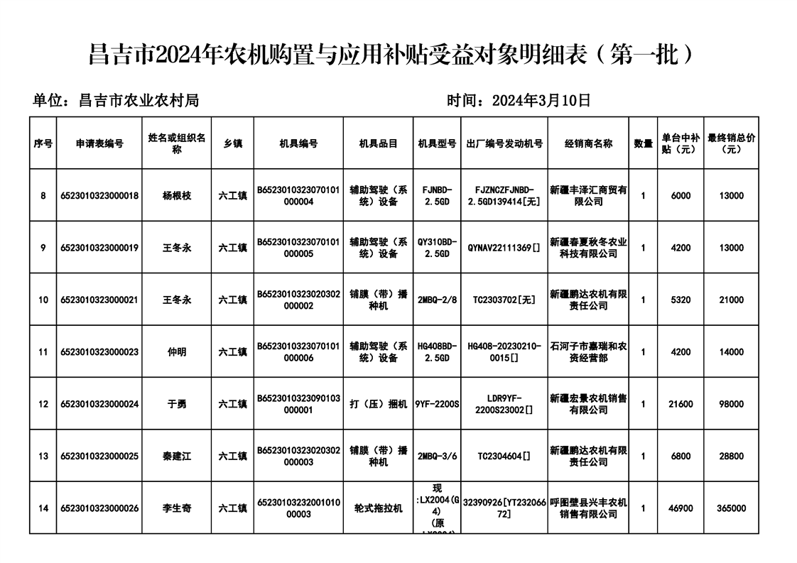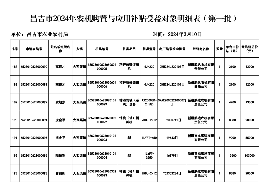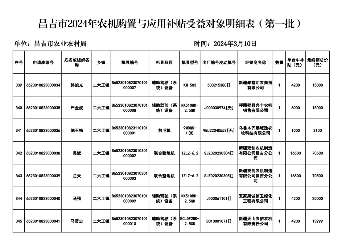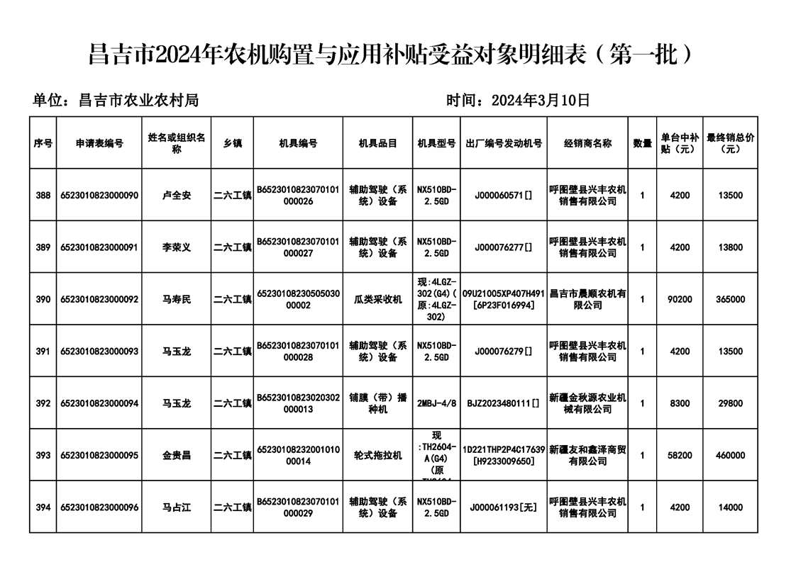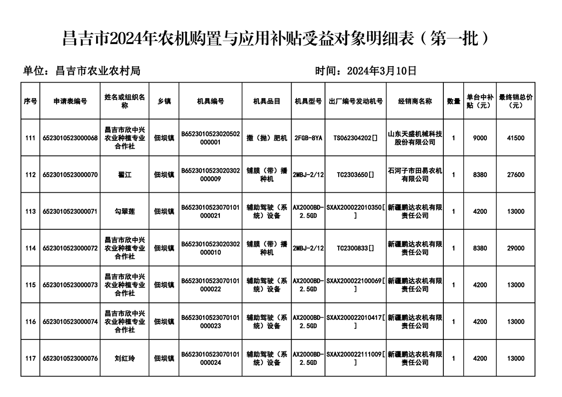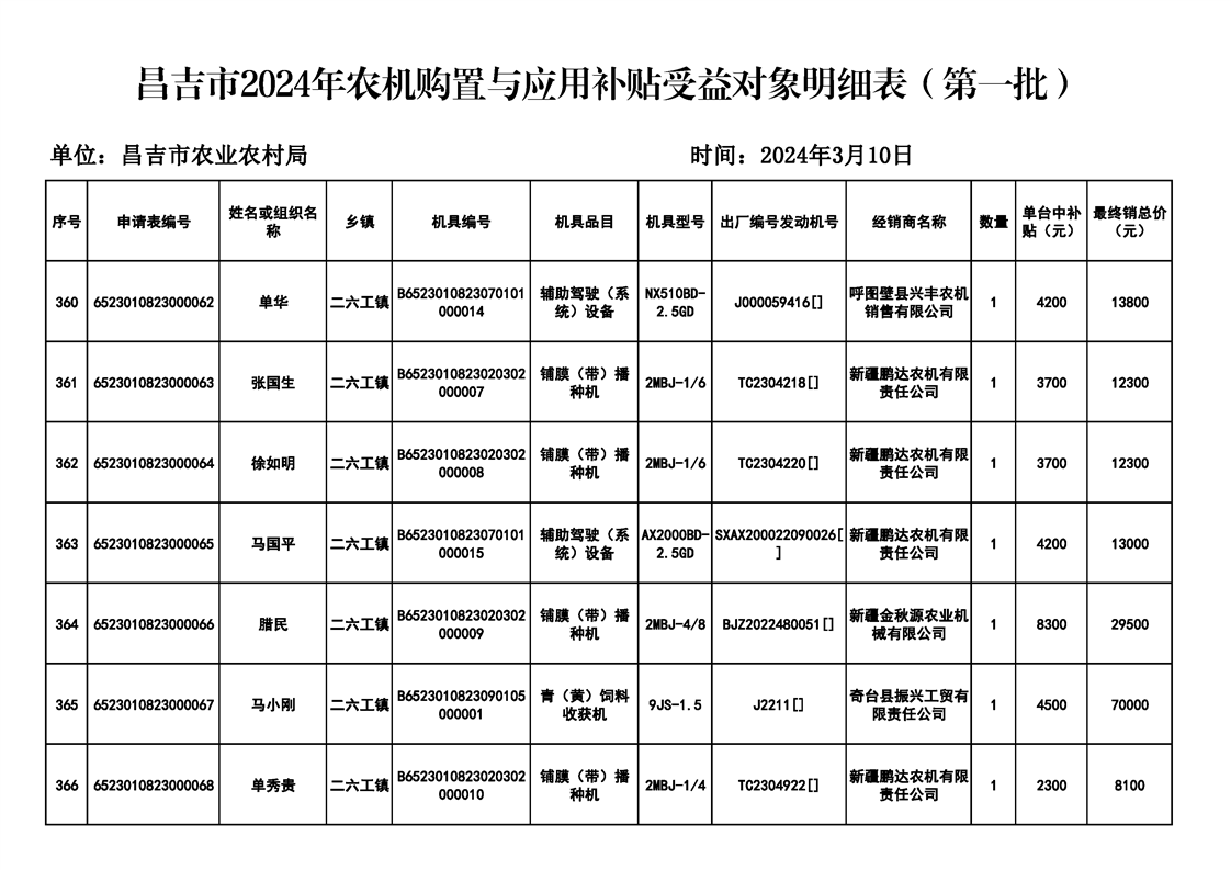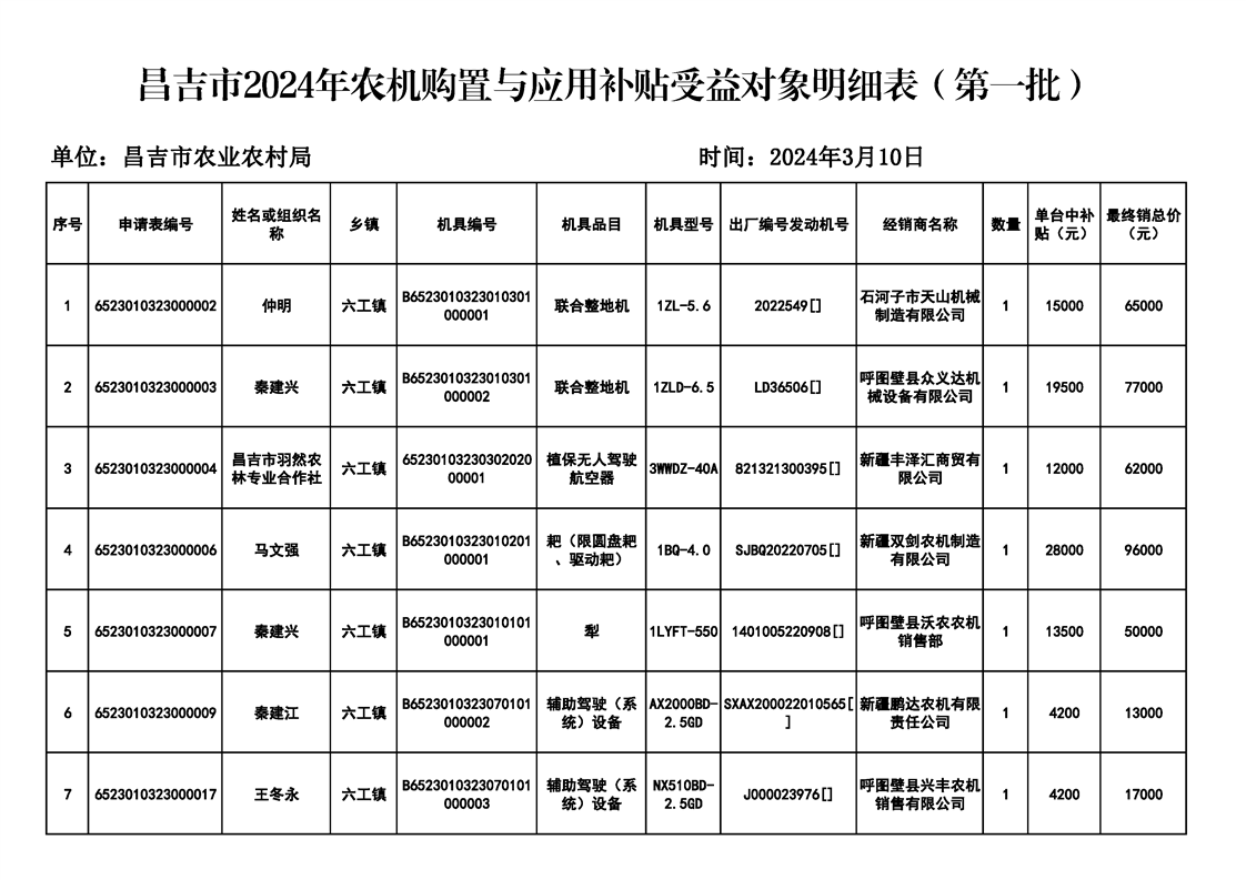 | 名 称 | 【涉农补贴结果】昌吉市2024年农机购置与应用补贴受益对象明细表(第一批) | ||