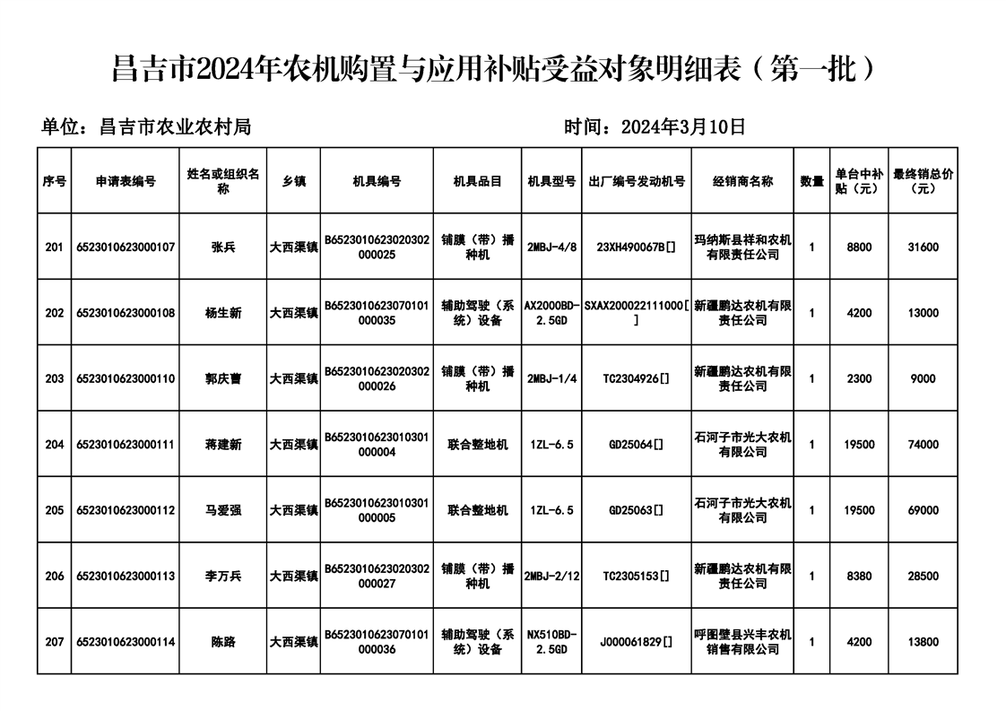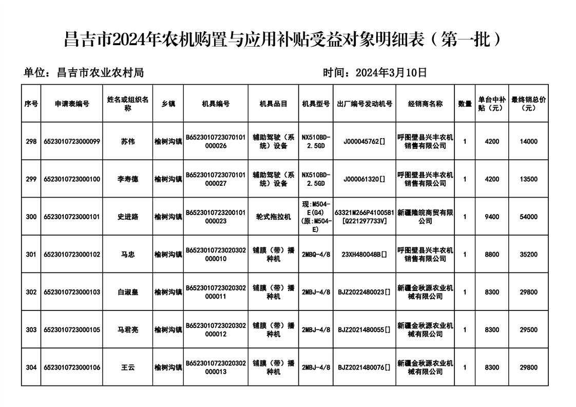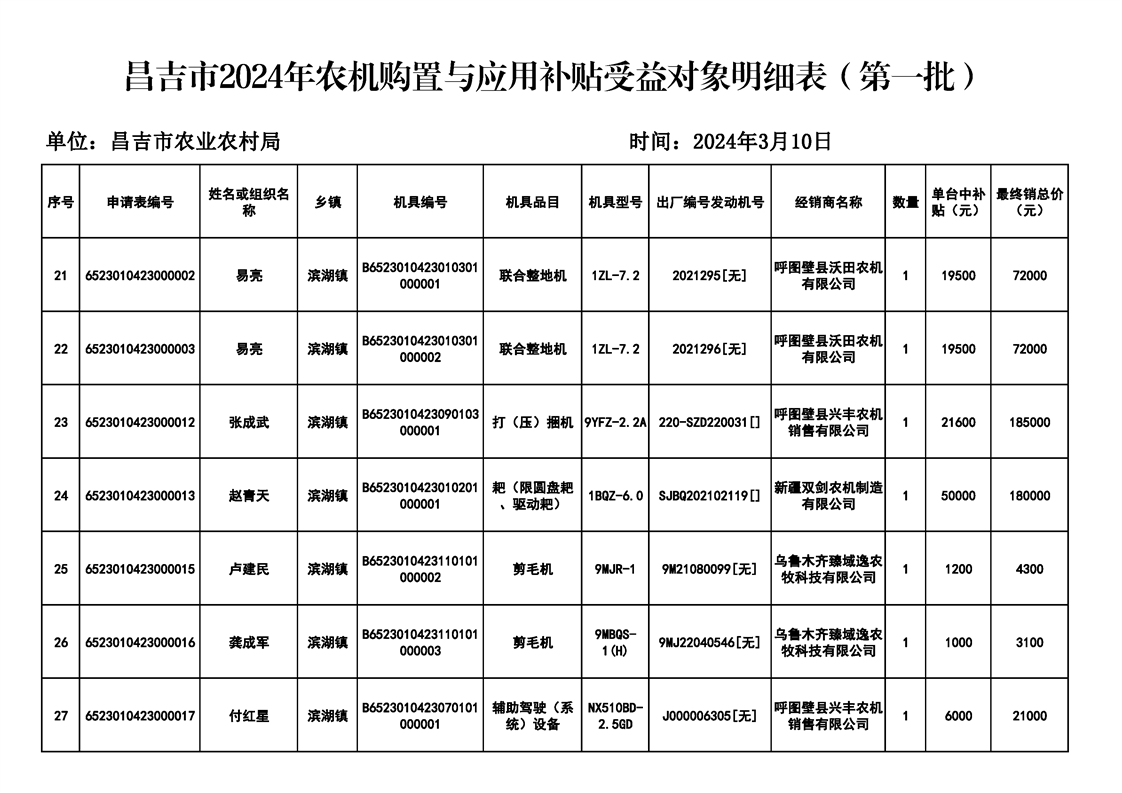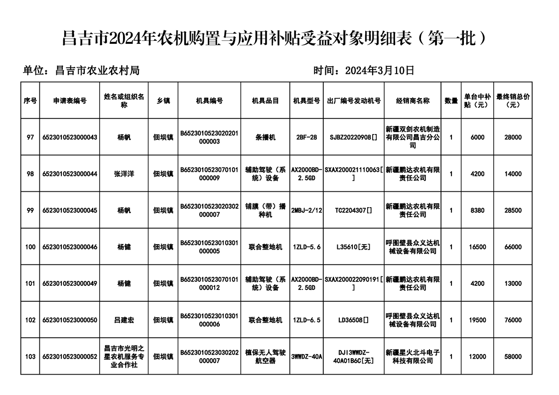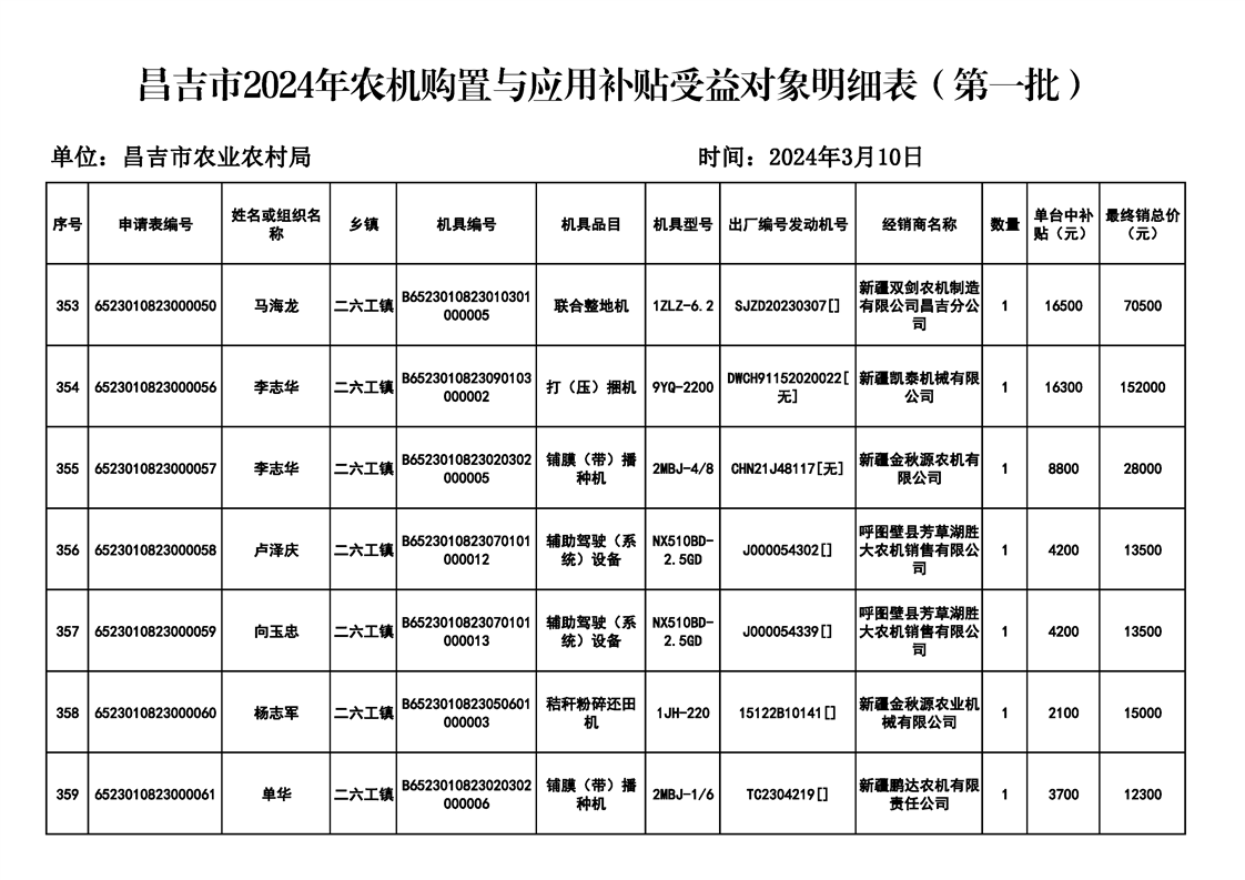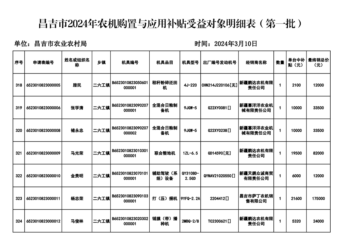 | 名 称 | 【涉农补贴结果】昌吉市2024年农机购置与应用补贴受益对象明细表(第一批) | ||