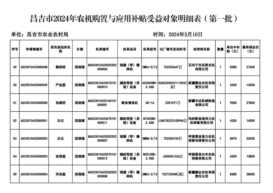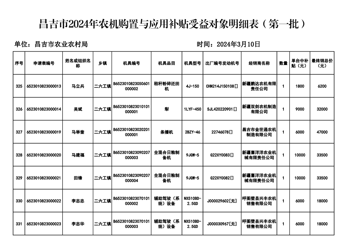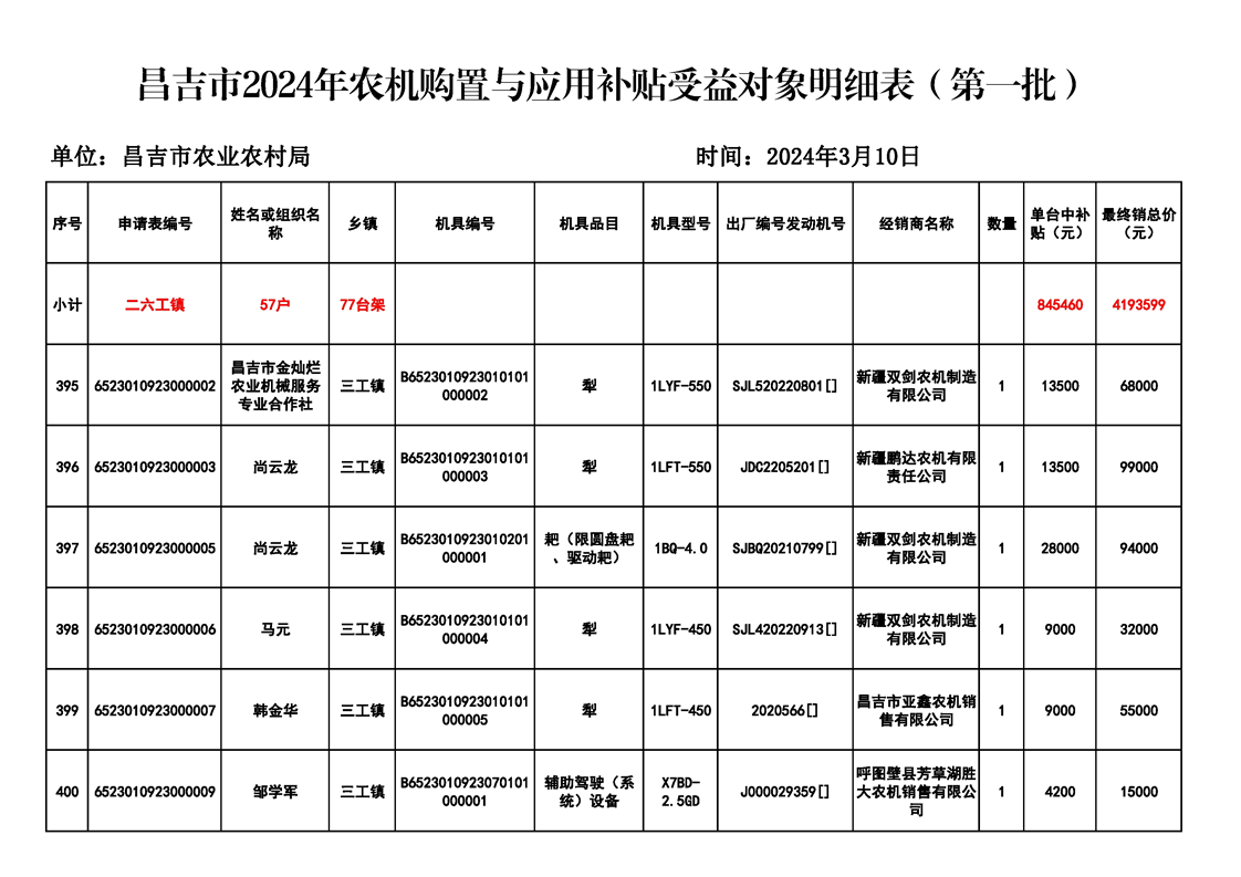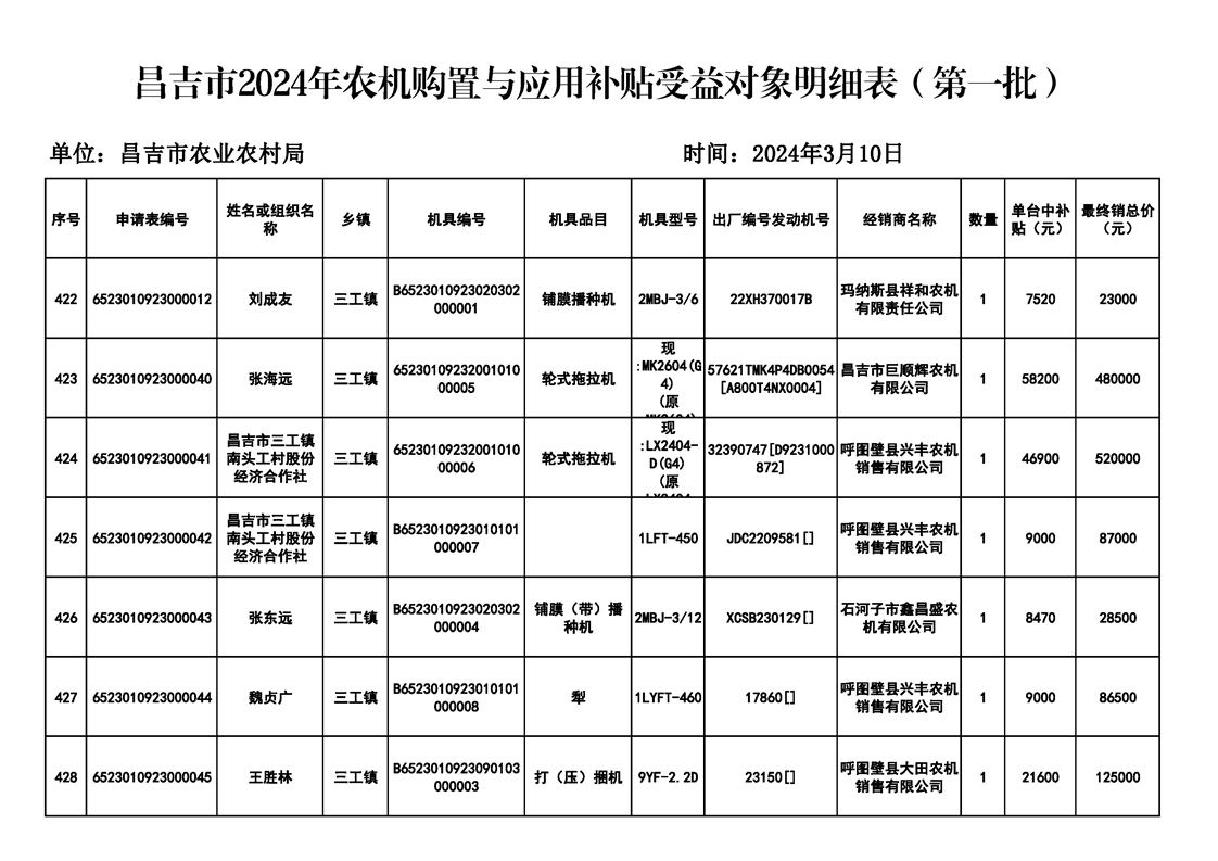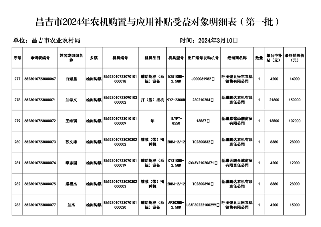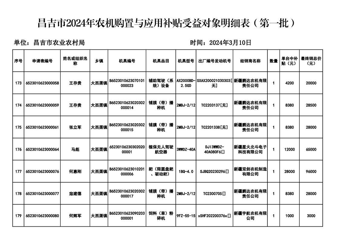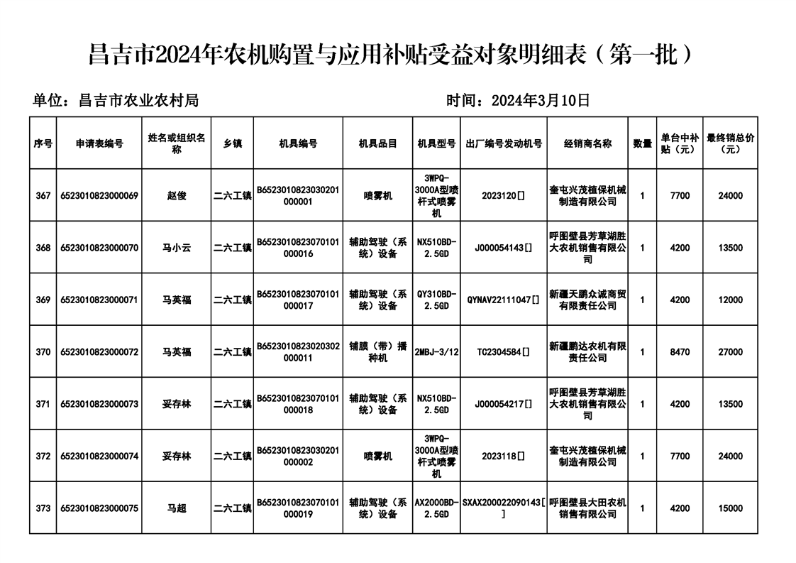 | 名 称 | 【涉农补贴结果】昌吉市2024年农机购置与应用补贴受益对象明细表(第一批) | ||