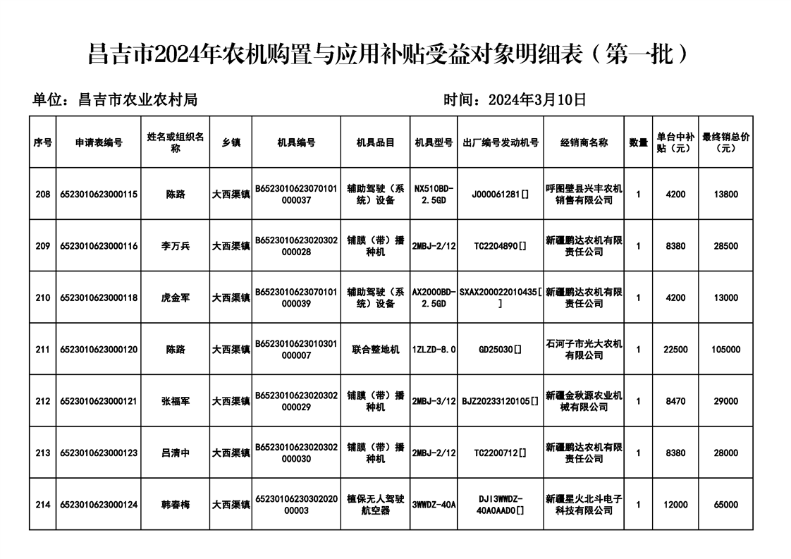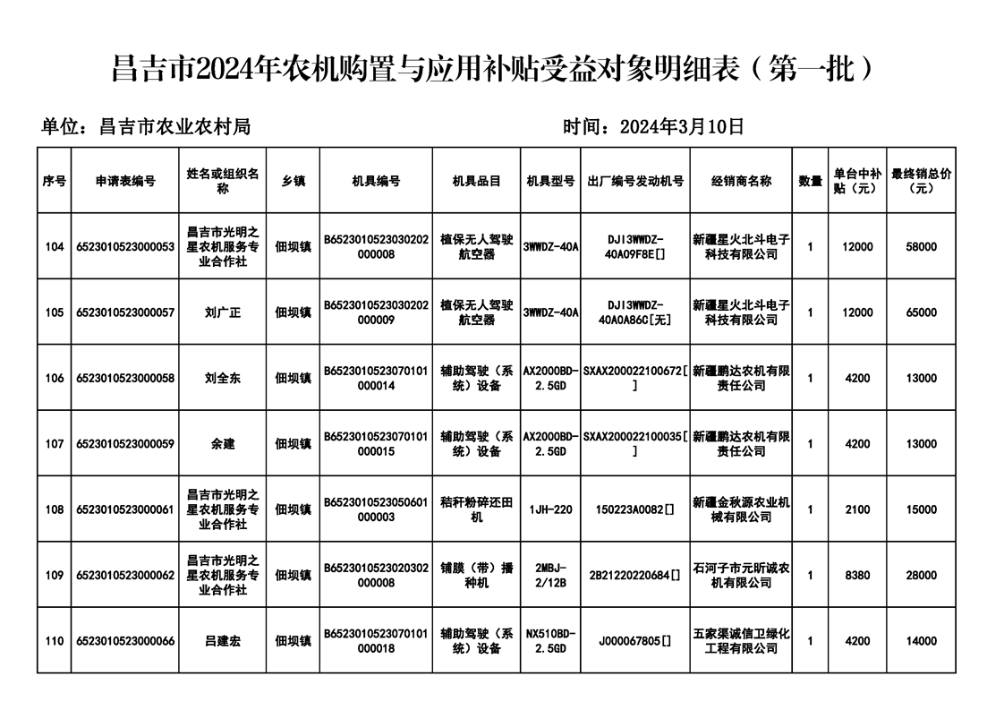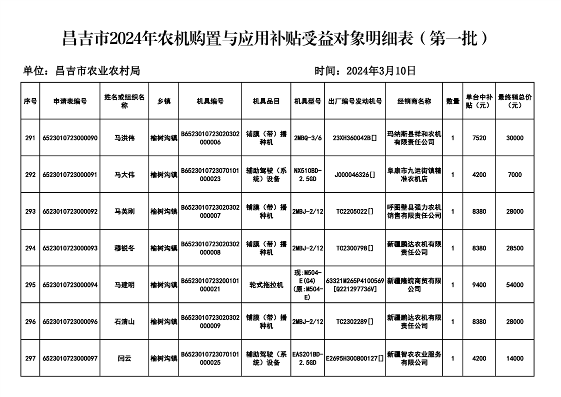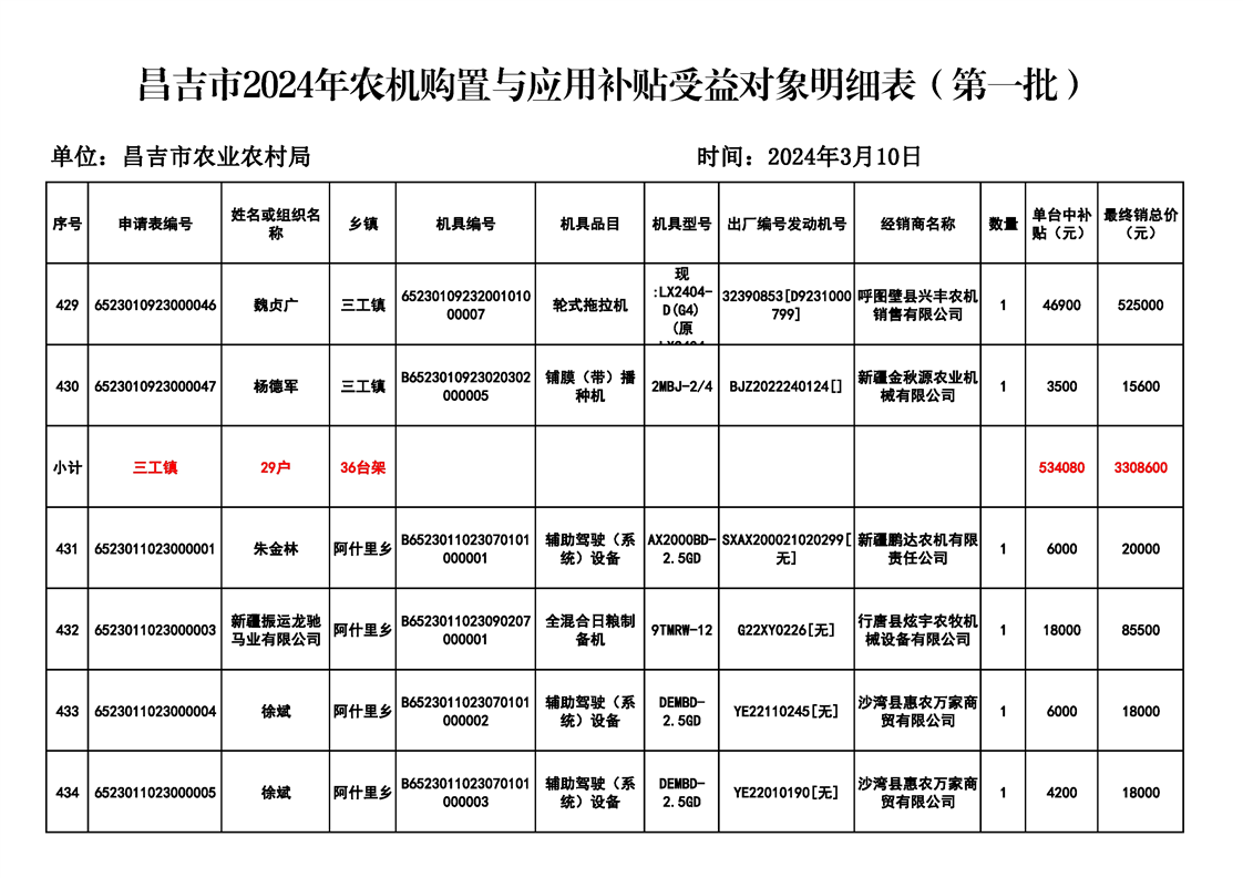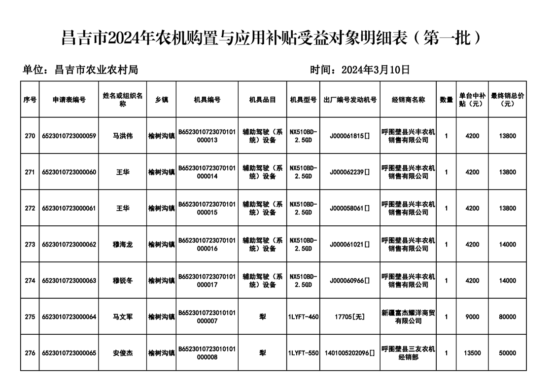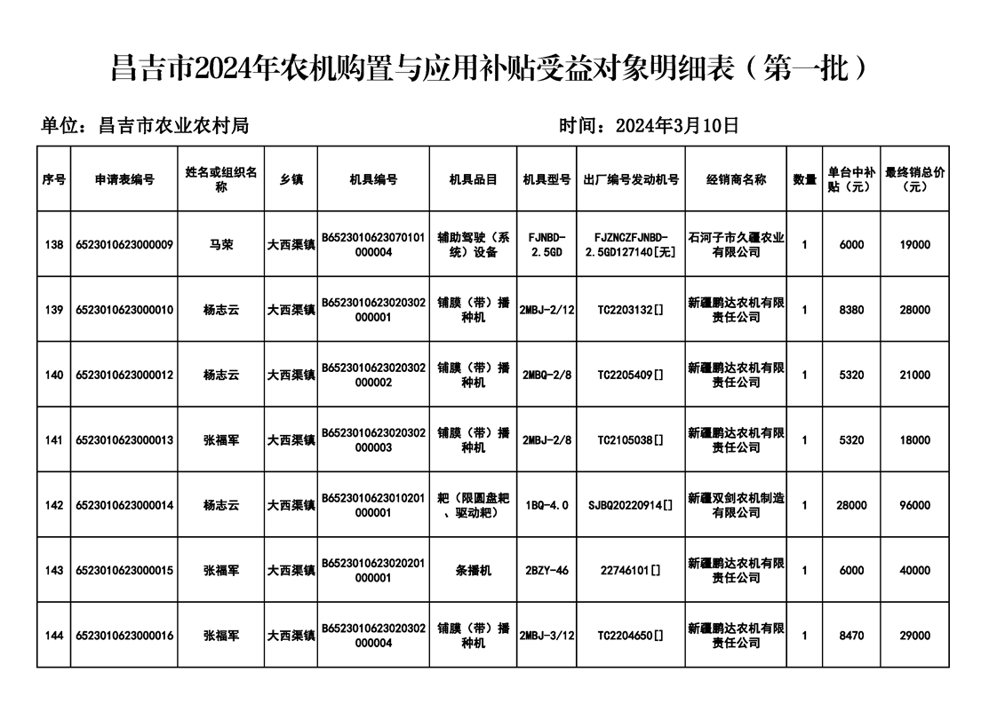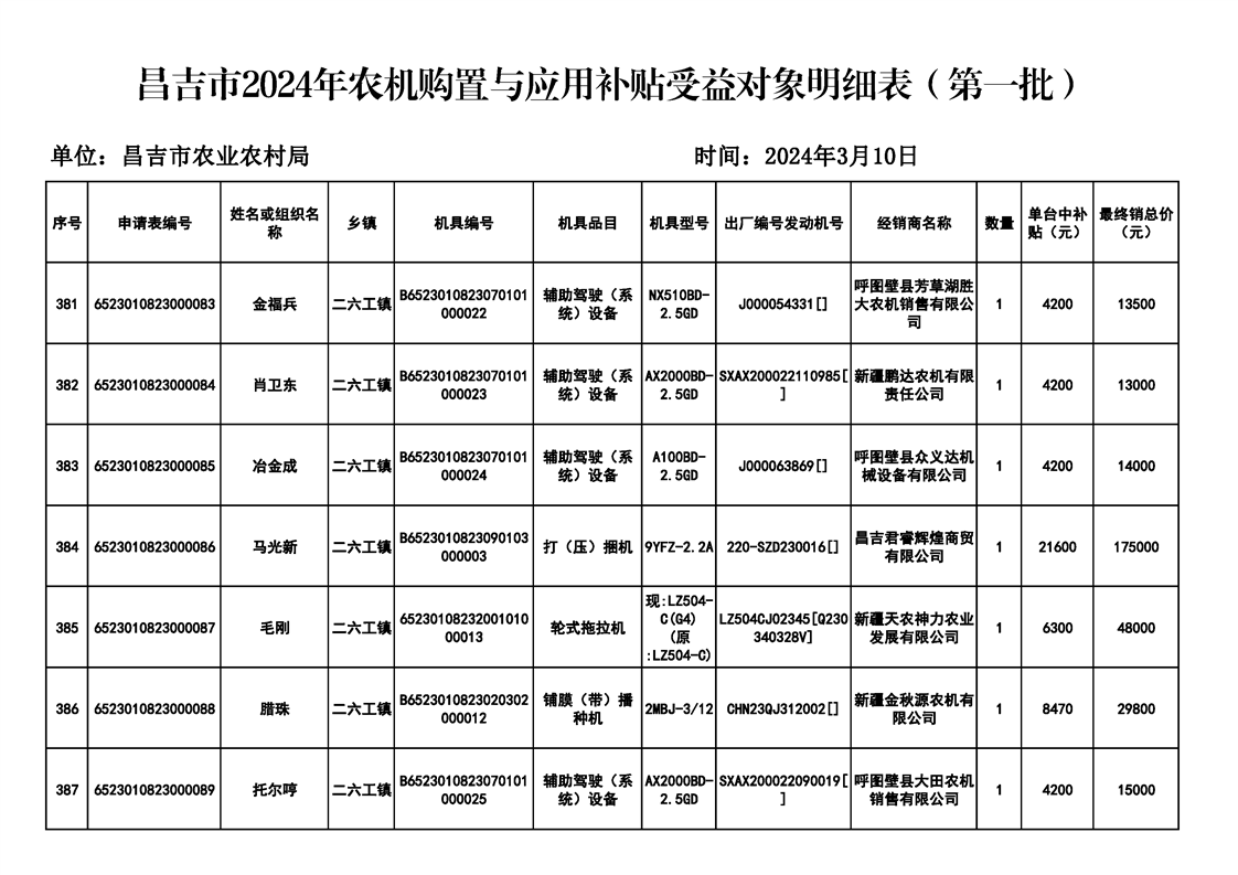 | 名 称 | 【涉农补贴结果】昌吉市2024年农机购置与应用补贴受益对象明细表(第一批) | ||