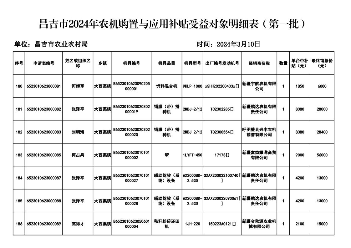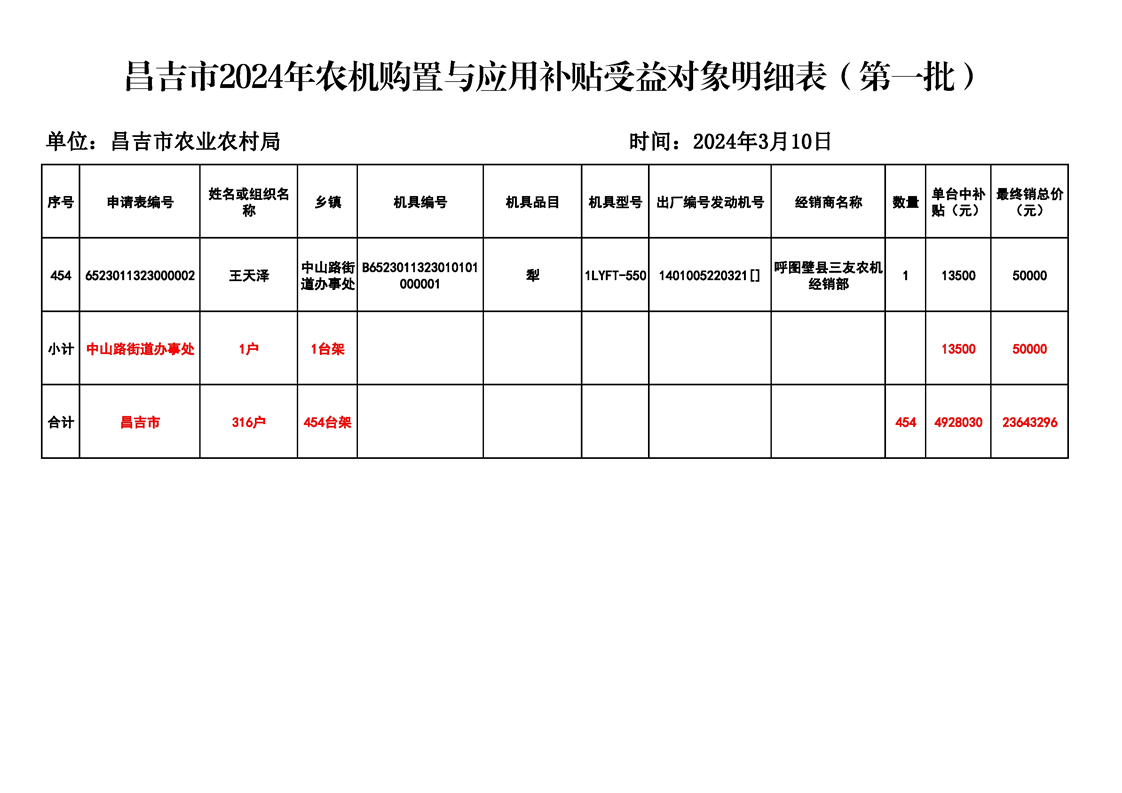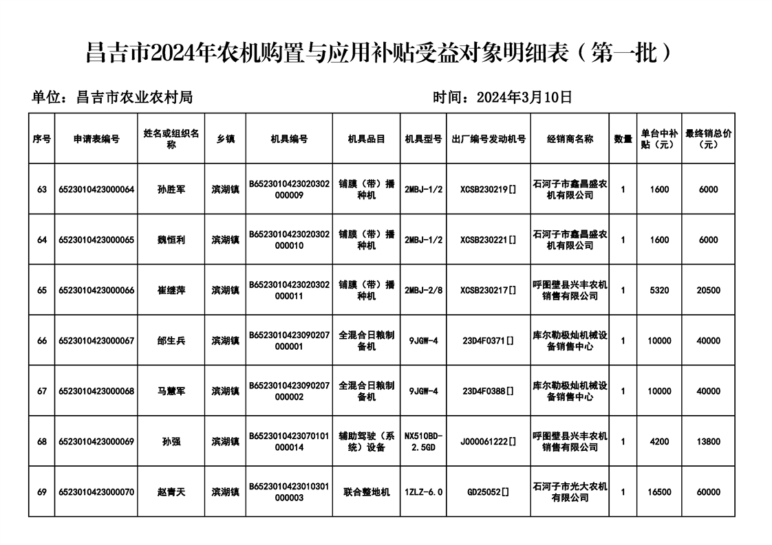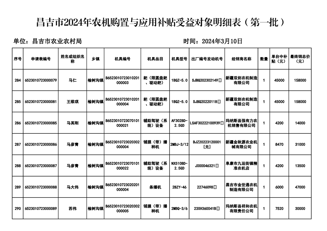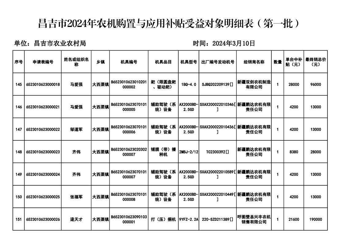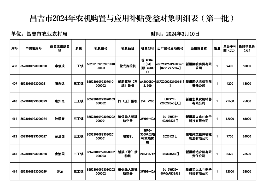 | 名 称 | 【涉农补贴结果】昌吉市2024年农机购置与应用补贴受益对象明细表(第一批) | ||