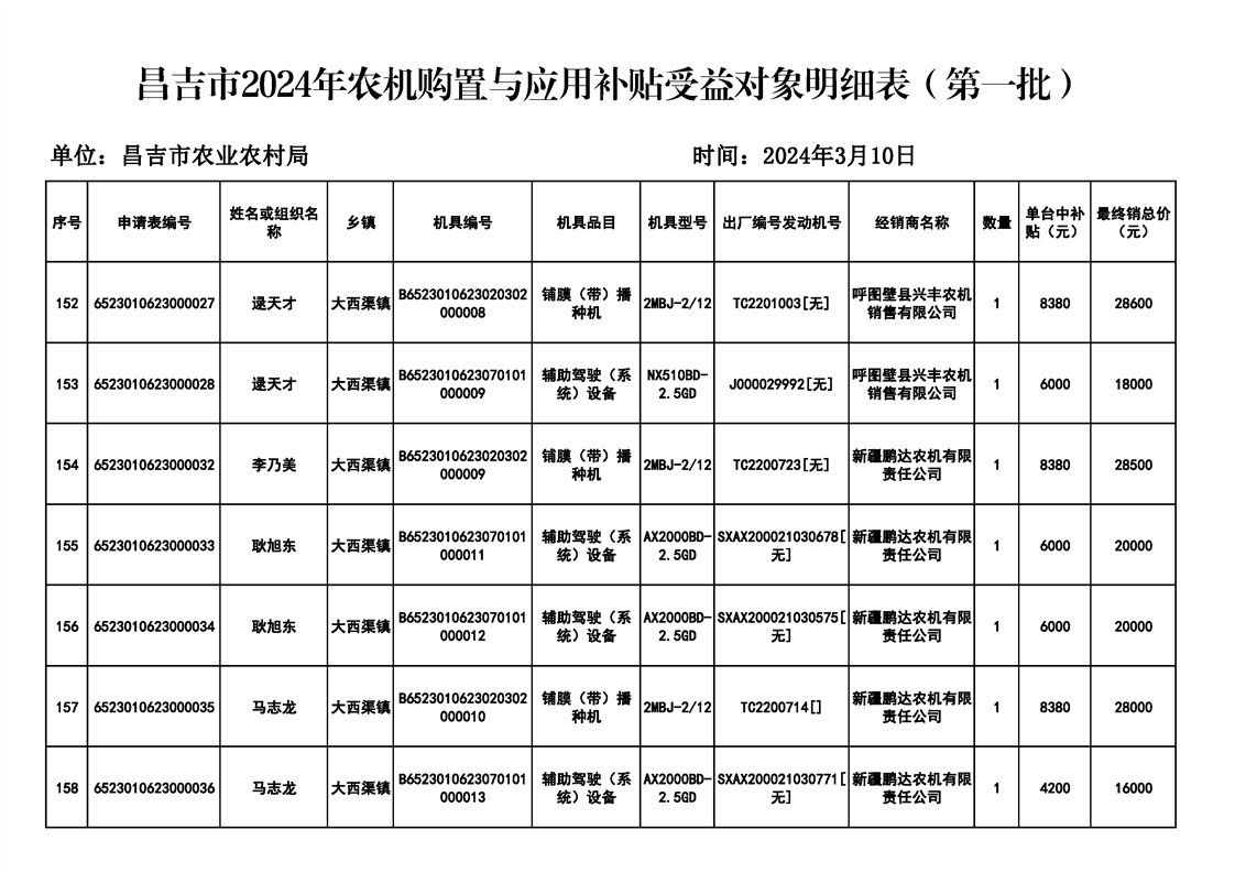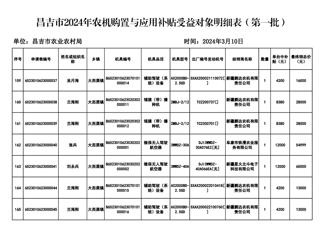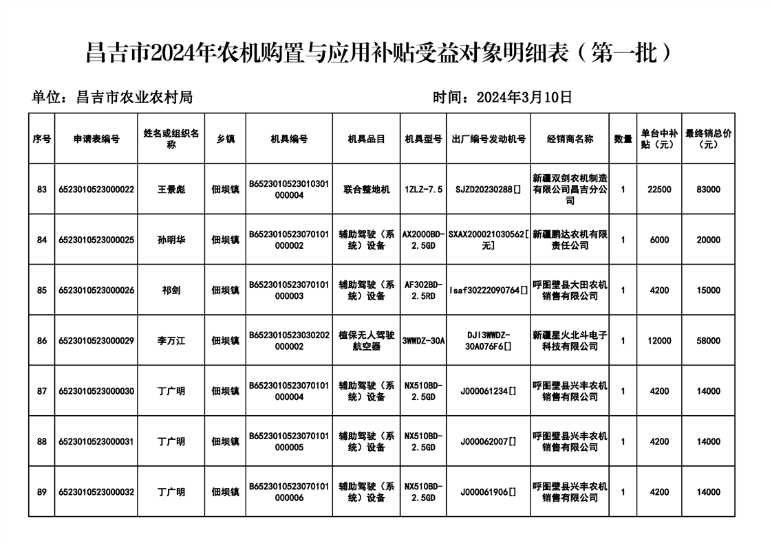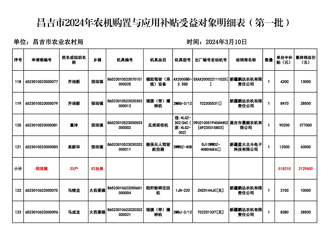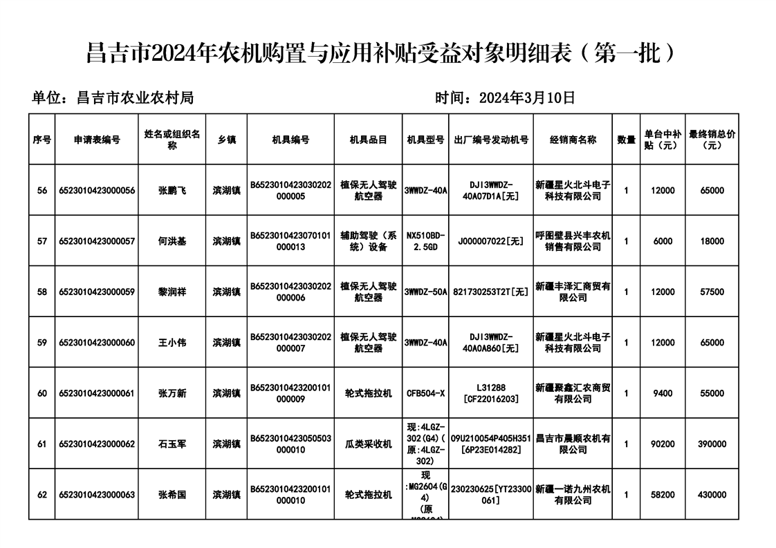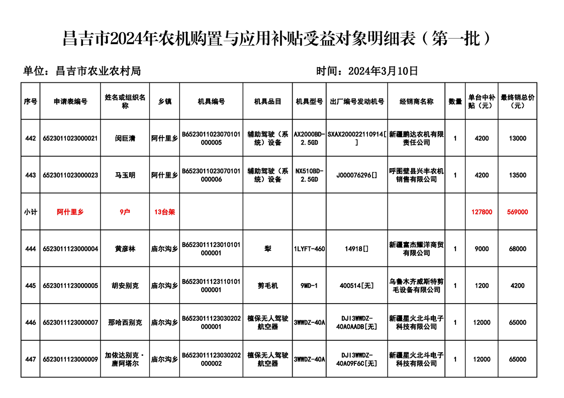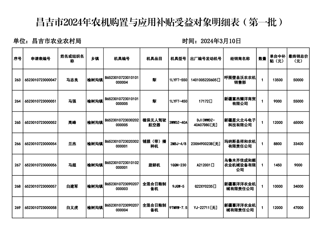 | 名 称 | 【涉农补贴结果】昌吉市2024年农机购置与应用补贴受益对象明细表(第一批) | ||
