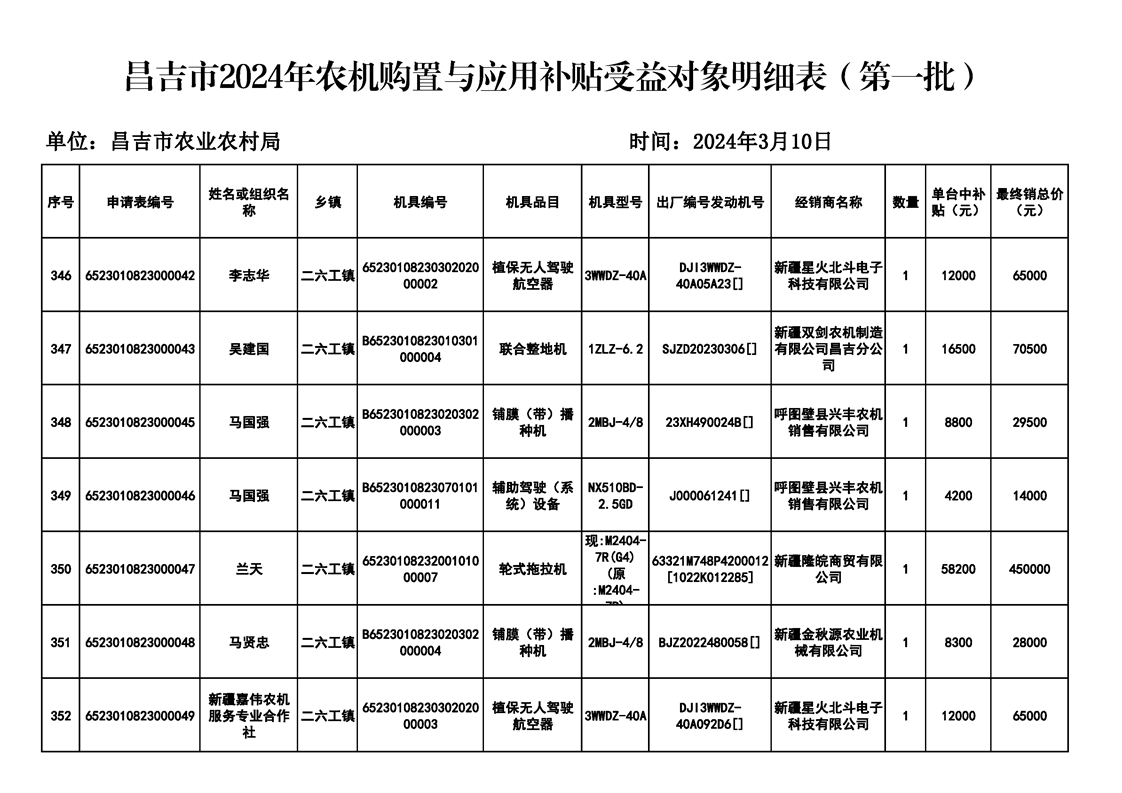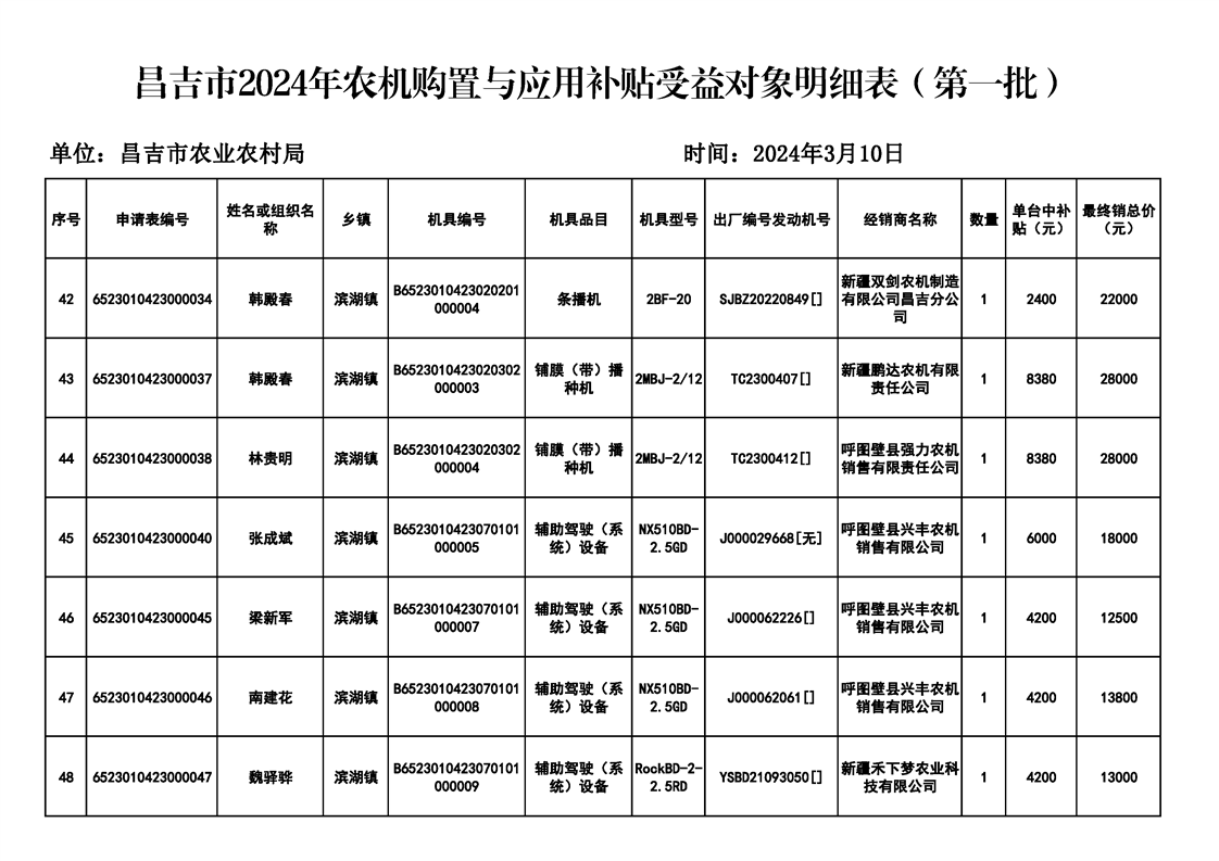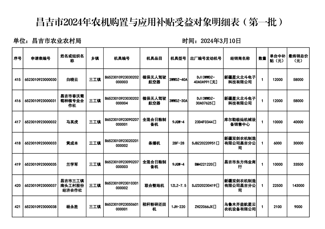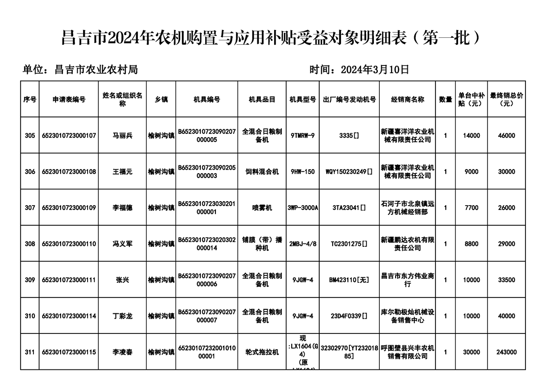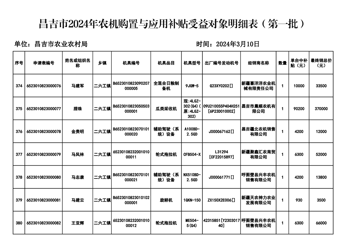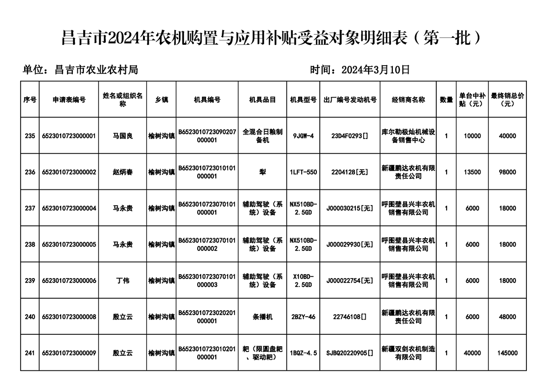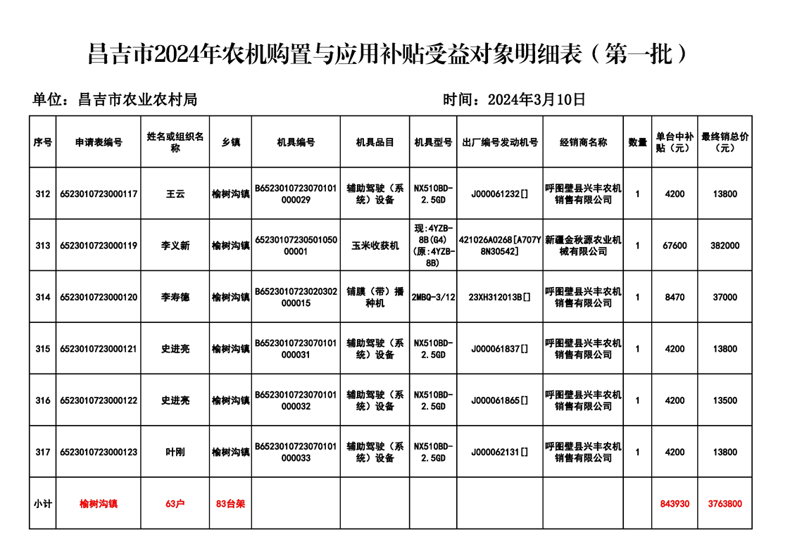| 名 称 | 【涉农补贴结果】昌吉市2024年农机购置与应用补贴受益对象明细表(第一批) | ||