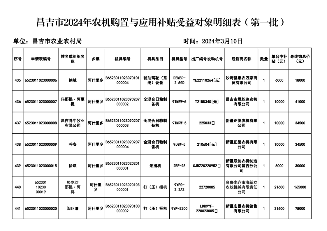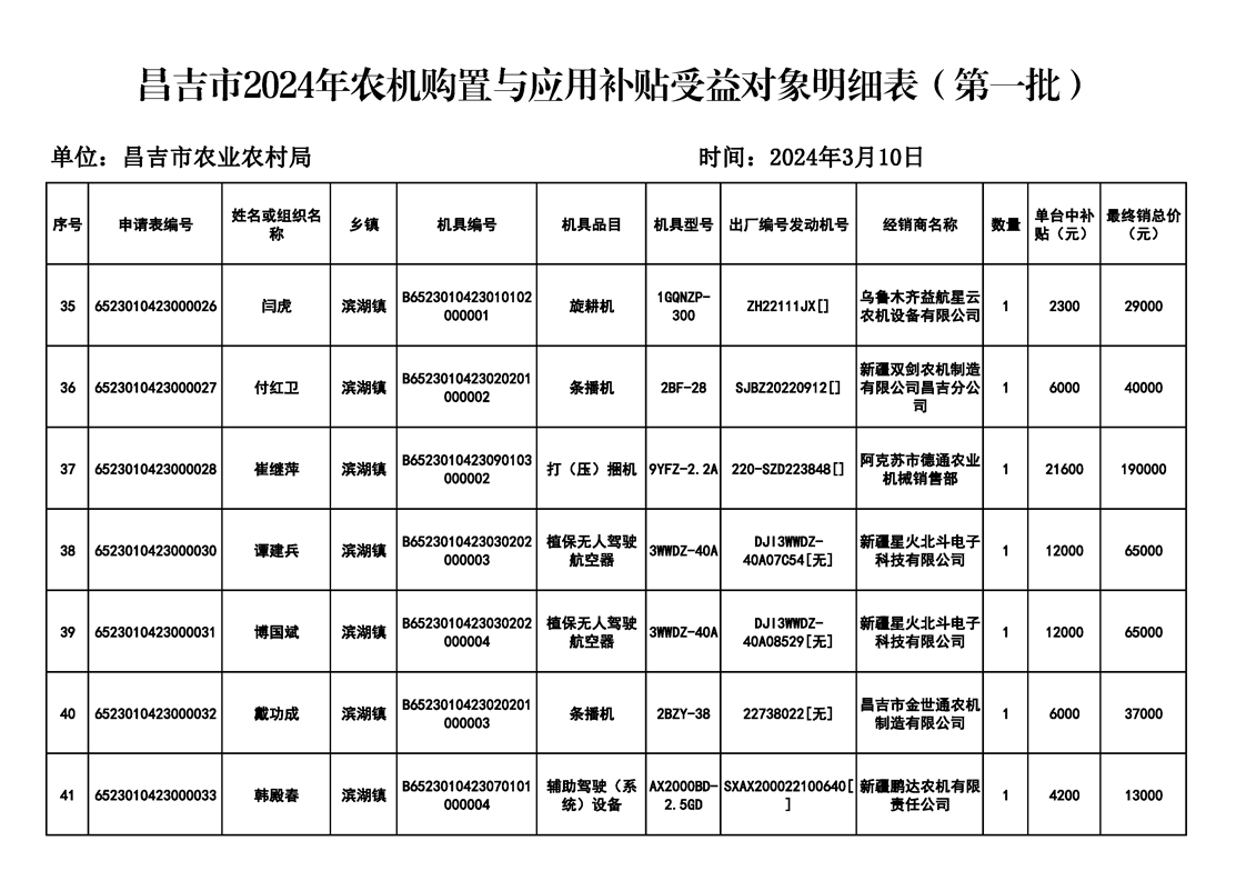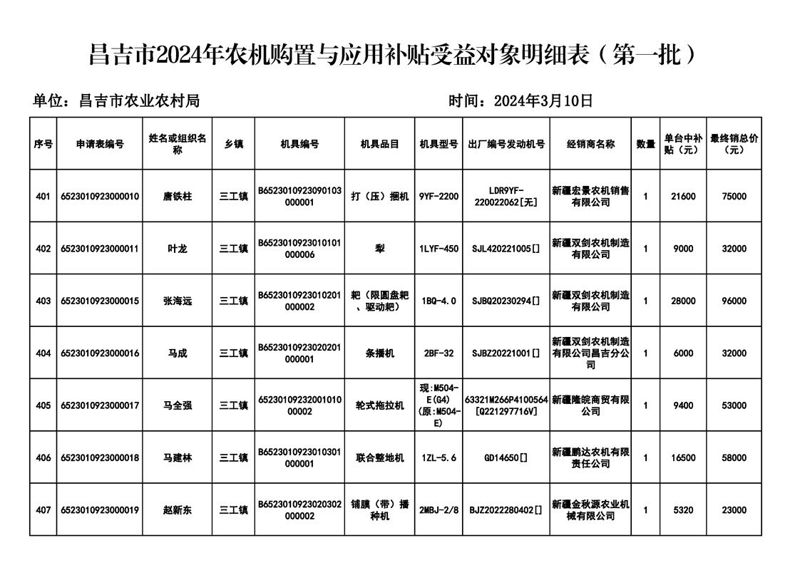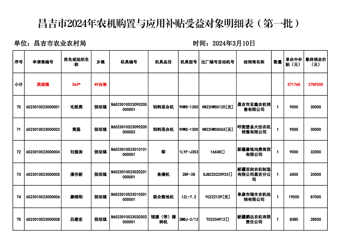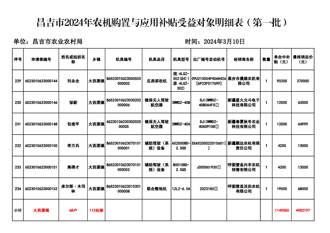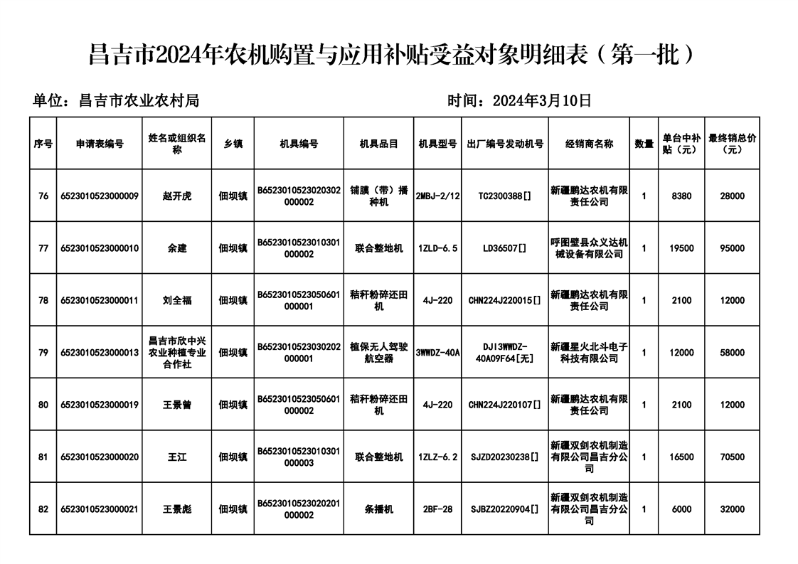 | 名 称 | 【涉农补贴结果】昌吉市2024年农机购置与应用补贴受益对象明细表(第一批) | ||
